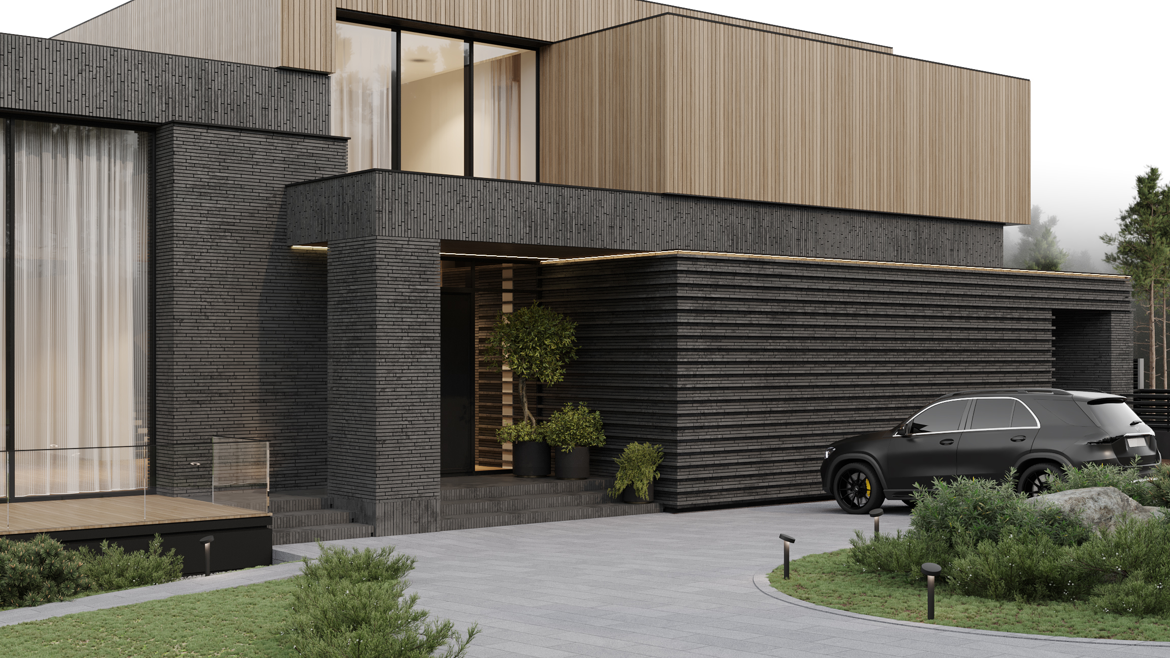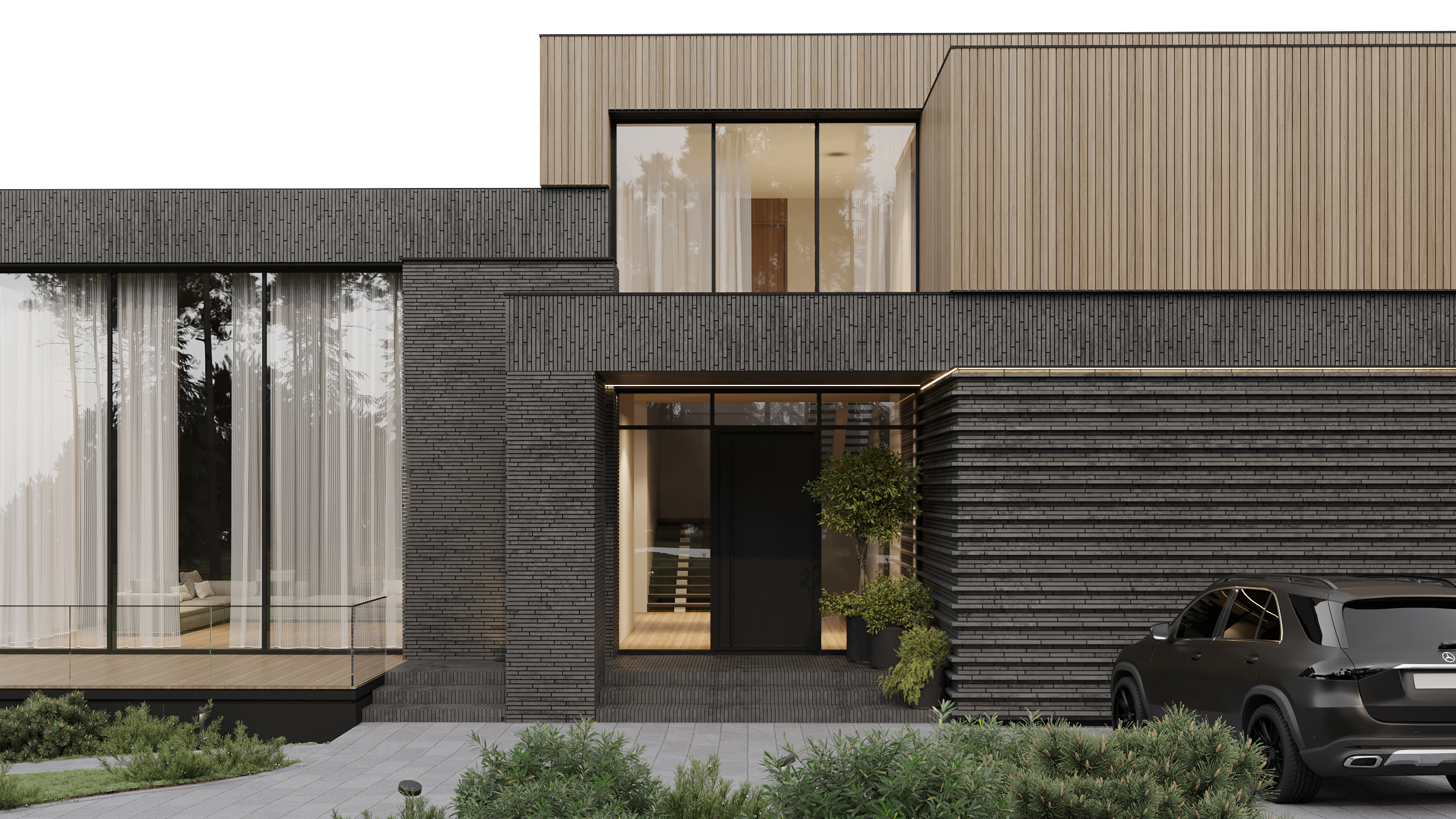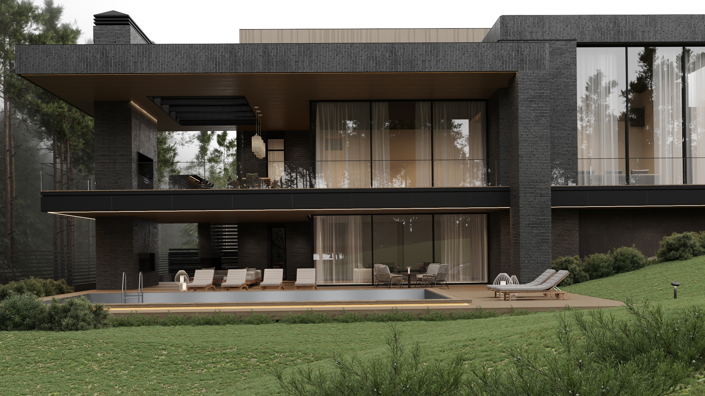 Два нижних уровня облицованы темным клинкерным кирпичом, который визуально придает дому основательность. Масштабное остекление гостиной, открывающейся на террасу с бассейном, позволяет максимально использовать естественное освещение и подчеркивает связь с природой. Верхний этаж облицован светлым деревом, создавая эффект визуальной легкости и многоплановости. Это решение добавляет динамики общей композиции. Светлое дерево также применено в отделке террасы и потолочного перекрытия, объединяя разные уровни в единое целое. Фасадные материалы гармонично переходят в интерьер, создавая целостный образ архитектуры и внутреннего пространства. Кирпичная отделка каминной зоны на террасе перекликается с фасадом, а природные оттенки гармонируют с окружающей природой.