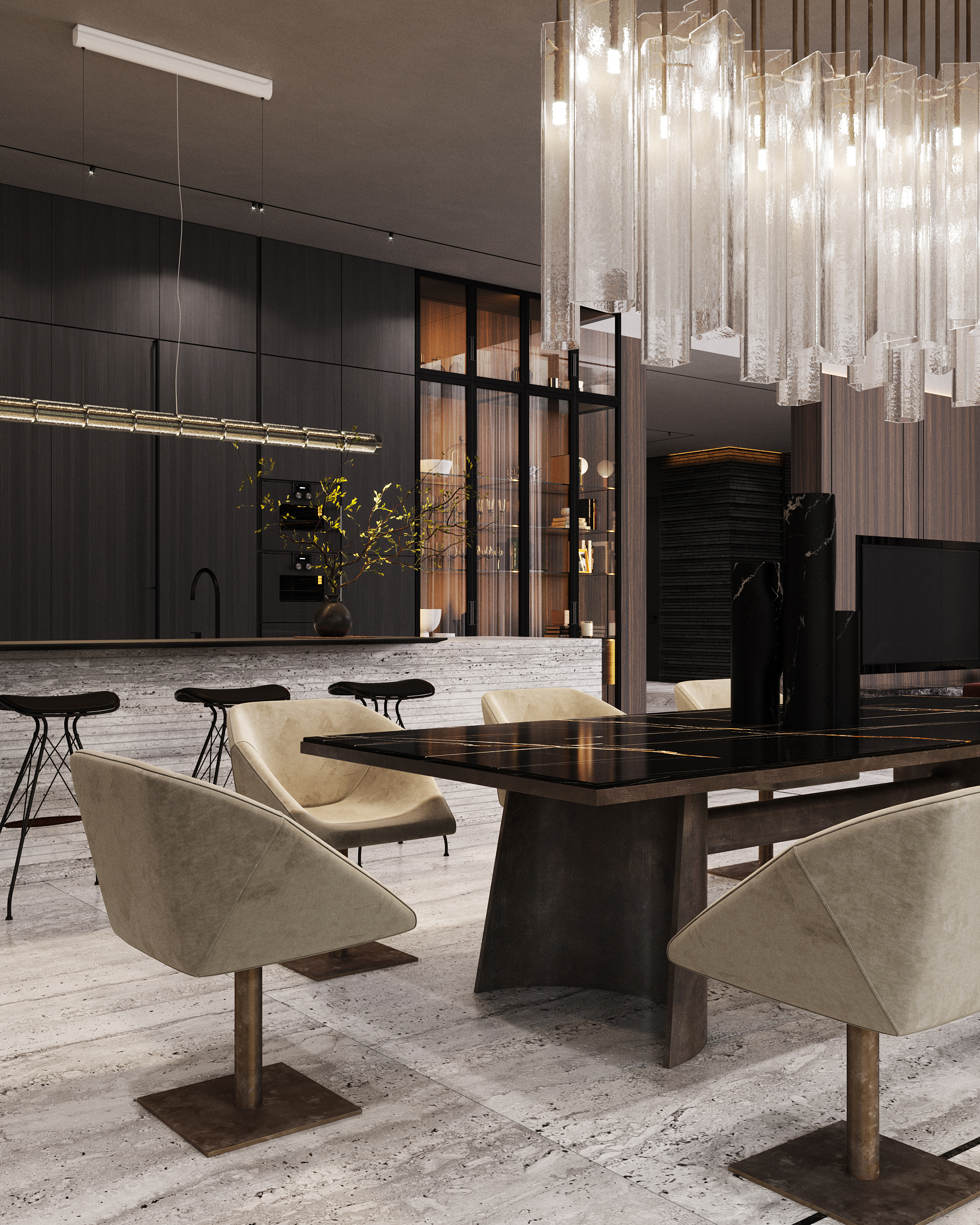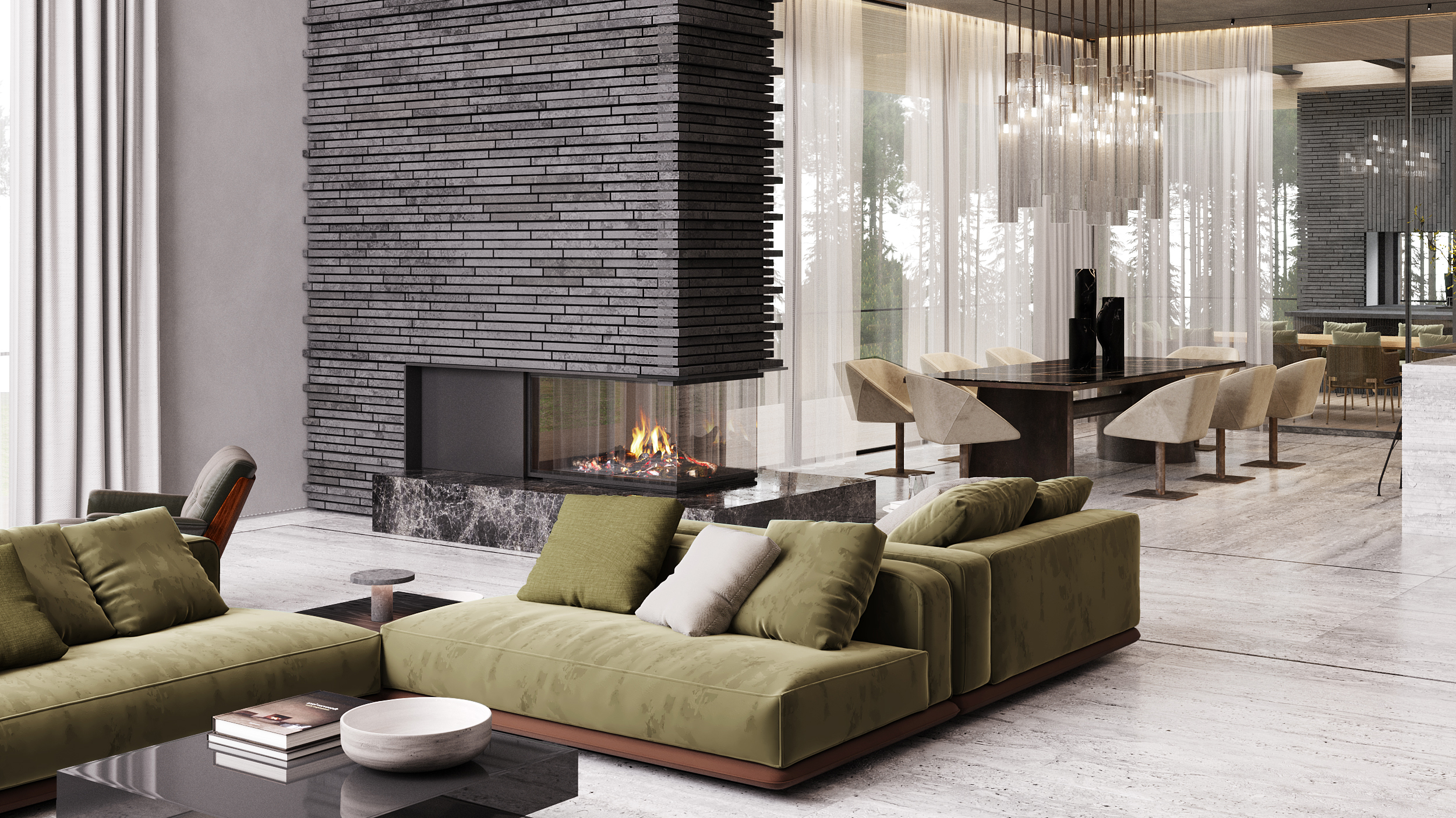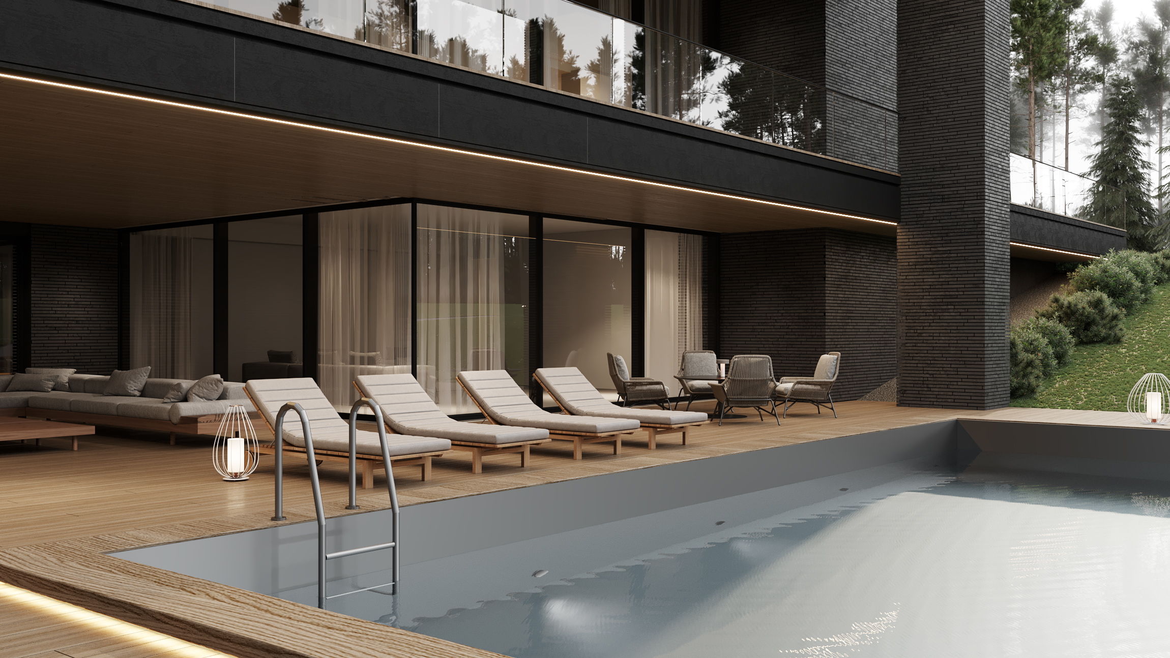 Два нижних уровня облицованы темным клинкерным кирпичом, который визуально придает дому основательность. Масштабное остекление гостиной, открывающейся на террасу с бассейном, позволяет максимально использовать естественное освещение и подчеркивает связь с природой. Верхний этаж облицован светлым деревом, создавая эффект визуальной легкости и многоплановости. Это решение добавляет динамики общей композиции. Светлое дерево также применено в отделке террасы и потолочного перекрытия, объединяя разные уровни в единое целое. Фасадные материалы гармонично переходят в интерьер, создавая целостный образ архитектуры и внутреннего пространства. Кирпичная отделка каминной зоны на террасе перекликается с фасадом, а природные оттенки гармонируют с окружающей природой.