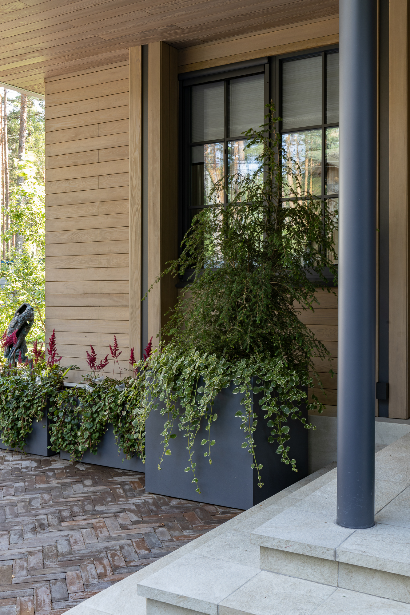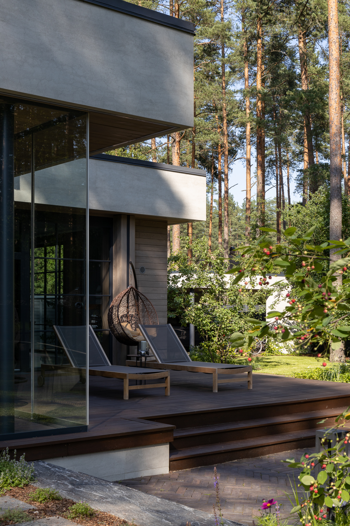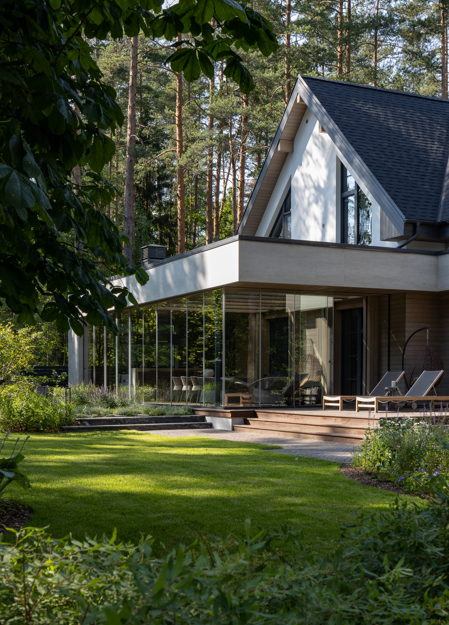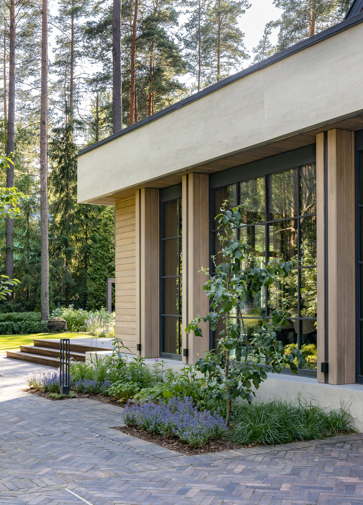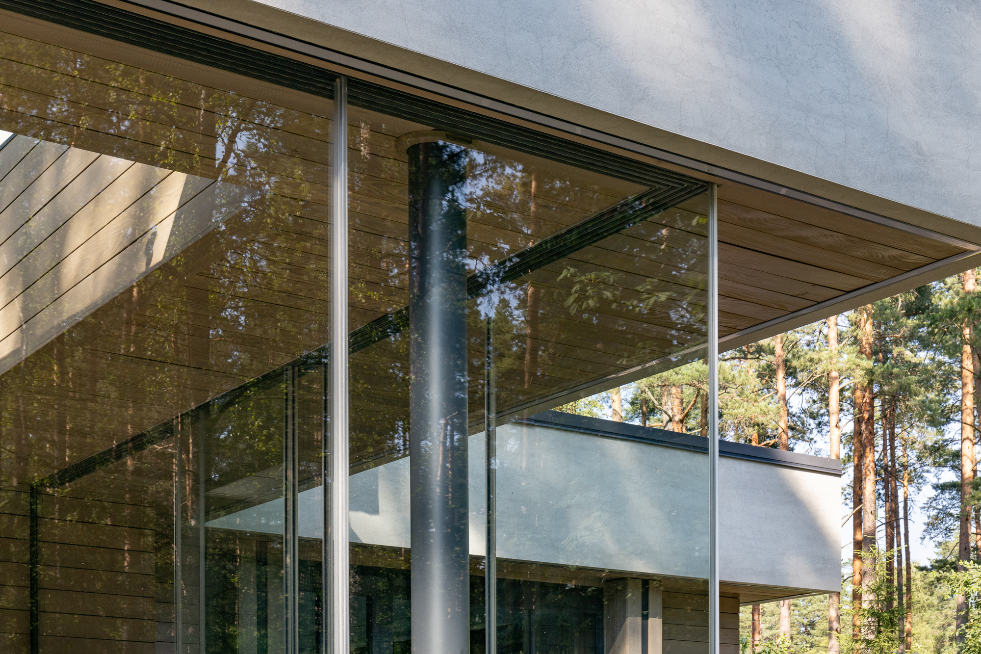 Результатом реконструкции стала просторная терраса с зонами барбекю и отдыха, ориентированная на живописный травяной сад и сосновый бор. К дому пристроена просторная кухня-столовая с выходом на террасу. Первый этаж занимает общественная зона и мастер блок, на втором этаже расположены каминная, гостевая спальня, детская и кабинет. Для облицовки фасадов использован широкоформатный керамогранит и планкен из термоясеня сложного пыльно-бежевого оттенка. Цветовая гамма фасадов гармонично сочетается с окружающей природой: сложное серо-дымчатое сочетание отделок словно растворяется на фоне величественных сосен. Двускатная кровля была отреставрирована, а покрытие крыши заменено на новое.