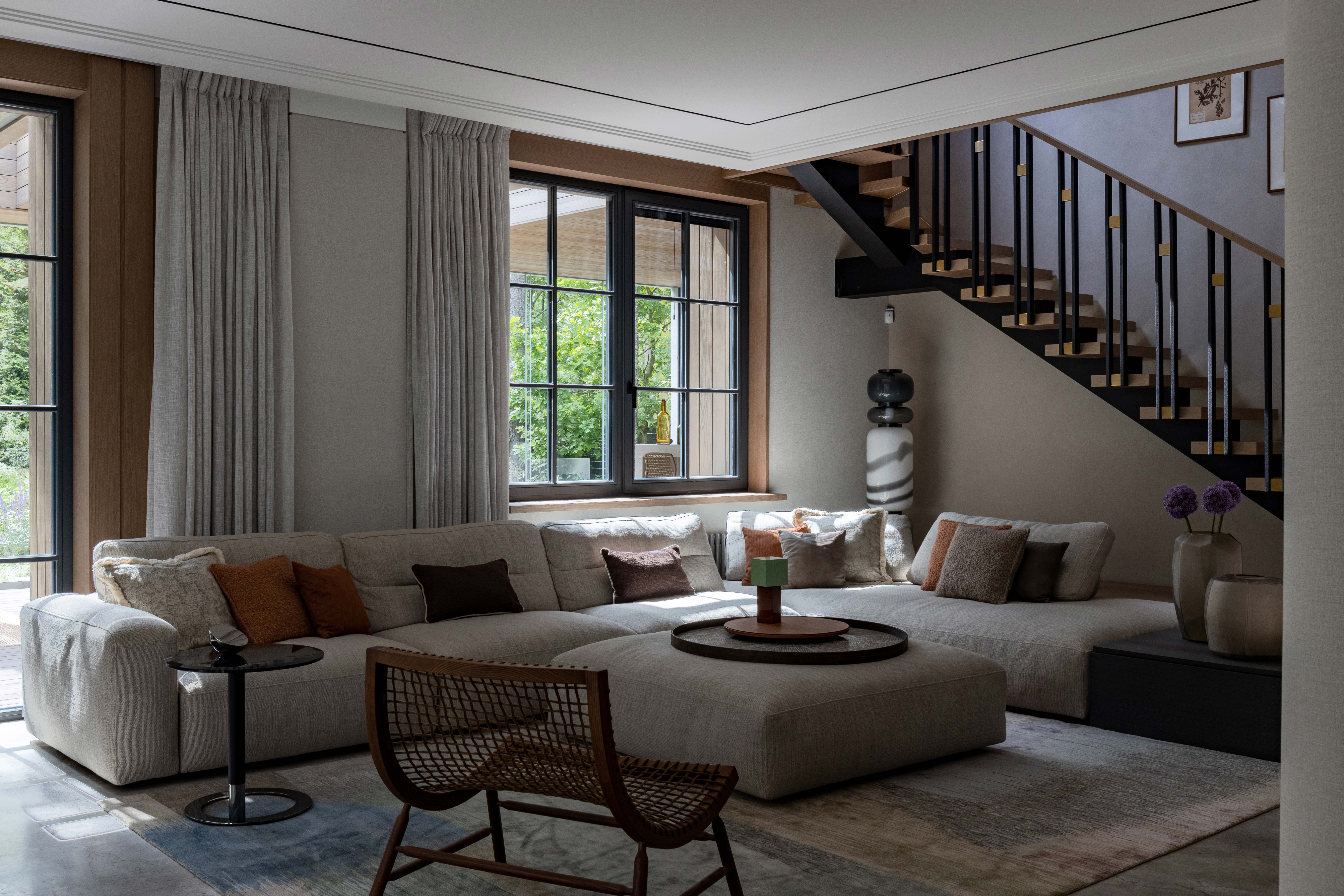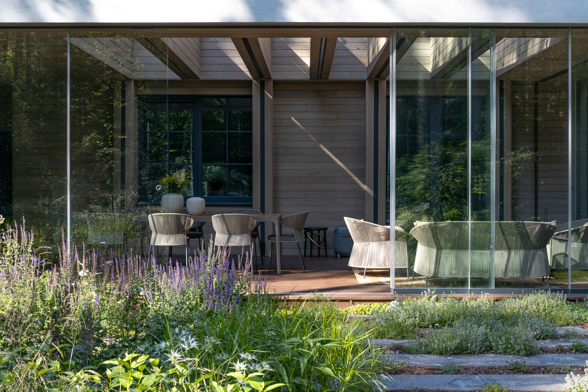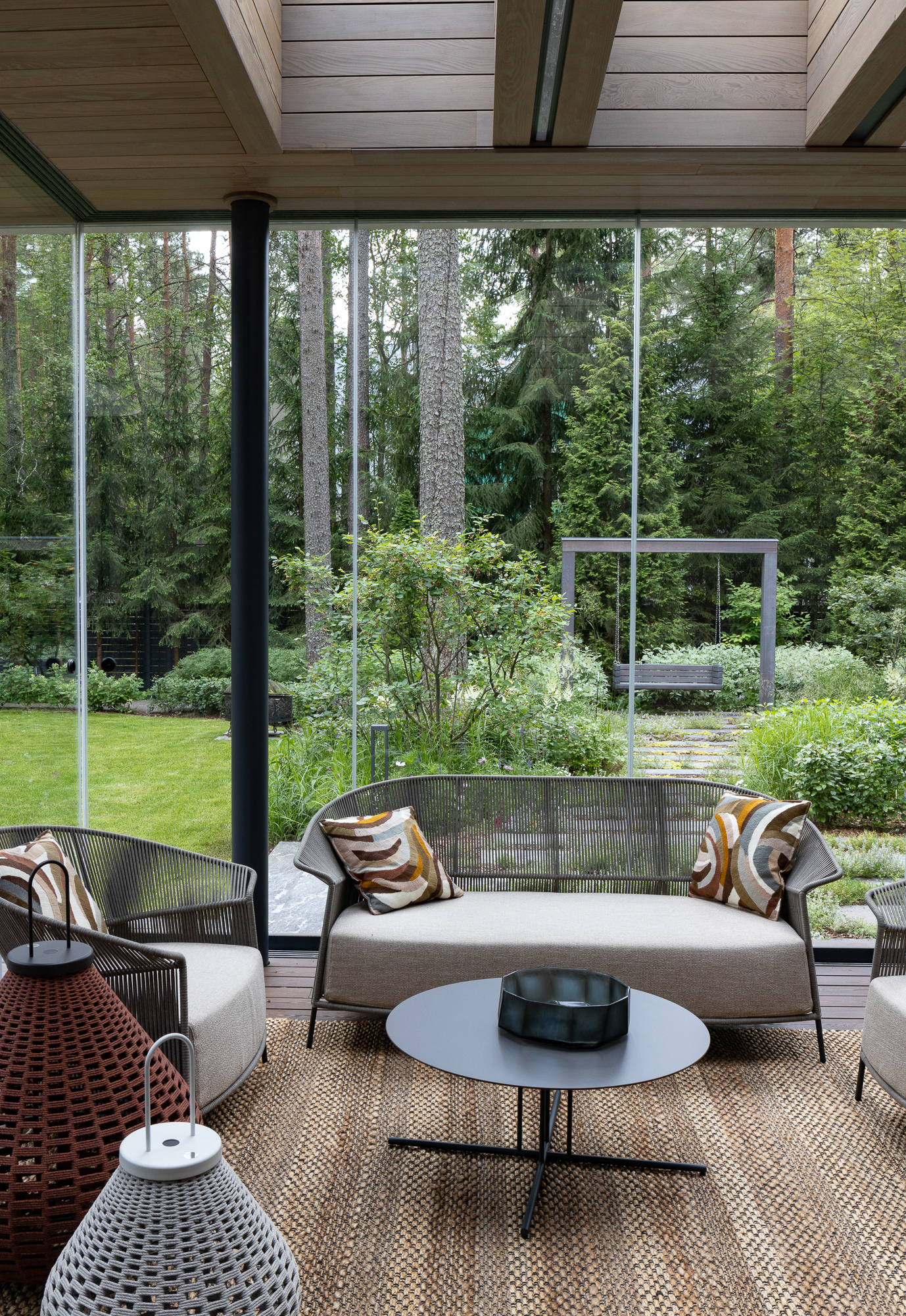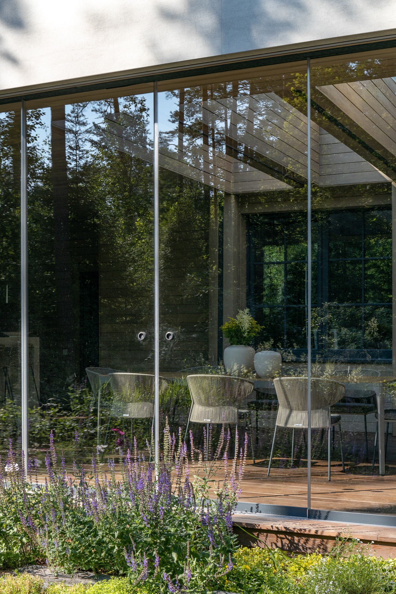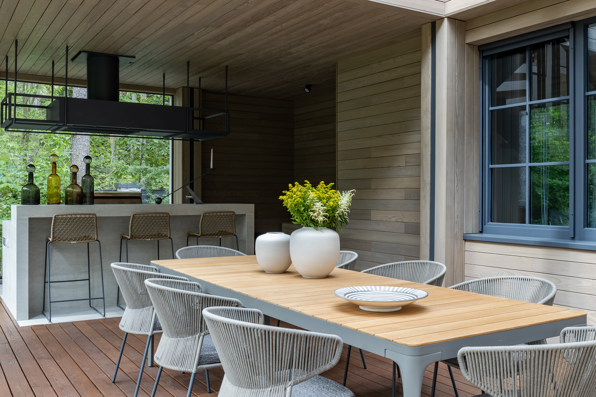 Результатом реконструкции стала просторная терраса с зонами барбекю и отдыха, ориентированная на живописный травяной сад и сосновый бор. К дому пристроена просторная кухня-столовая с выходом на террасу. Первый этаж занимает общественная зона и мастер блок, на втором этаже расположены каминная, гостевая спальня, детская и кабинет. Для облицовки фасадов использован широкоформатный керамогранит и планкен из термоясеня сложного пыльно-бежевого оттенка. Цветовая гамма фасадов гармонично сочетается с окружающей природой: сложное серо-дымчатое сочетание отделок словно растворяется на фоне величественных сосен. Двускатная кровля была отреставрирована, а покрытие крыши заменено на новое.