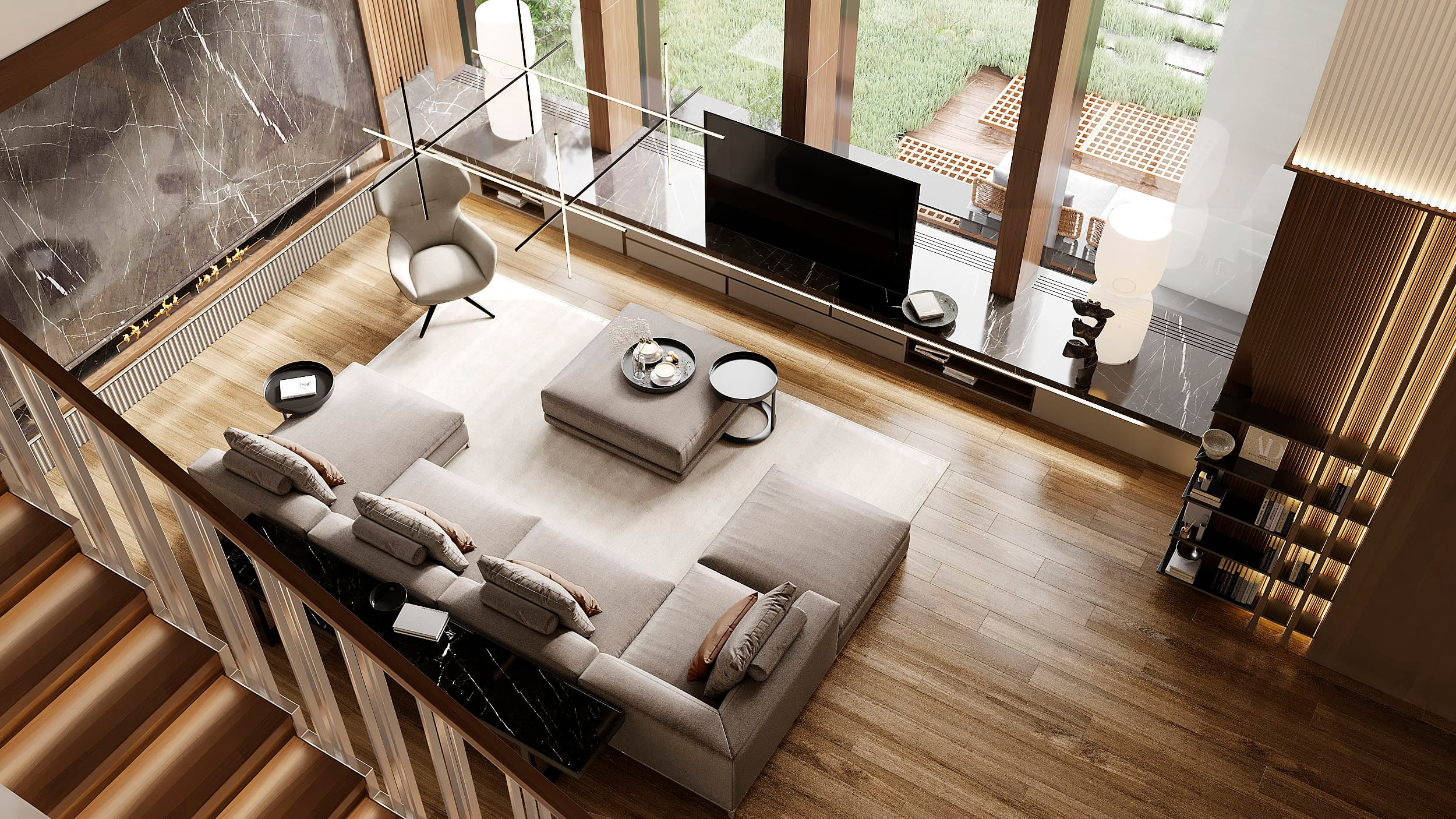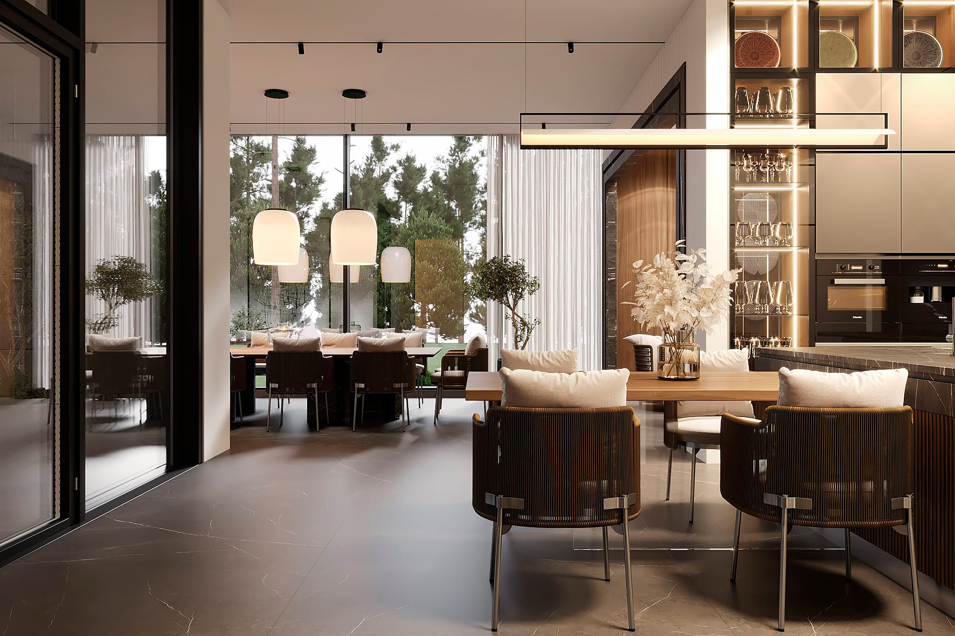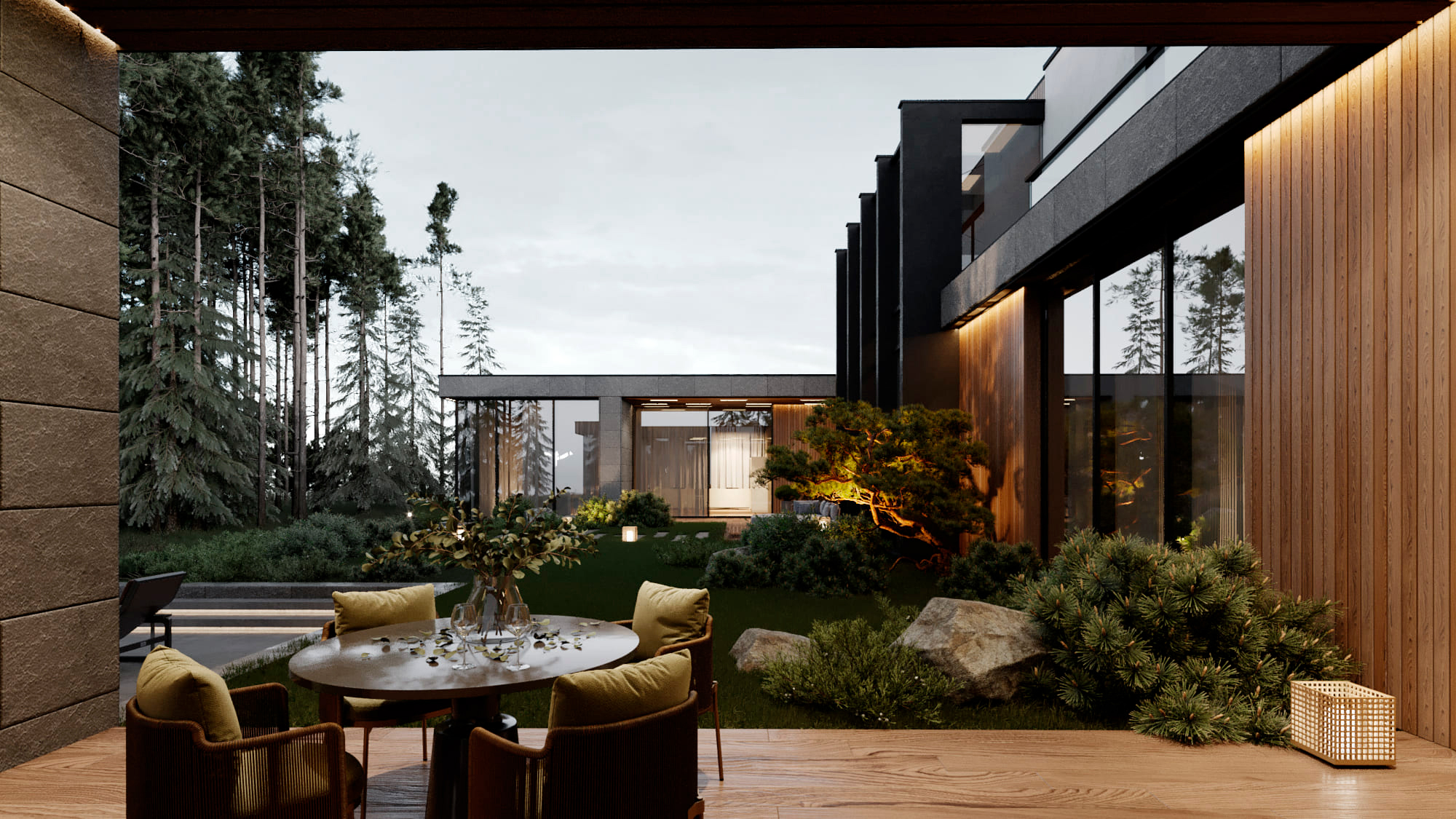 Функциональное зонирование дома подчинено принципу максимального комфорта. Сердцем планировки является внутренний озелененный двор, обеспечивающий визуальную и физическую связь с нетронутым лесным массивом. Все основные помещения первого этажа – мастер-блок, гостиная, кухня и столовая – спроектированы таким образом, чтобы обеспечить непосредственный доступ во внутренний двор. Это позволяет в любой момент выйти на свежий воздух, ощутить аромат трав и насладиться тишиной природы. Зона спа также имеет выход во дворик, предлагая возможность для уединенных солнечных ванн. Весь второй этаж предназначен для детских мастер-блоков, обеспечивая им приватное и комфортное пространство для жизни и развития. В отделке фасадов использованы натуральные материалы, такие как планкен теплых оттенков и керамогранит, подчеркивающие эстетику природного окружения. Отделка фасада плавно переходит в спа-зону, визуально объединяя экстерьер и зону отдыха. Инфинити-бассейн с переливным краем создает эффект визуального слияния с окружающим лесным массивом. Резиденция в Охта Парке представляет собой уникальное пространство для жизни, где архитектура и природа образуют единое целое.