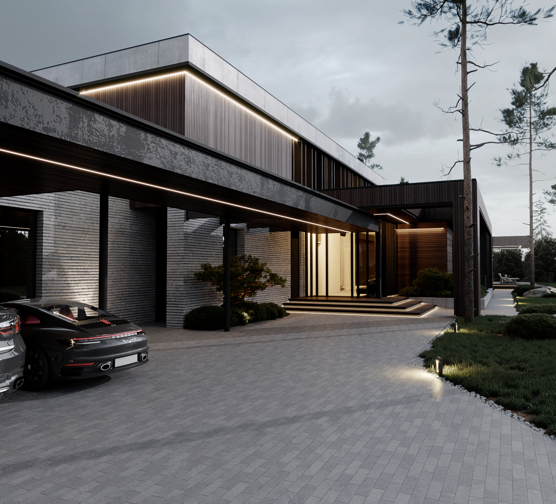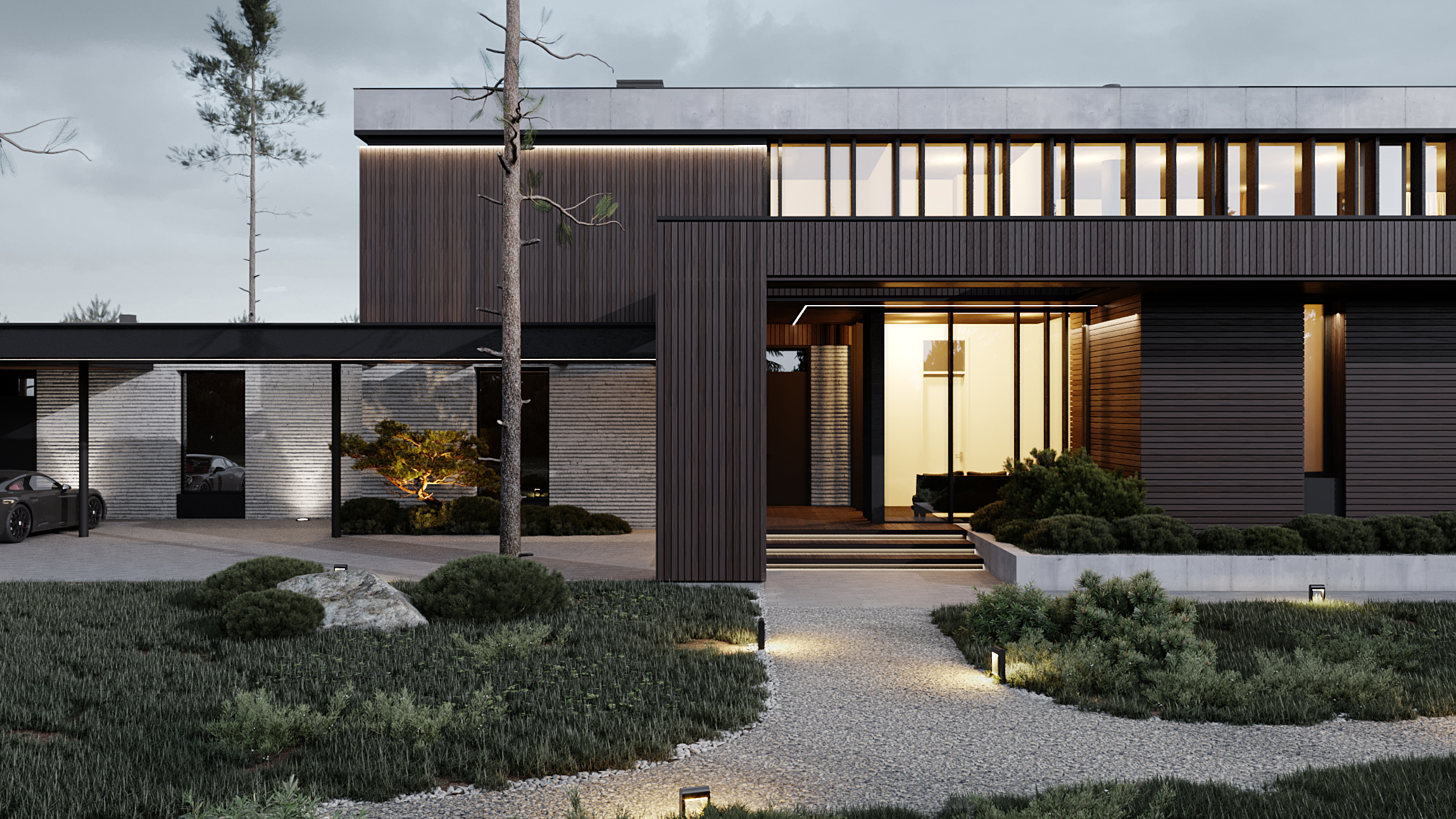 Загородная жилая резиденция площадью 758 квадратных метров расположена в посёлке Репино Парк. Экстерьер дома характеризуется выразительным объемным решением и преобладанием горизонтальных линий. В отделке сочетаются фактурный ригельный кирпич и планкен из термообработанной пихты, часть конструкций, такие как массивные бетонные балки и металлический навес, сохранены в своем первозданном виде.
