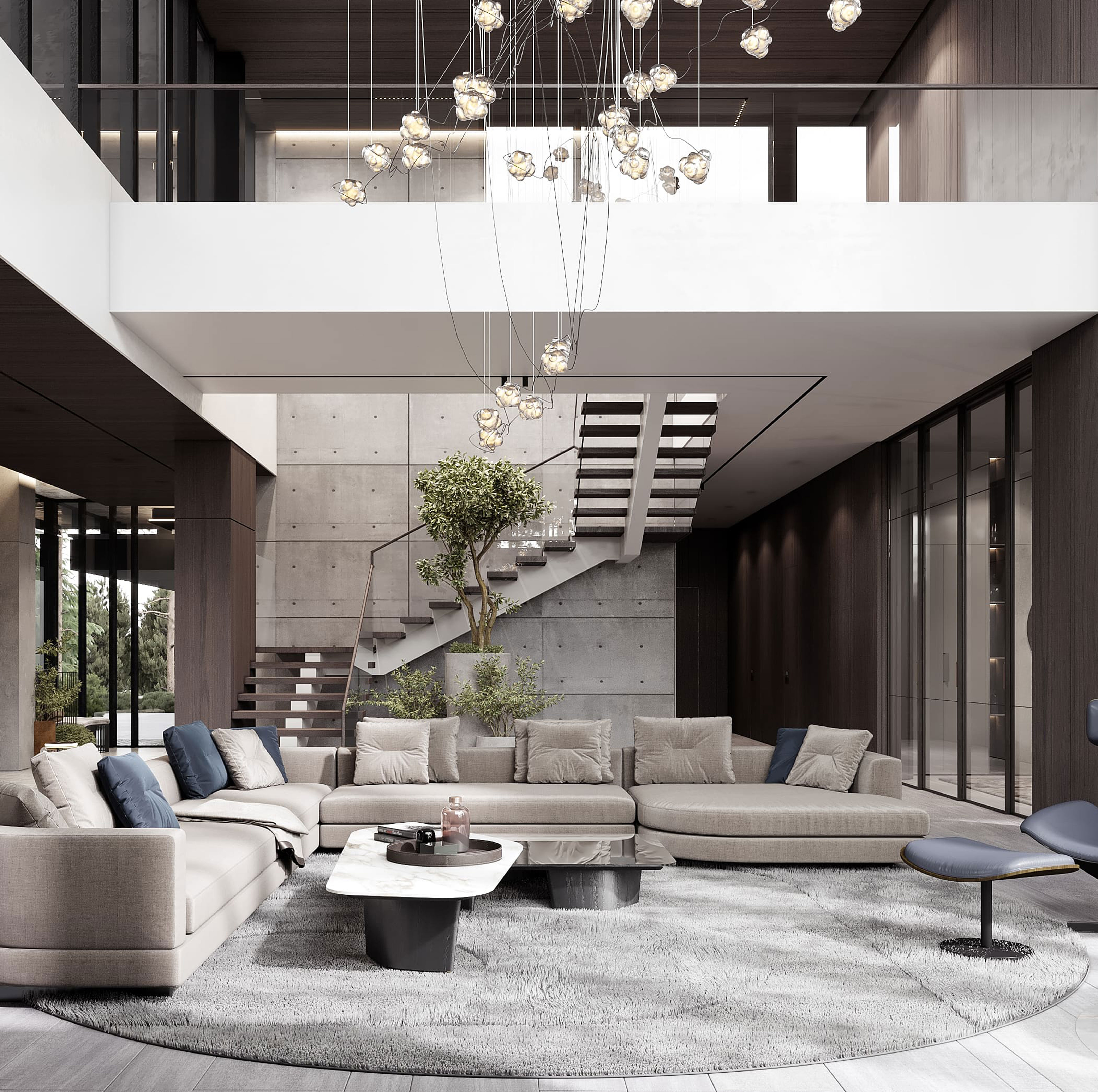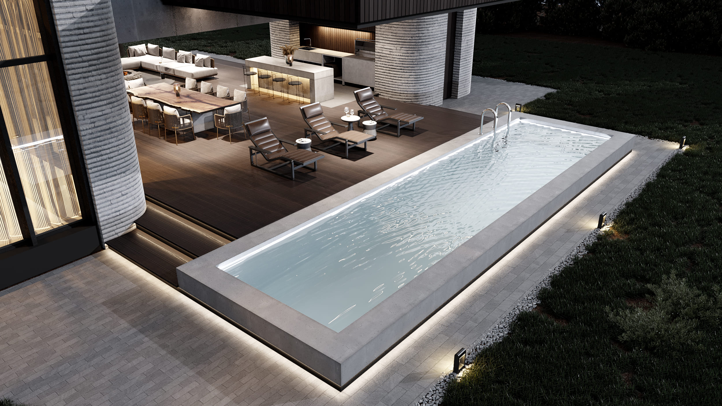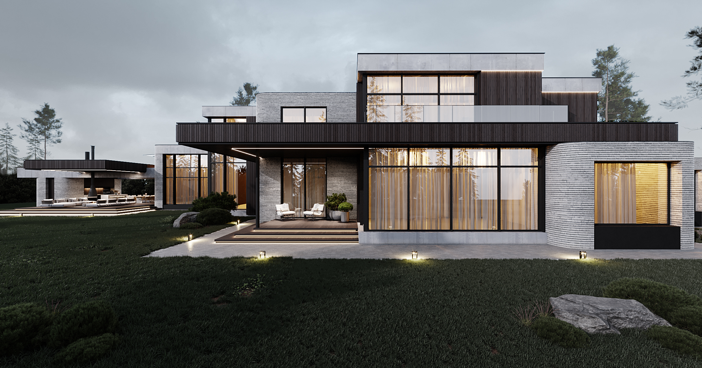 Витражные окна, равномерно распределенные по всем сторонам света, обеспечивают оптимальное естественное освещение в течение дня. Главным акцентом служит просторная терраса с зоной барбекю и бассейном, предназначенная для комфортного отдыха на свежем воздухе.