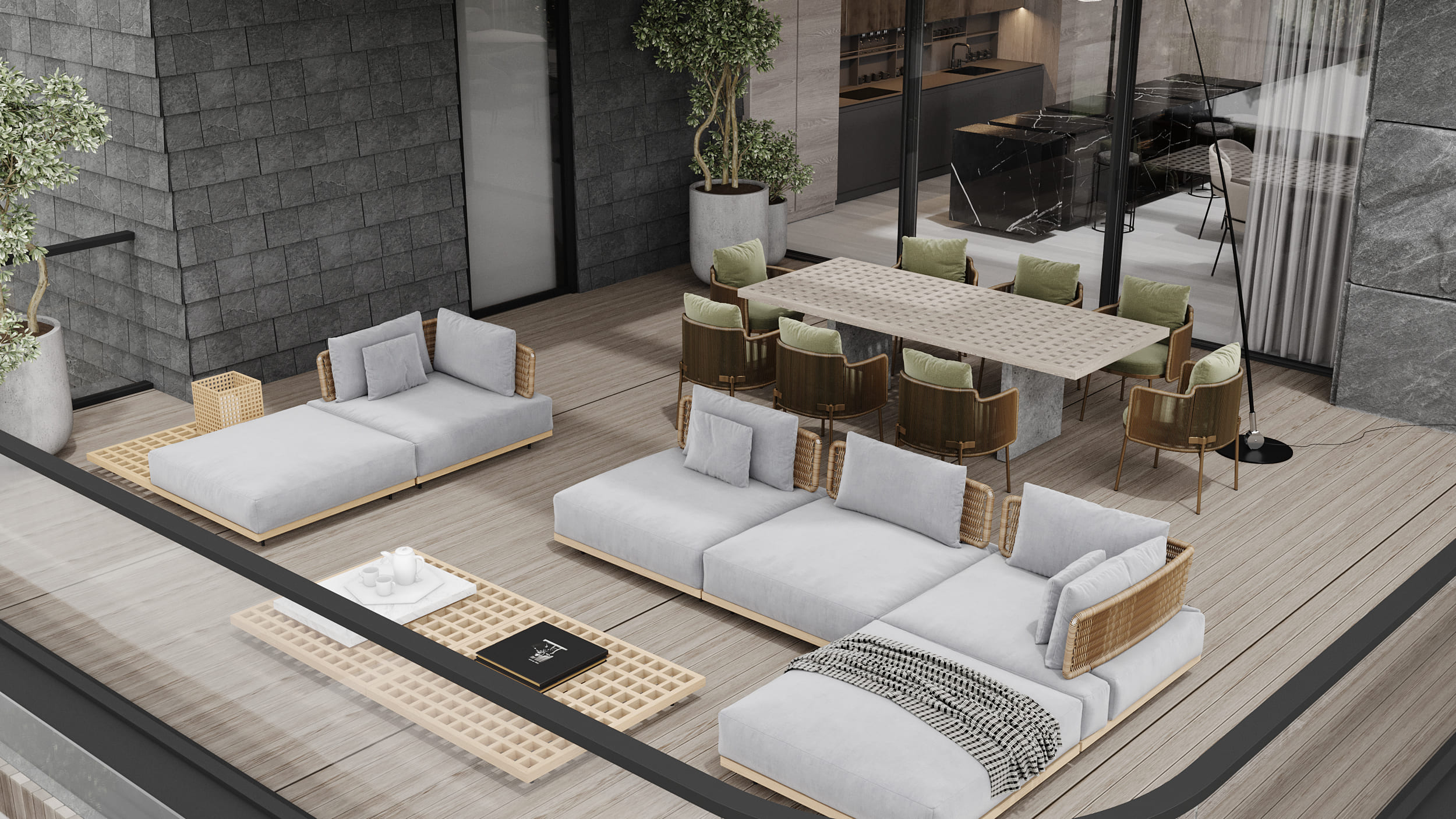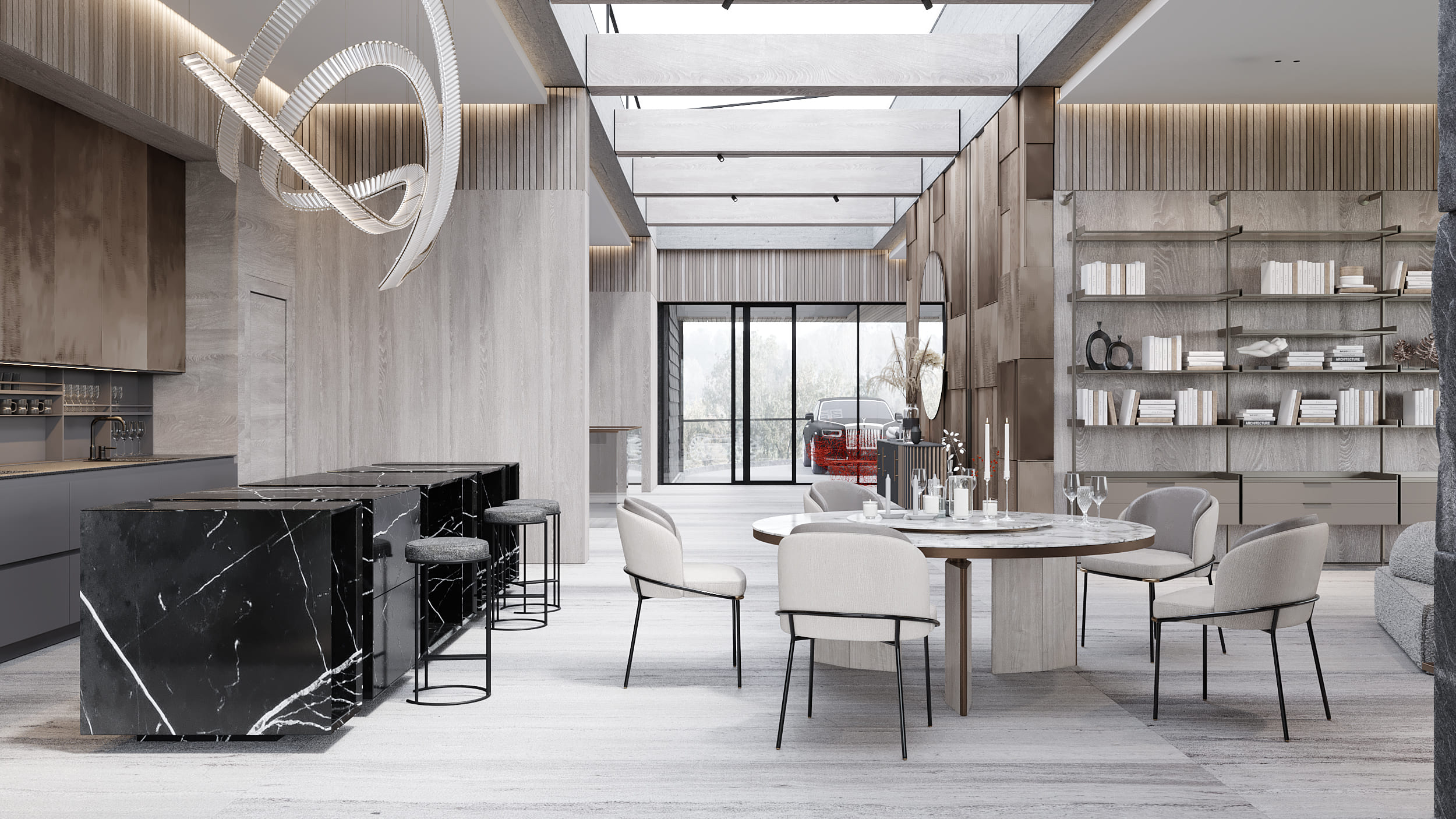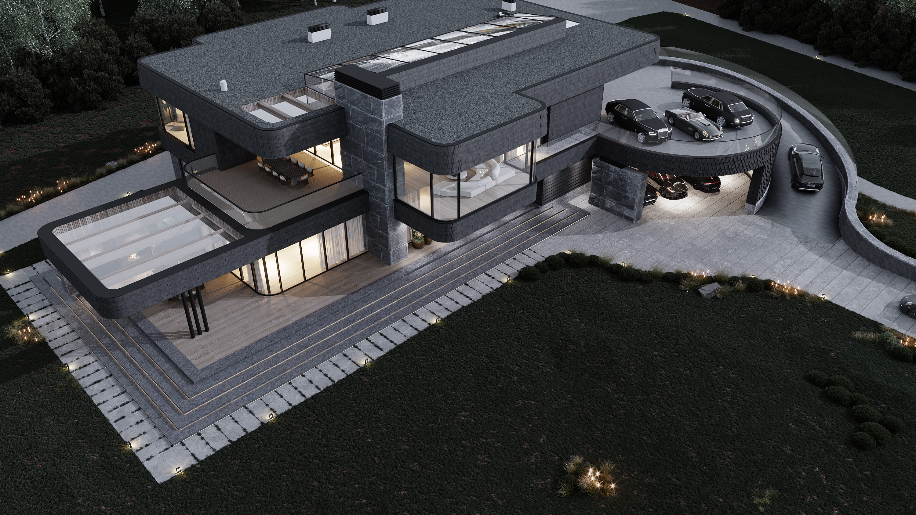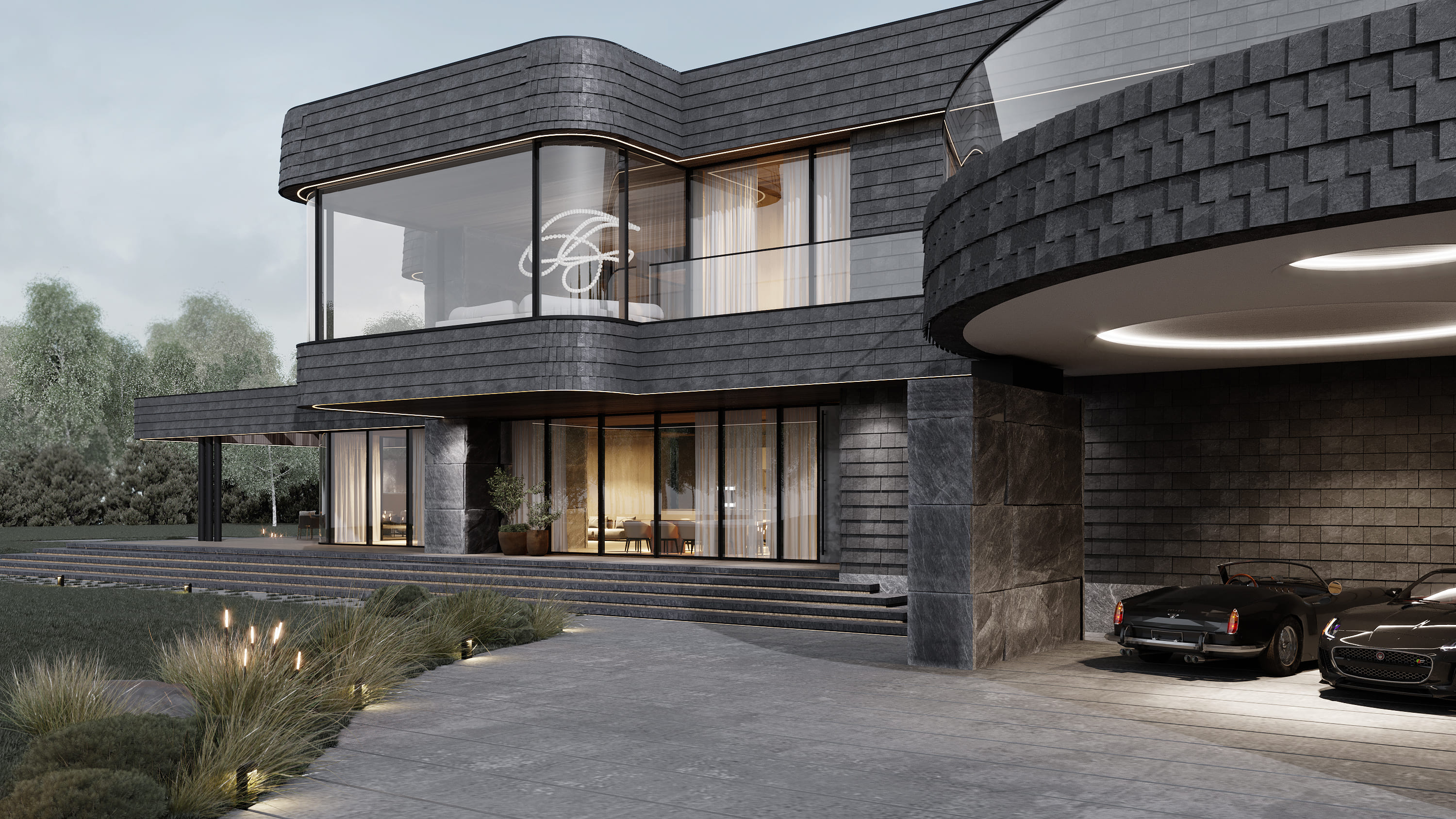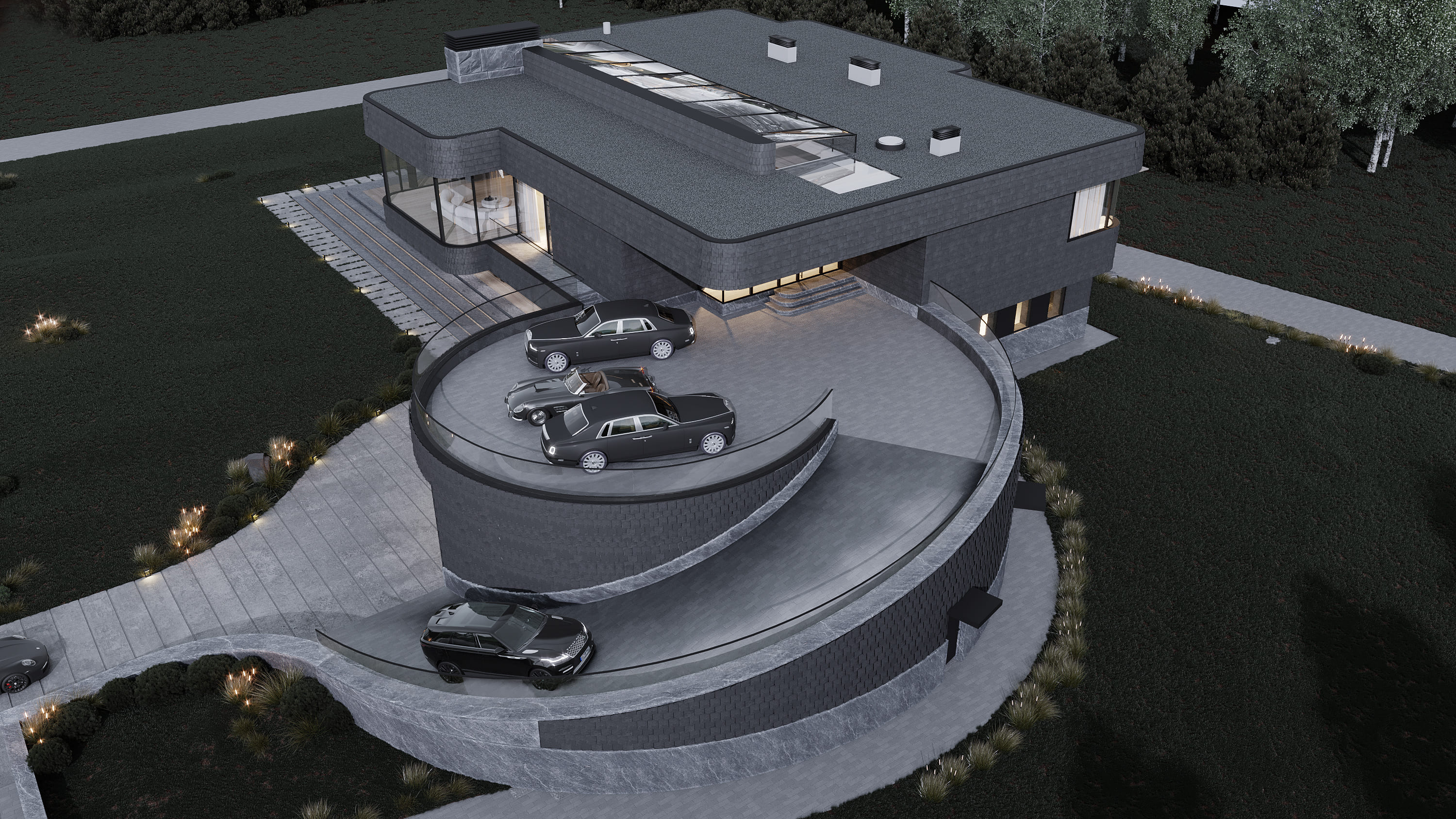 Дом является частью масштабной загородной резиденции, расположенной на участке площадью 5 гектаров. Резиденция включает в себя собственную прибрежную линию, причал и детально проработанную территорию, объединяющую множество разнообразных функций. Архитектурный образ и лейтмотив проекта были вдохновлены увлечением заказчика гоночными автомобилями. Этот образ дополнен уникальным элементом — радиусной рампой шириной 4,7 метра, обеспечивающей прямой доступ в жилую зону на втором этаже.