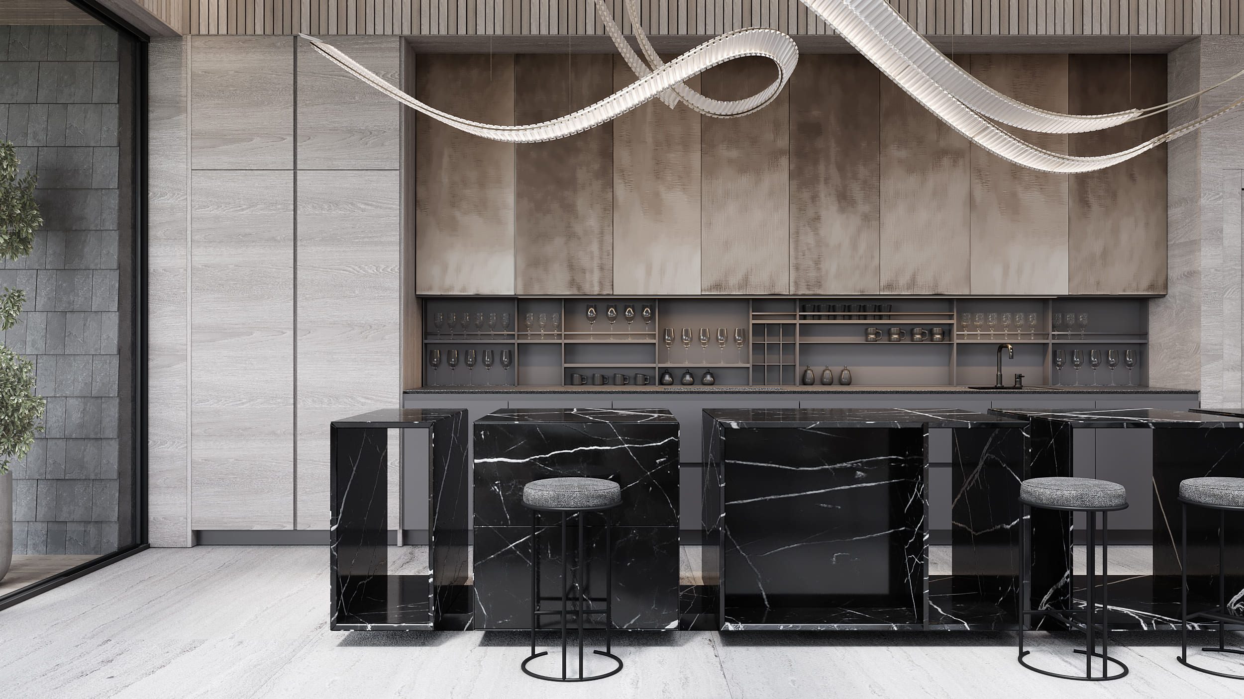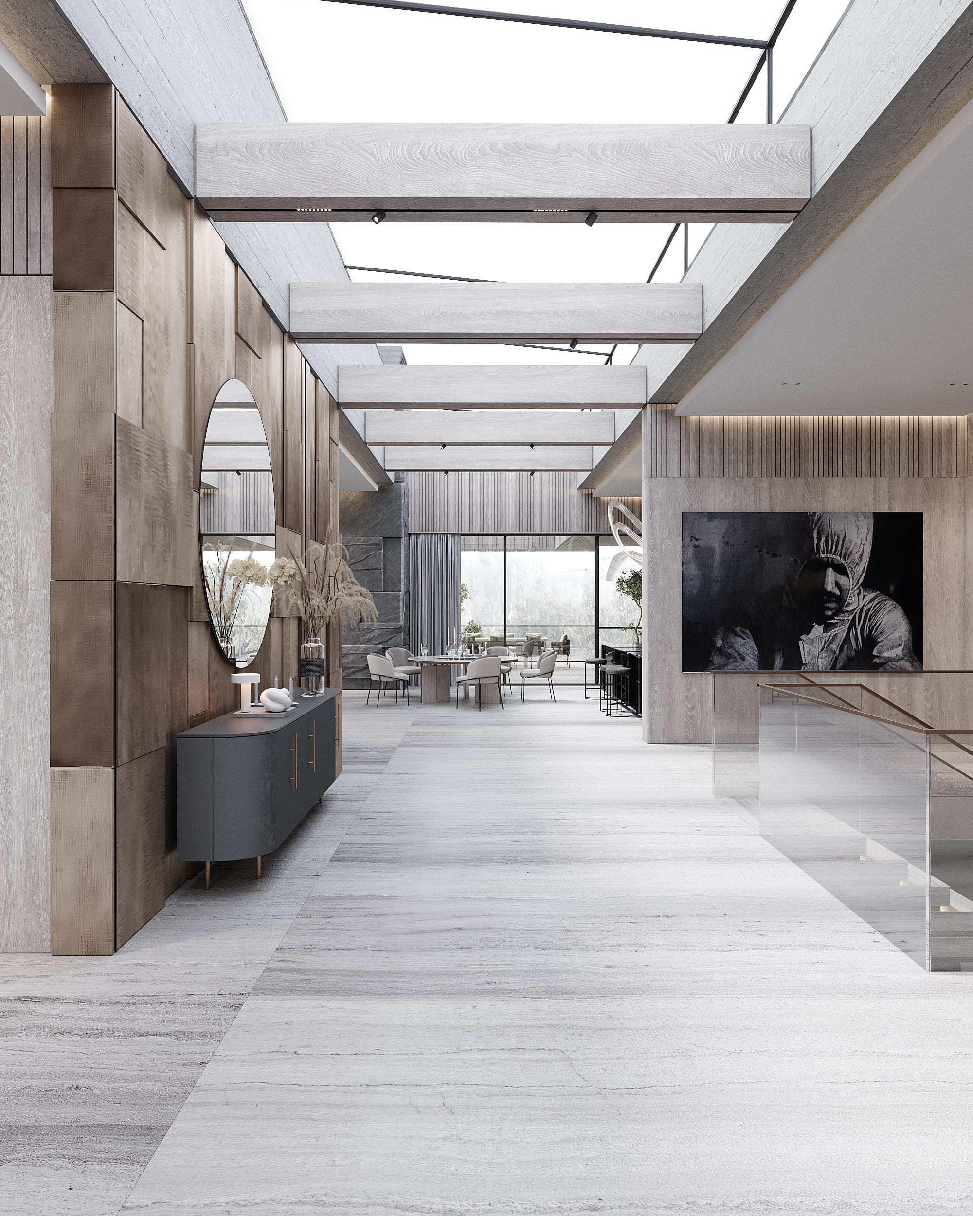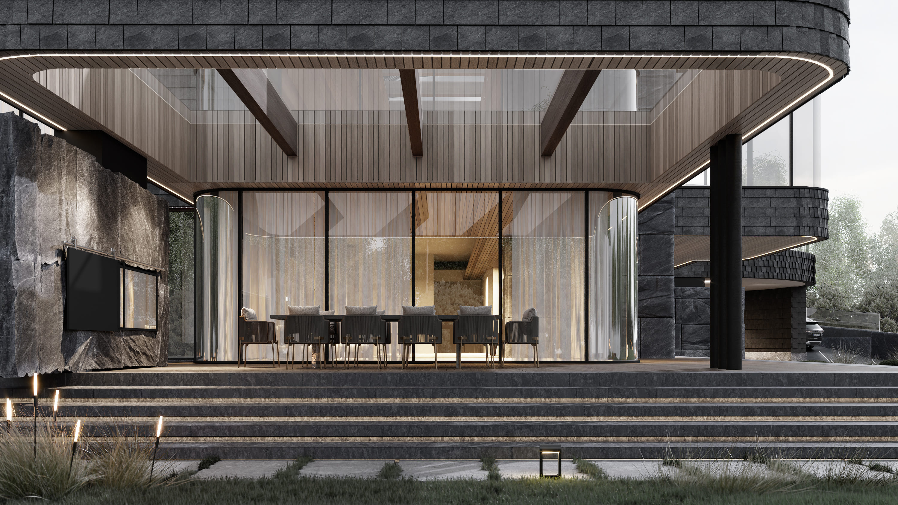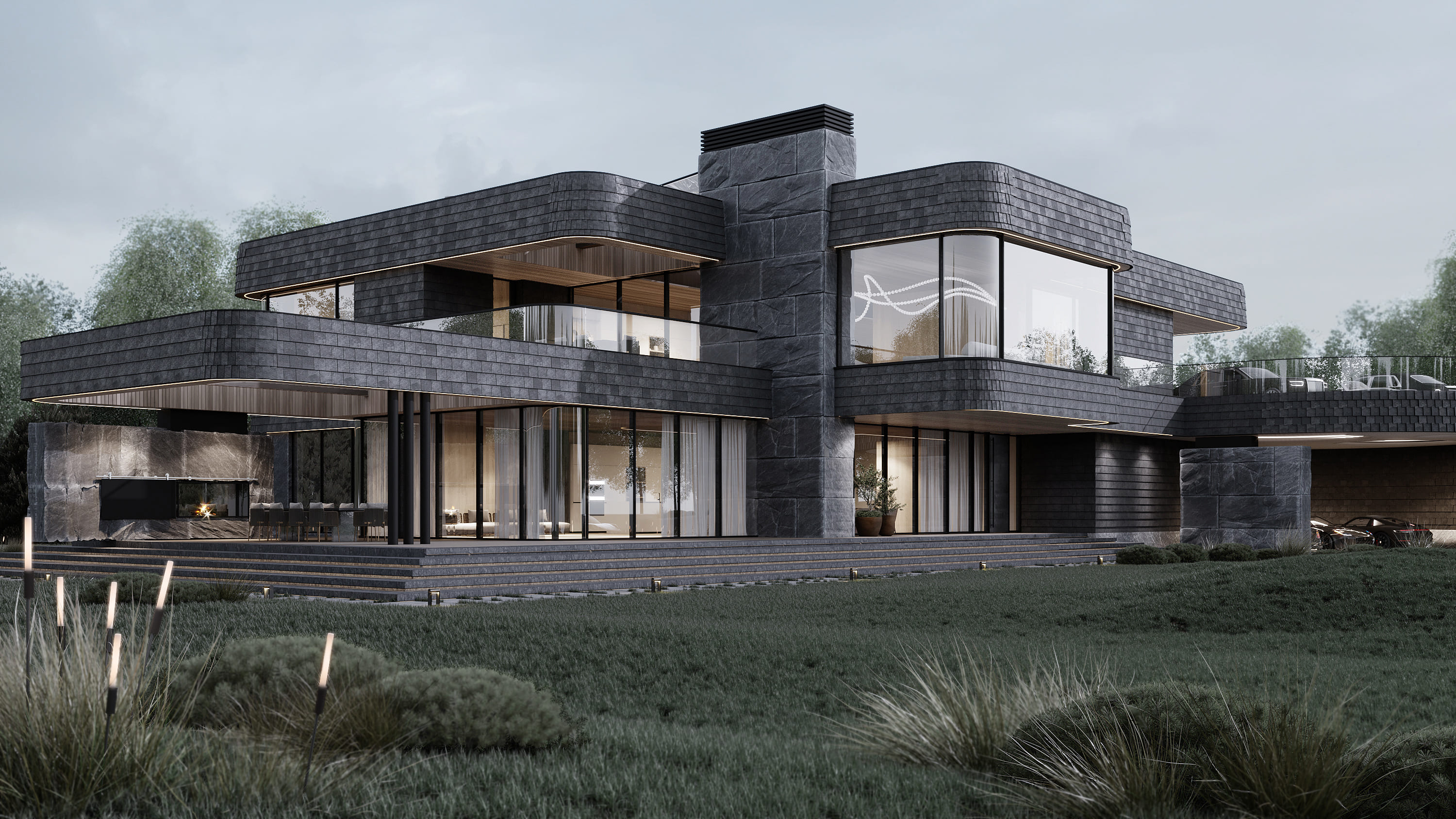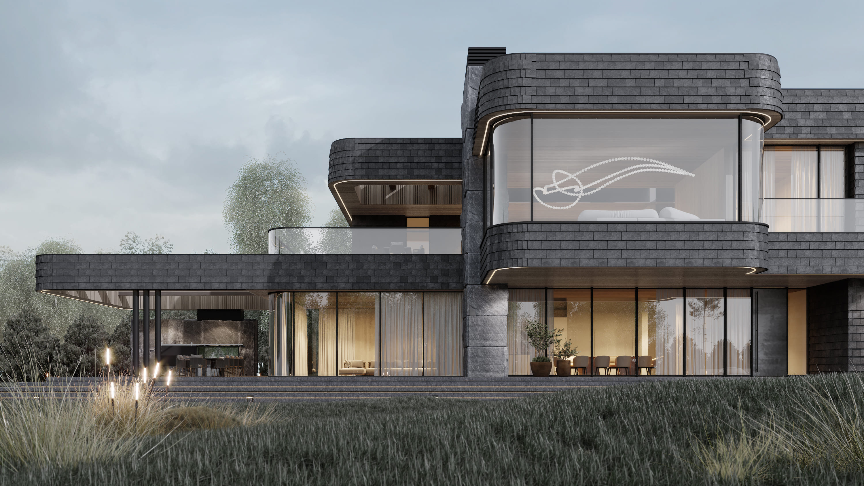 Функционально, дом разделен на две части: первый этаж – гостевая, тусовочная, техническая зона; второй этаж – кухня-гостиная с выходом на террасу, спальни. Такое решение обусловлено тем, что со второго этажа открывается живописный вид на озеро. По желанию заказчика, на жилой этаж можно заехать на автомобиле по радиусной рампе. Она стала визуальной доминантой. Форма дома представляет собой сочетание простых объемов, скомпонованных друг над другом, где каждый объем обладает индивидуальным пространственным решением. Часть верхнего этажа нависает большой консолью над террасой первого, что создает максимально удачную ориентацию гостиной с видовыми точками с трех сторон. Одной из особенностей, предающей индивидуальность облику здания, стал выбор основного отделочного материала для фасада: чешуйчатая кладка сланца. Он гармонично сочетается с крупноформатными гранитными плитами и натуральным деревом, находя свое продолжение в интерьере.