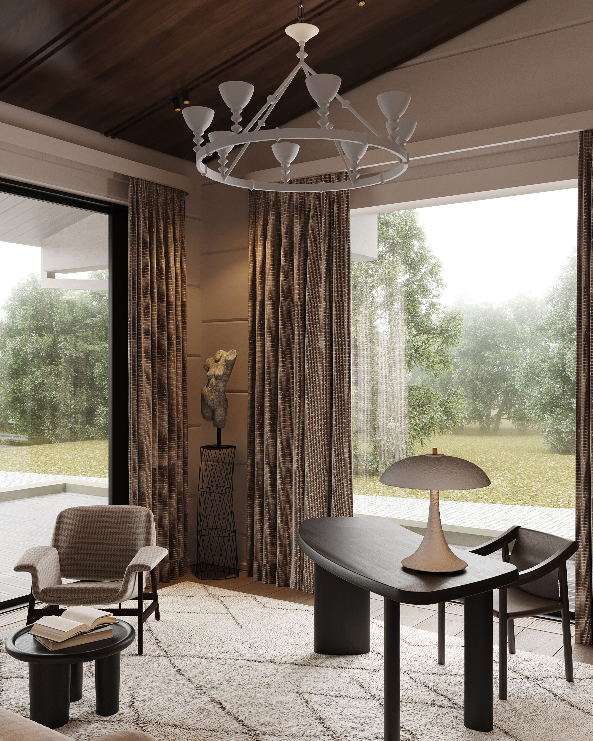 Проект представляет собой современную интерпретацию традиционной деревенской избы, предлагая новое видение роскоши: расслабление и умиротворение, вдали от шума и забот повседневной жизни, в атмосфере, вдохновленной природными формами и предметами ремесла. Ключевая особенность проекта – использование бруса с крупным, нестандартным сечением (600 × 400 мм), изготовленного на заказ в Сибири. Этот массивный брус выглядит основательно и сомасштабен размерам дома (общая площадь которого составляет 1069 м², а высота потолков достигает 7,1 м), что отсылает нас к классическим деревянным домам северных регионов. В двускатную кровлю традиционной формы искусно интегрирован световой фонарь, наполняющий внутреннее пространство светом и воздухом.
