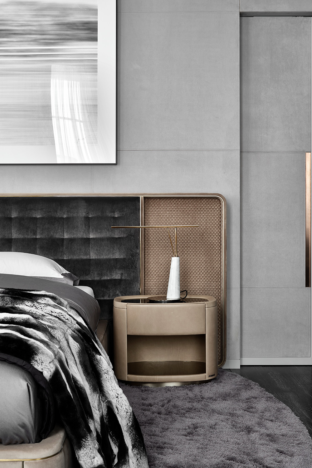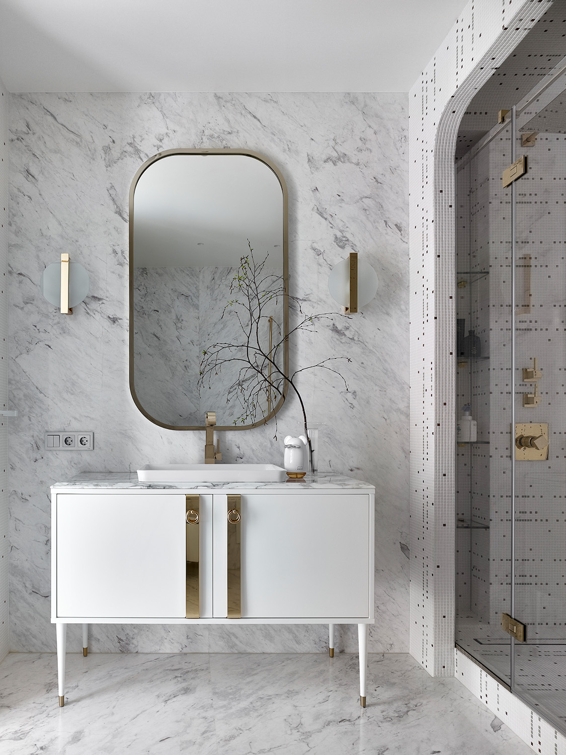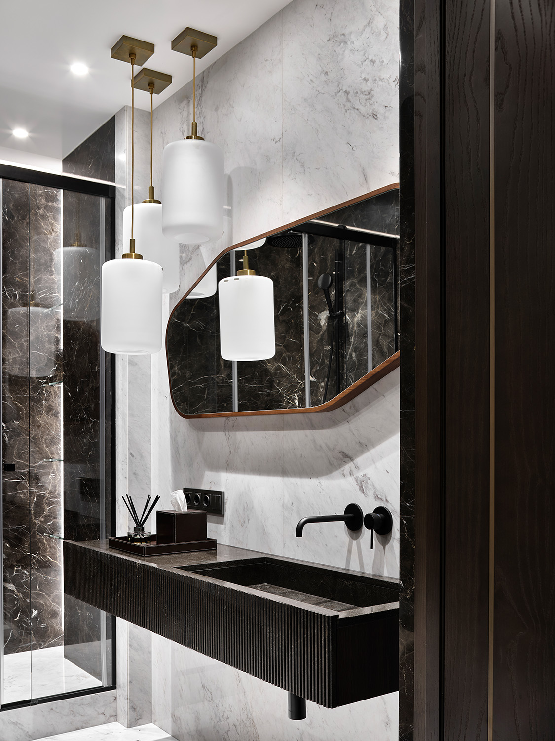 Монохромный колорит квартиры служит нейтральным фоном для сочетания разных отделочных материалов: панели из алькантары и шпона, металл и нубук, натуральный камень и стекло. Весь интерьер построен на сочетании разнообразных фактур.