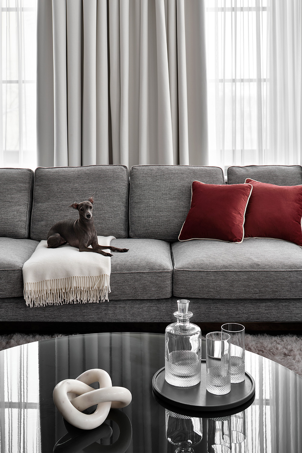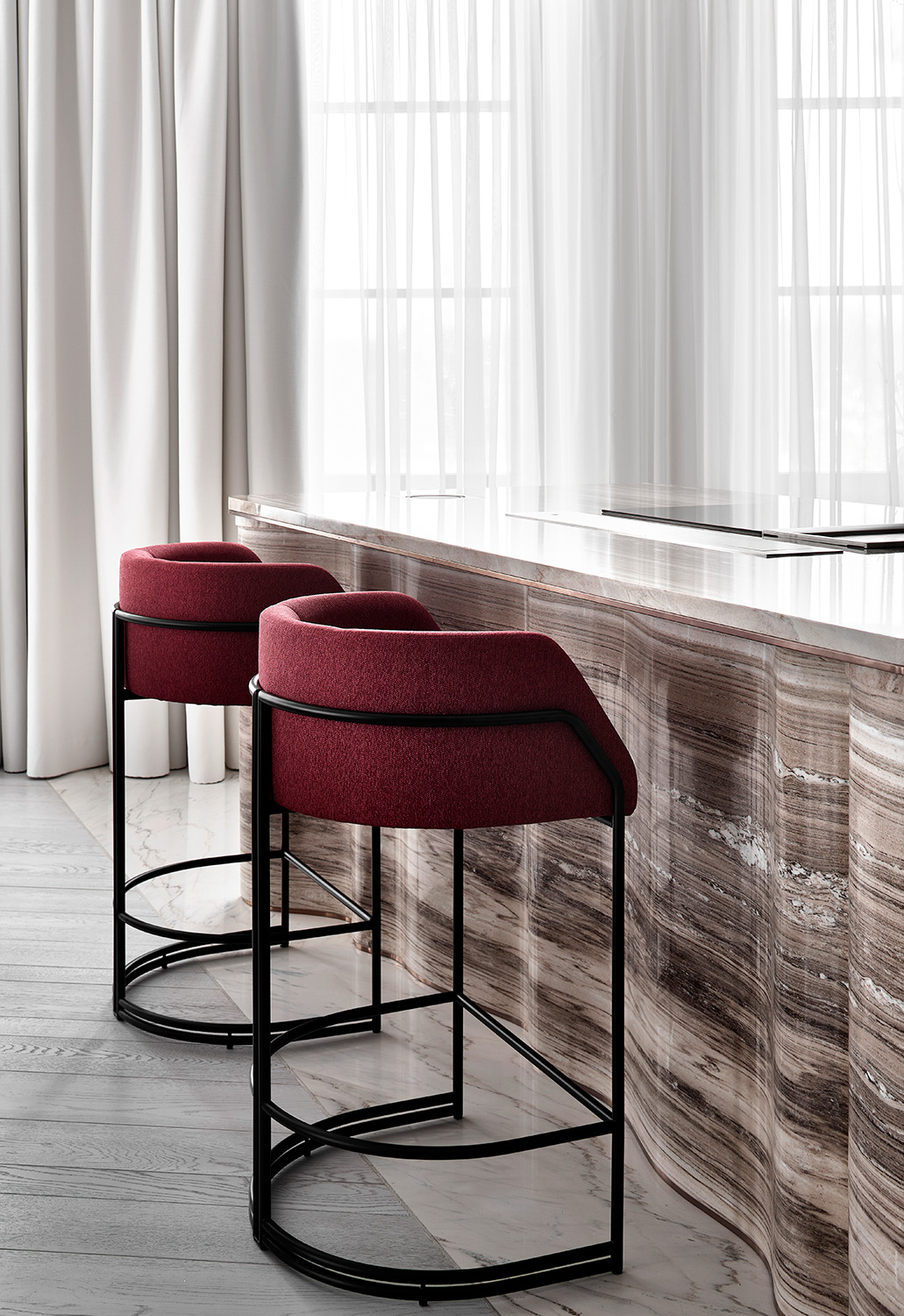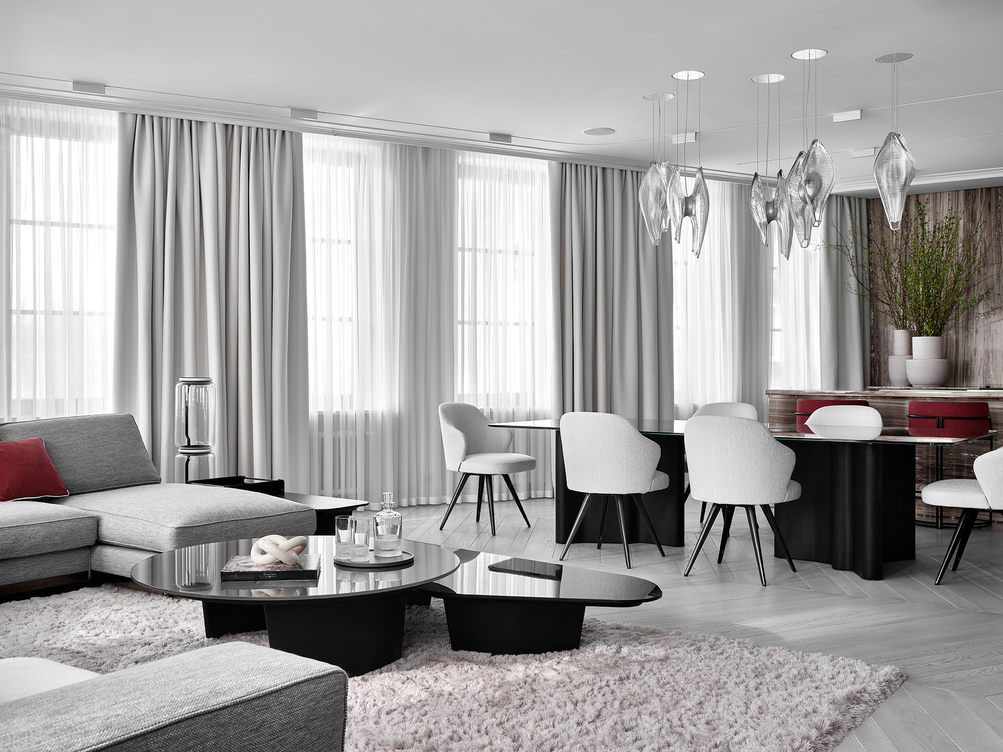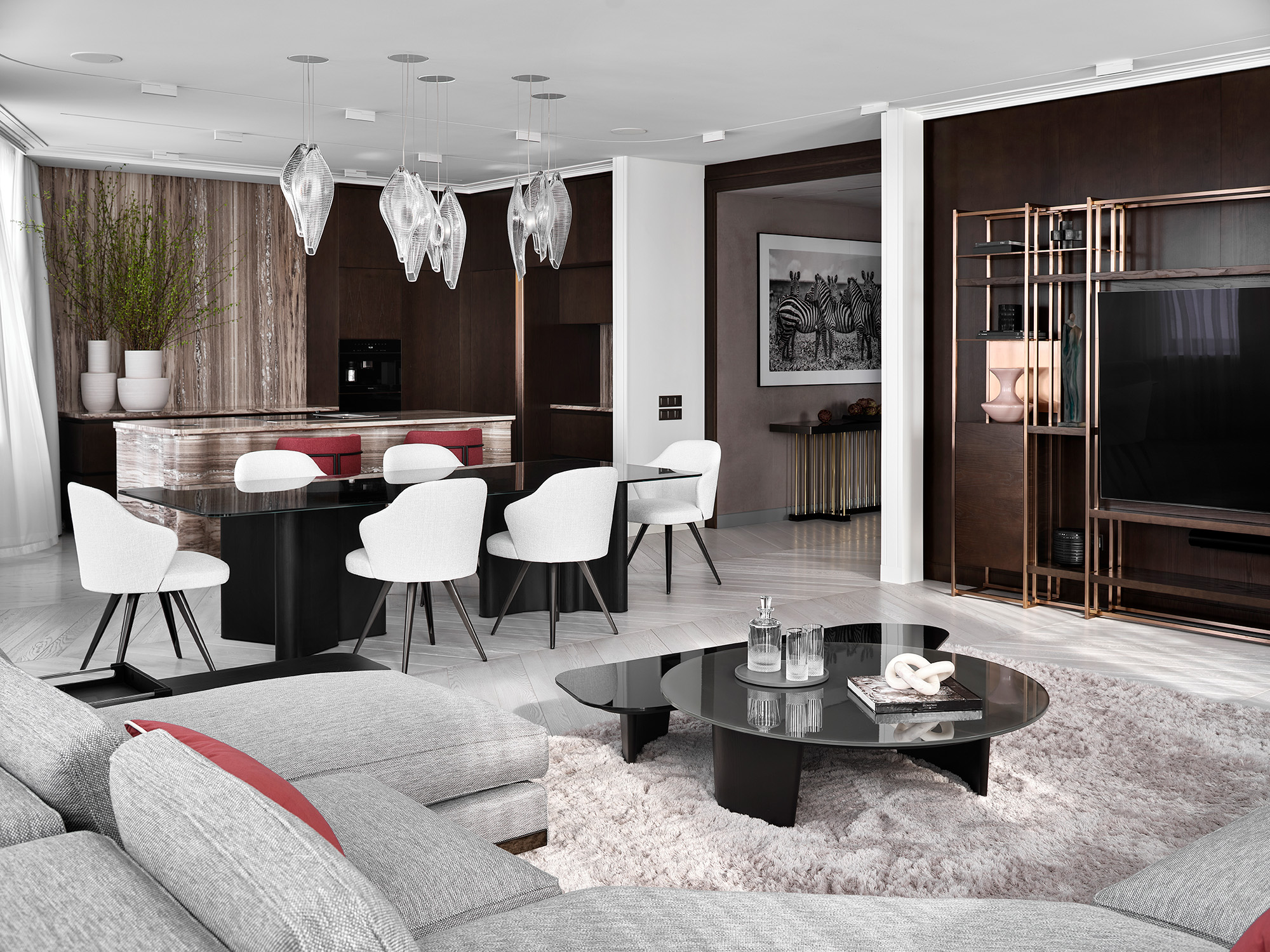 Главным акцентом гостиной является кухонный остров из натурального мрамора Palissandro — этот уникальный, сложный в изготовлении, элемент интерьера был выполнен на заказ. Формообразование острова было вдохновлено волнообразными элементами мебели столовой зоны, а именно подстольем обеденного стола. Применение натурального камня позволяет оживить монохромный интерьер, так как естественный рисунок мрамора добавляет интерьеру выразительности и контраста. Все применённые материалы перетекают из одного помещения в другое, объединяя квартиру в единое целое.