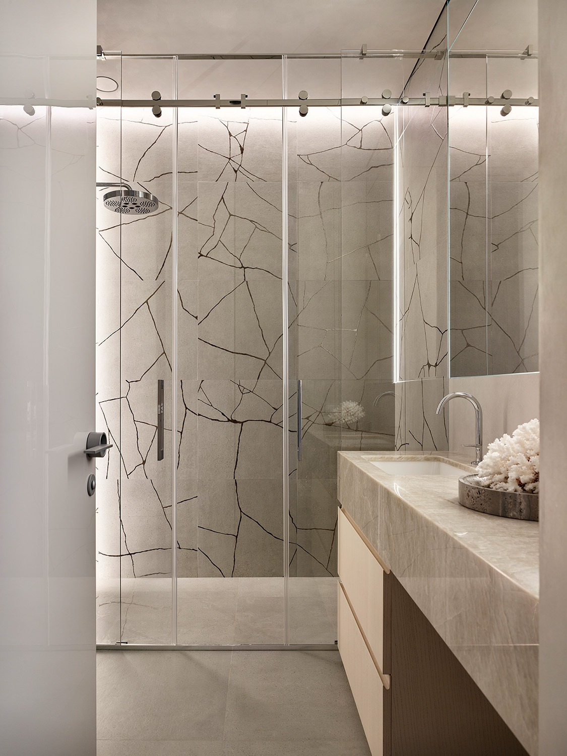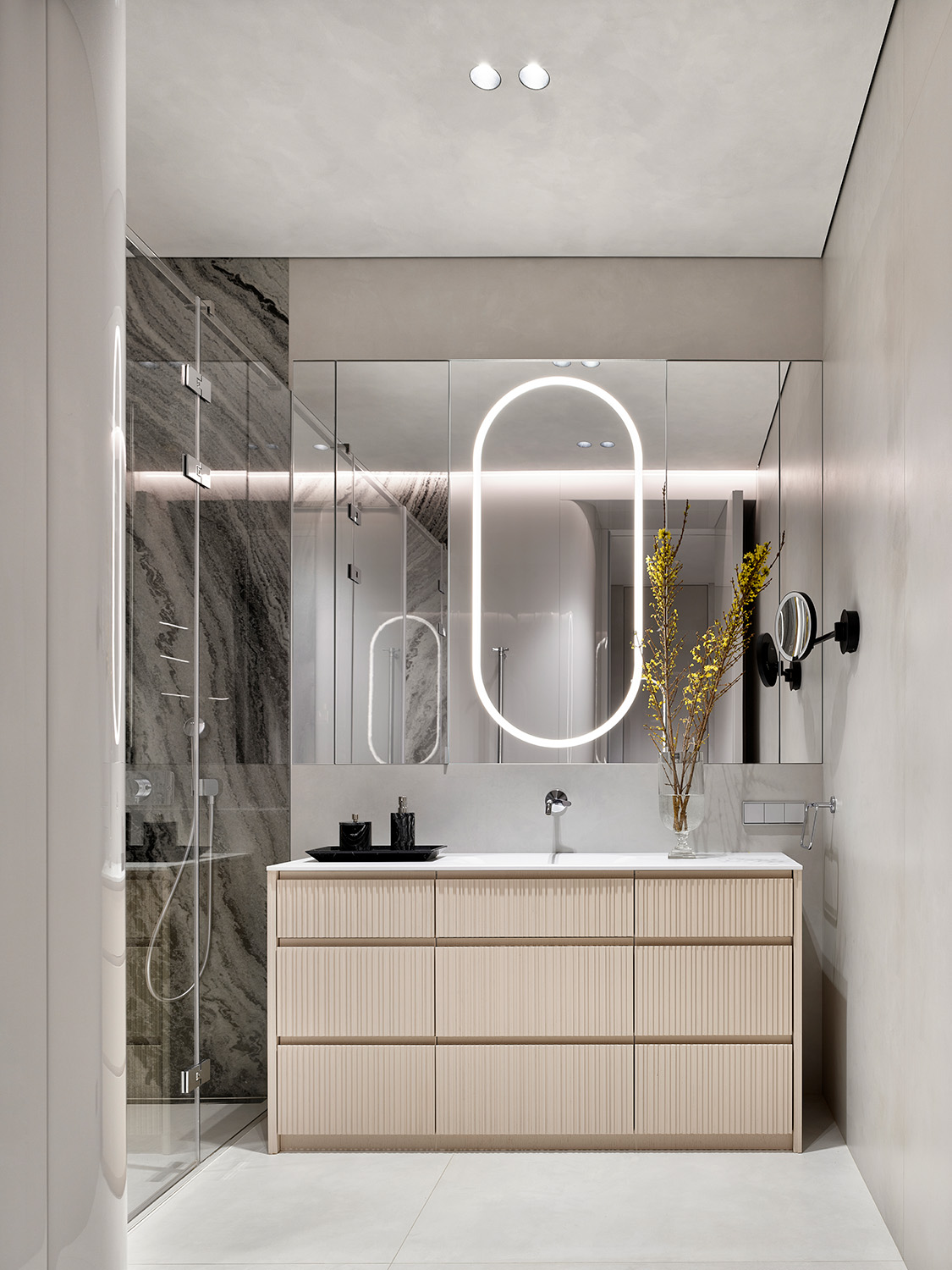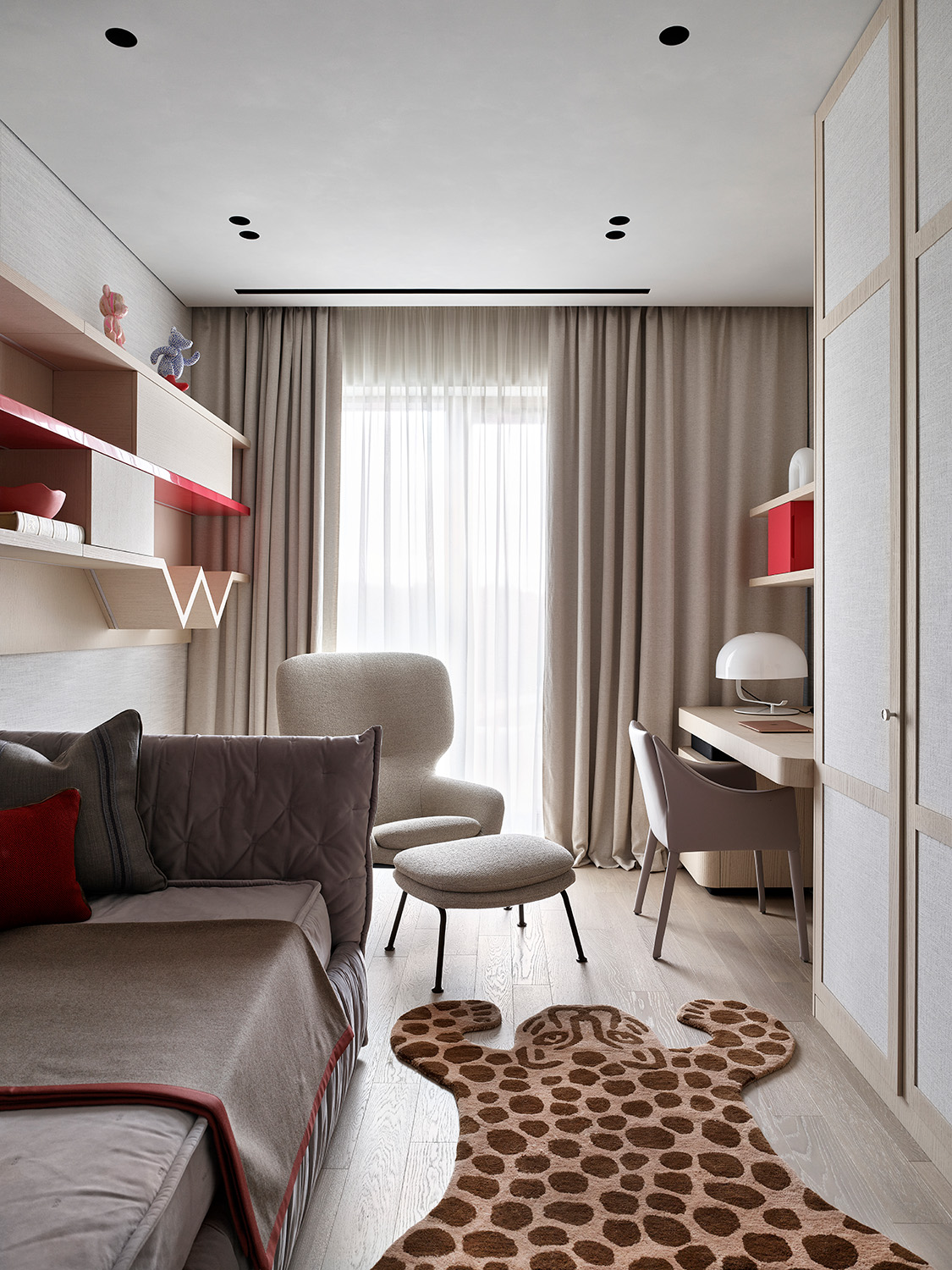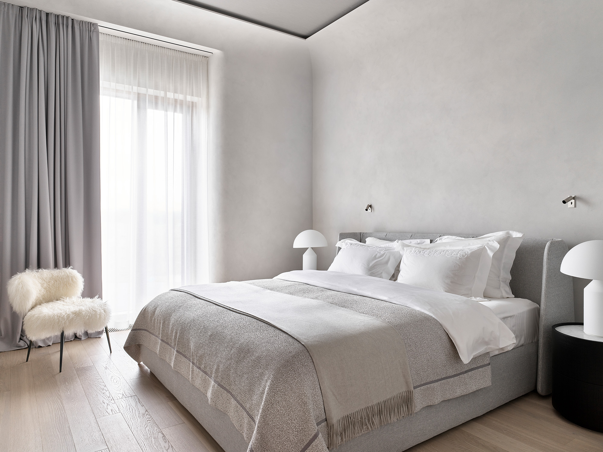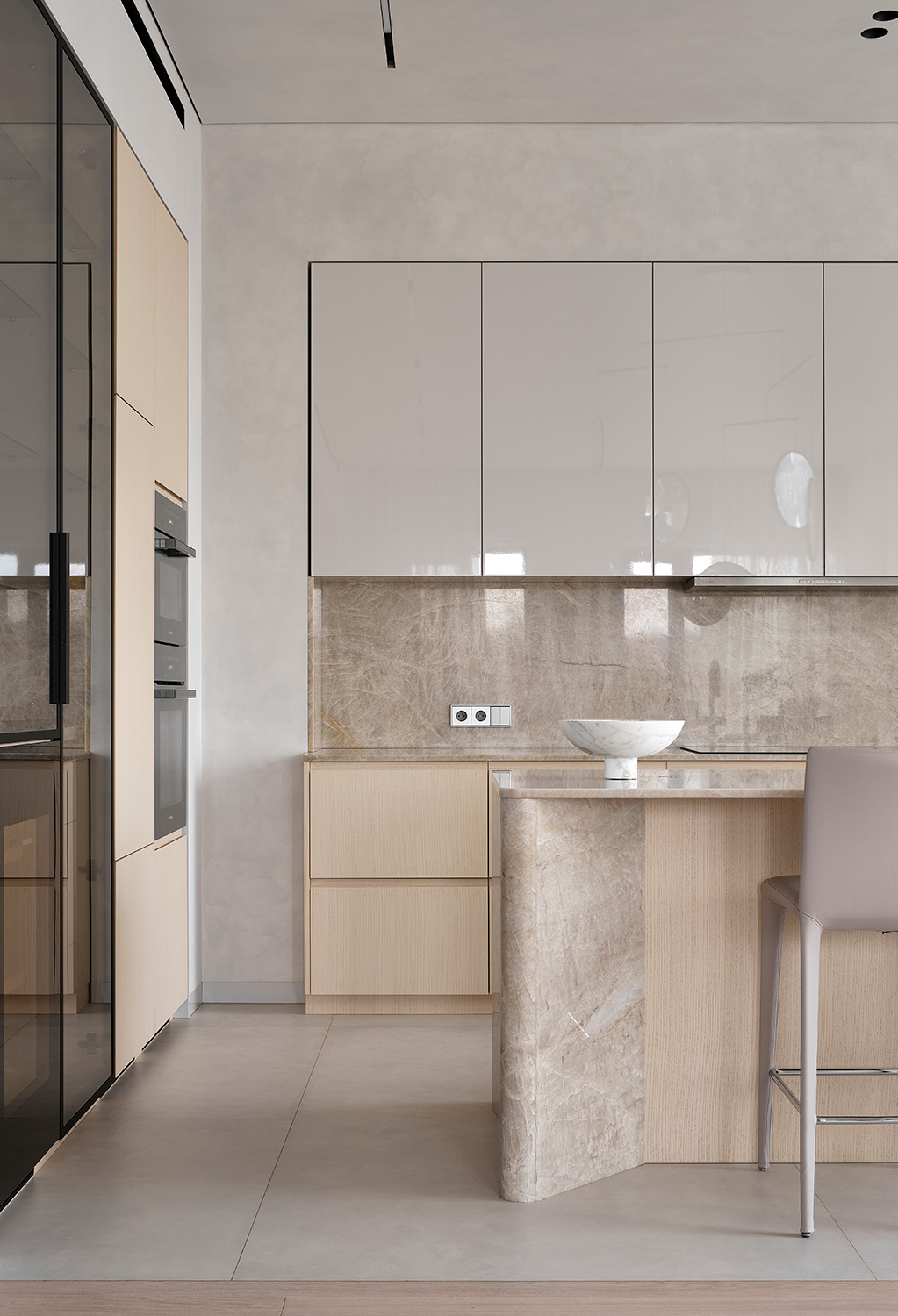 Кажется, что интерьер сделан легко, на одном дыхании. Однако он был сложным в реализации: в пространстве использованы теневые профили, утопленные плинтусы, высокие двери в потолок, а кроме того, осуществлена стыковка разных отделок в один уровень. Результат - ощущение безупречной чистоты линий. Отсутствие острых углов и преобладание мягких, плавных линий добавляет интерьеру женственности и элегантности.