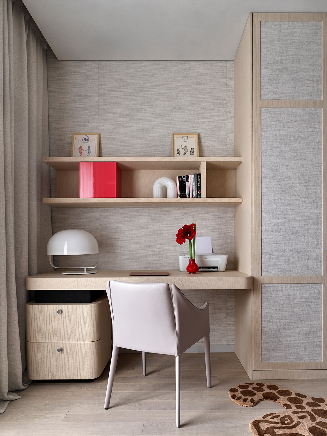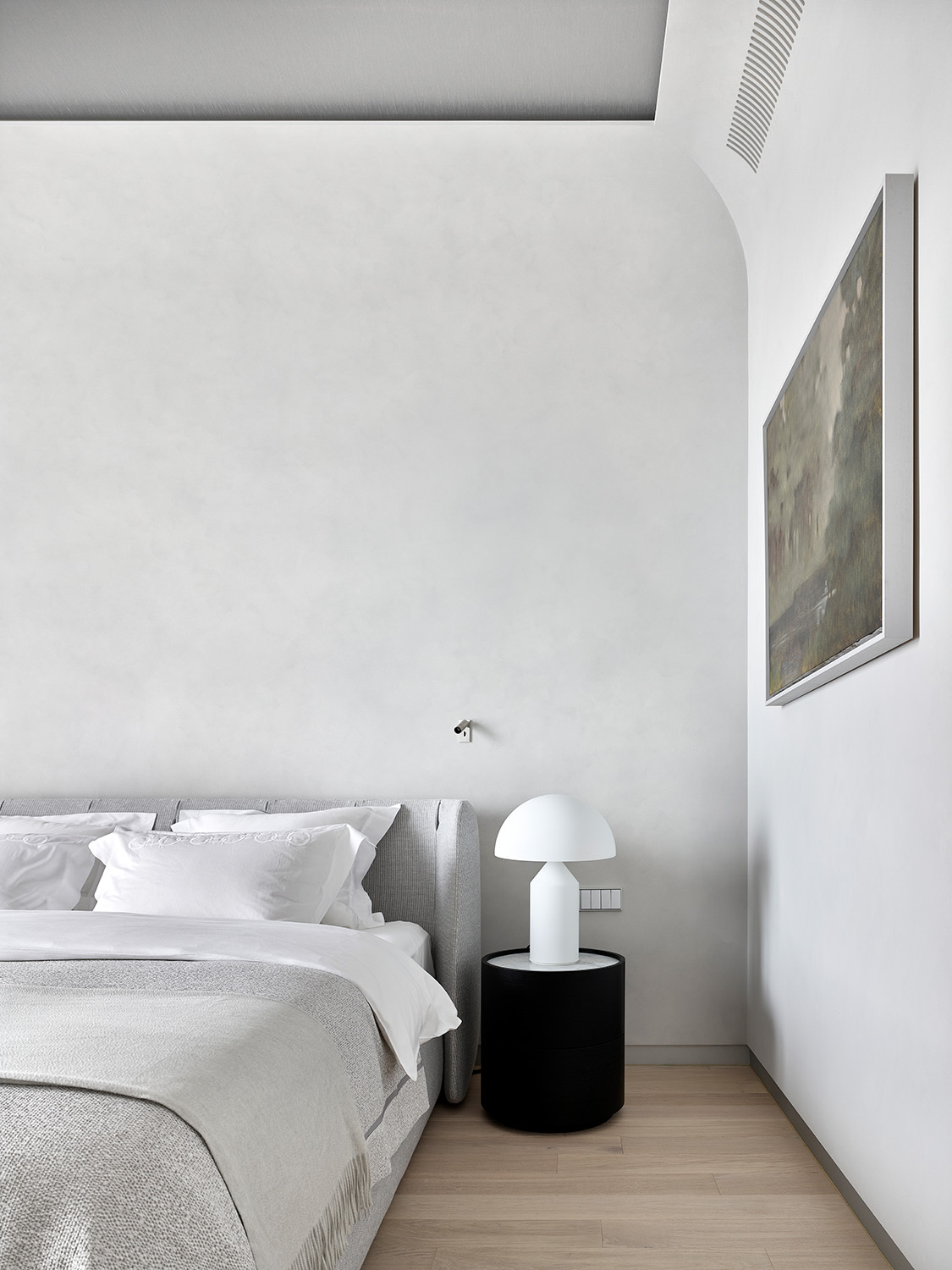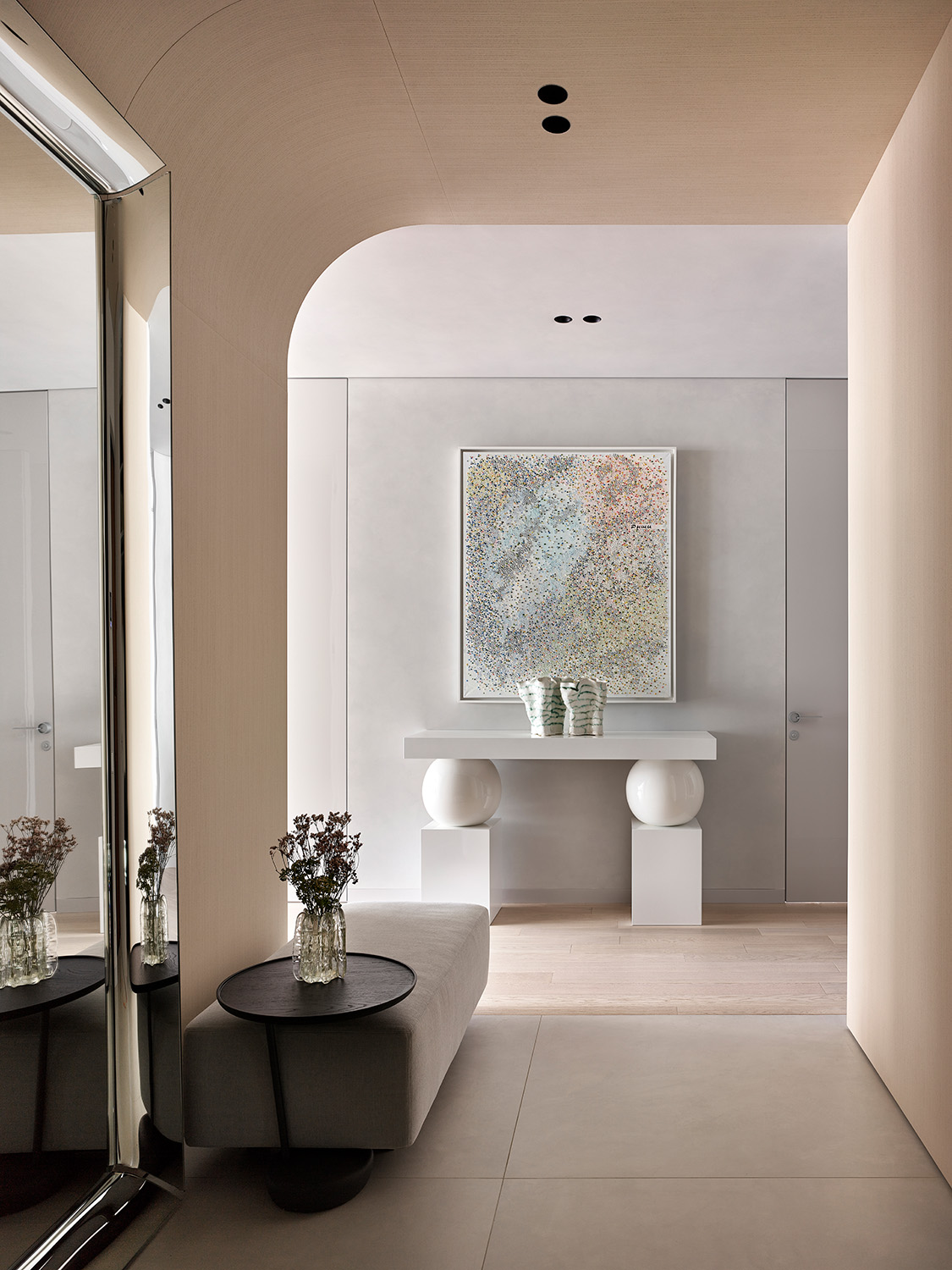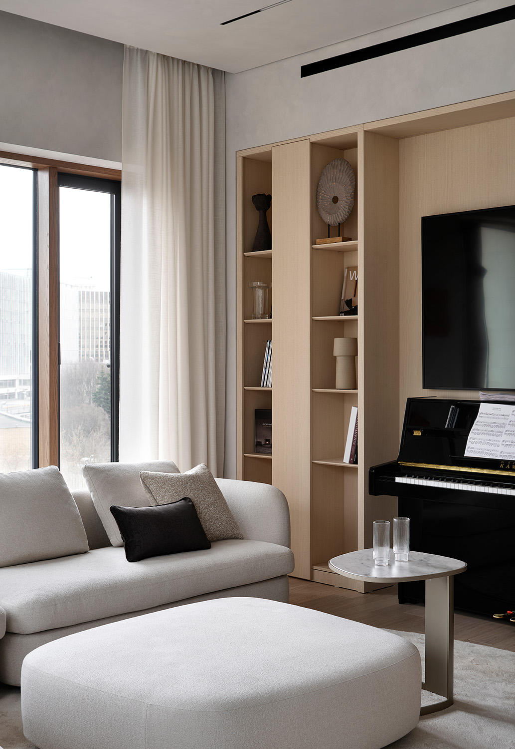 У интерьера квартиры в московском ЖК «Вишневый сад» интересная предыстория: заказчики попросили создать здесь идеальное пространство для коллекции произведений искусства. Так в интерьере появились светло-серый, как в галерее, оттенок стен и потолка, скульптурные формы дизайнерской мебели со скругленными углами, эффектная подсветка. Каждый из этих элементов способствует созданию атмосферы тишины и гармонии, где искусство выходит на первый план.