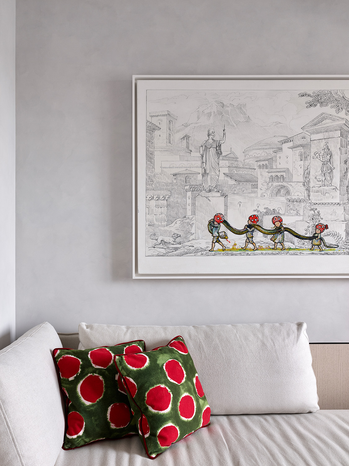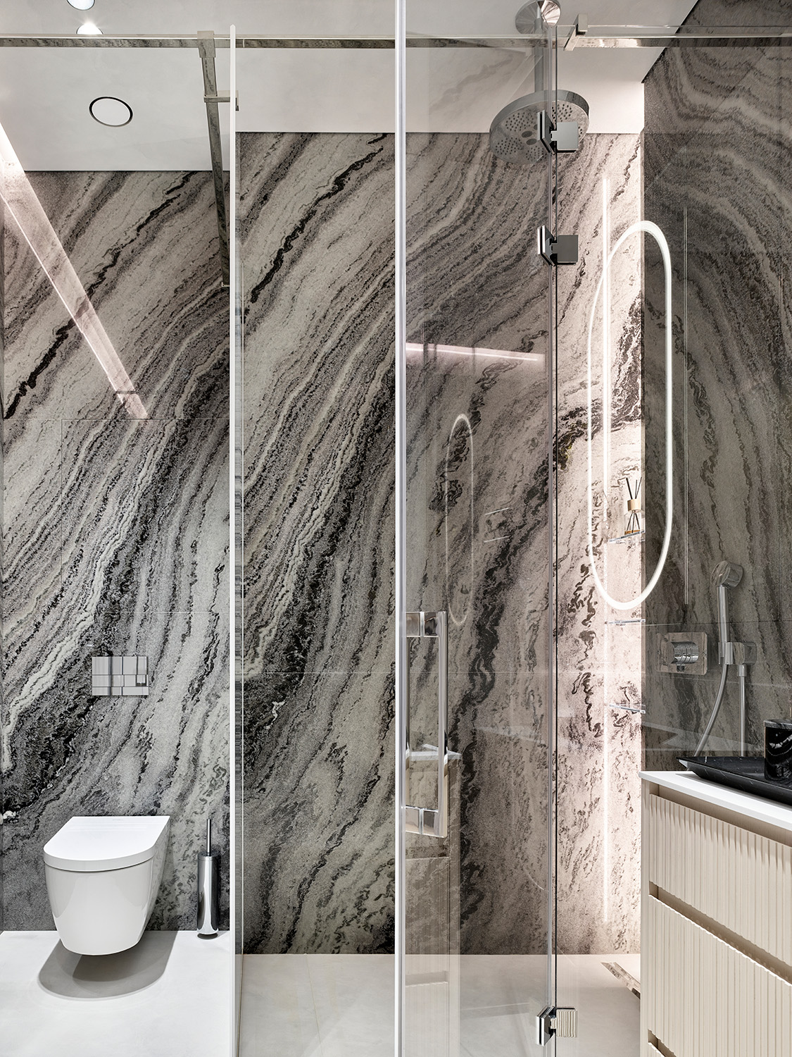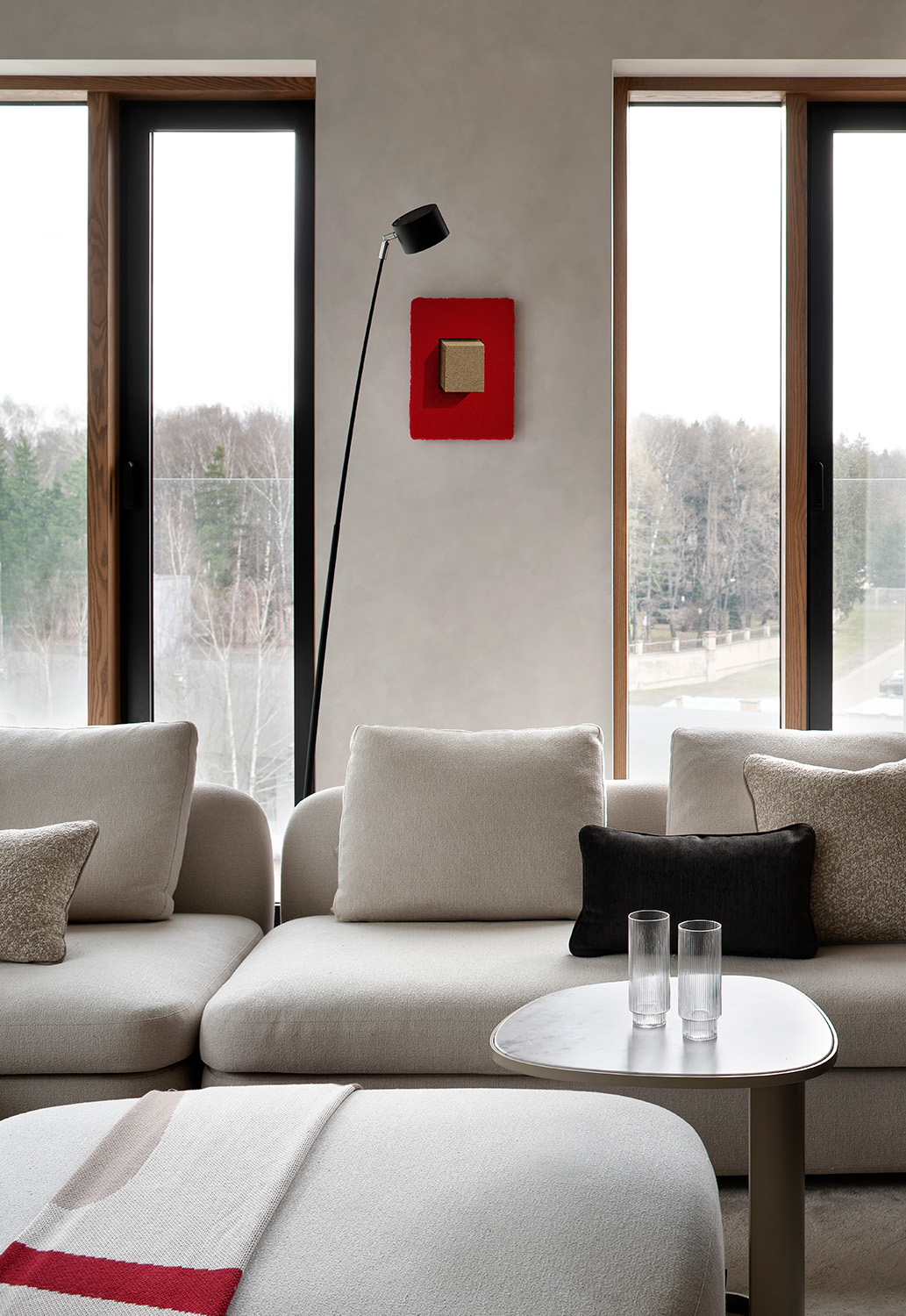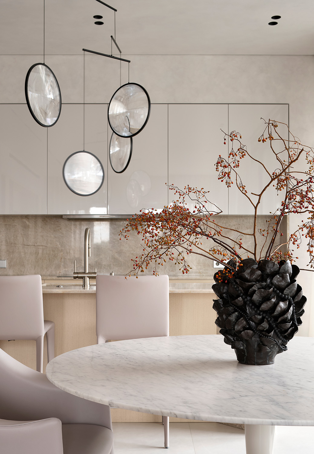 У интерьера квартиры в московском ЖК «Вишневый сад» интересная предыстория: заказчики попросили создать здесь идеальное пространство для коллекции произведений искусства. Так в интерьере появились светло-серый, как в галерее, оттенок стен и потолка, скульптурные формы дизайнерской мебели со скругленными углами, эффектная подсветка. Каждый из этих элементов способствует созданию атмосферы тишины и гармонии, где искусство выходит на первый план.