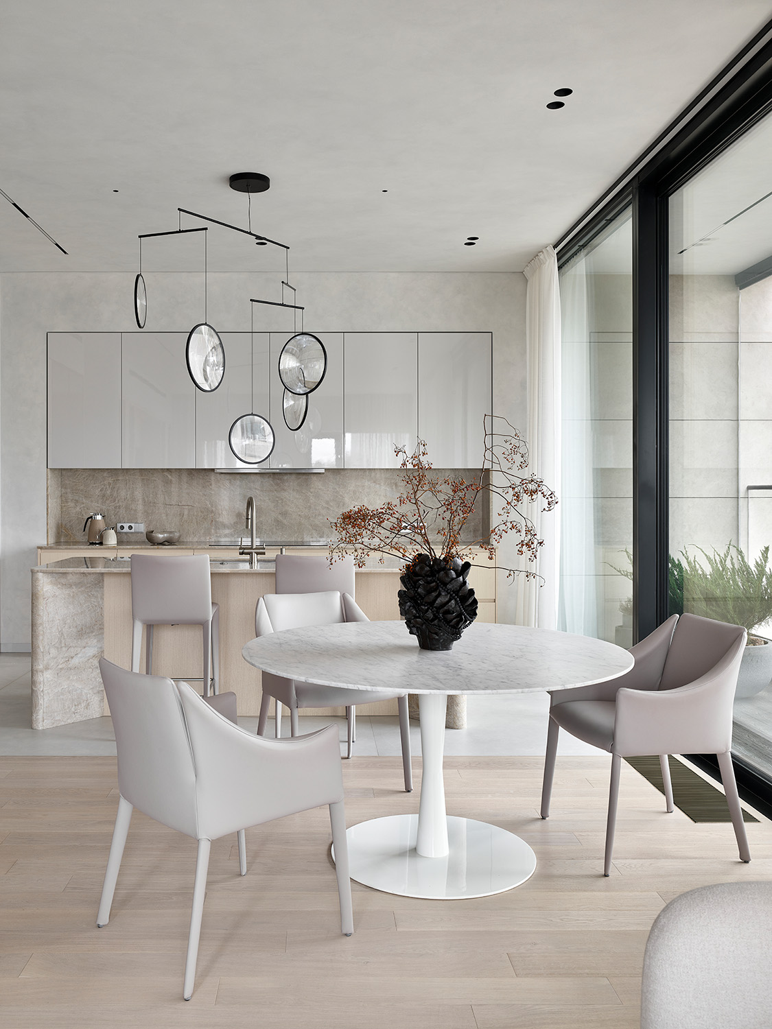 Функционально пространство разделено на зоны кухни-гостиной, главной спальни с гардеробной и ванной комнатой, детской, кабинета, входную и постирочную. Преимущества квартиры—панорамный вид на город и большая лоджия с выходом из гостиной. На лоджии решили создать зимний сад, и теперь природа словно стирает границы между интерьером и городом, а открытое, перетекающее пространство кухни-гостиной кажется еще просторнее.