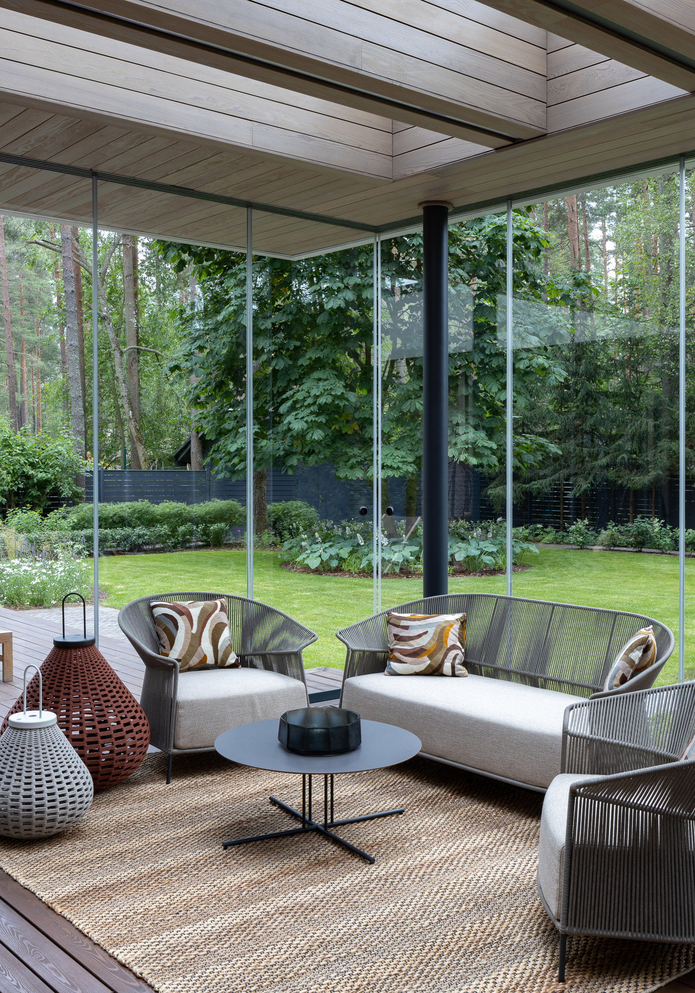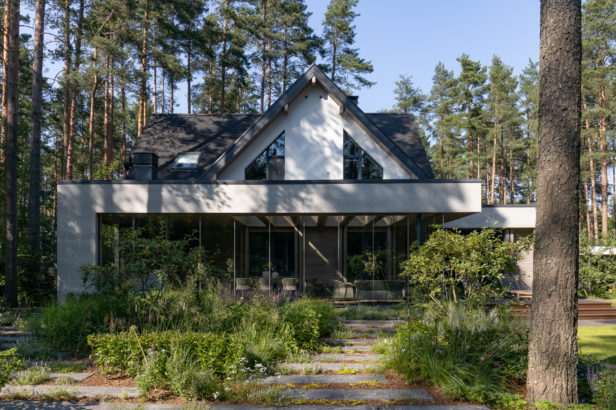 Реконструкция дома в курортном Комарово. При проектировании удалось сохранить дачную атмосферу, добавить современный комфорт и создать идеальное место для летнего отдыха. В итоге реконструкции появилась просторная терраса с зоной барбекю и зоной отдыха, ориентированная на живописный травяной сад и сосны, также была пристроена просторная кухня – столовая с выходом на террасу. На первом этаже - общественная зона и мастер-блок, на втором - каминная, гостевая, детская и кабинет.
