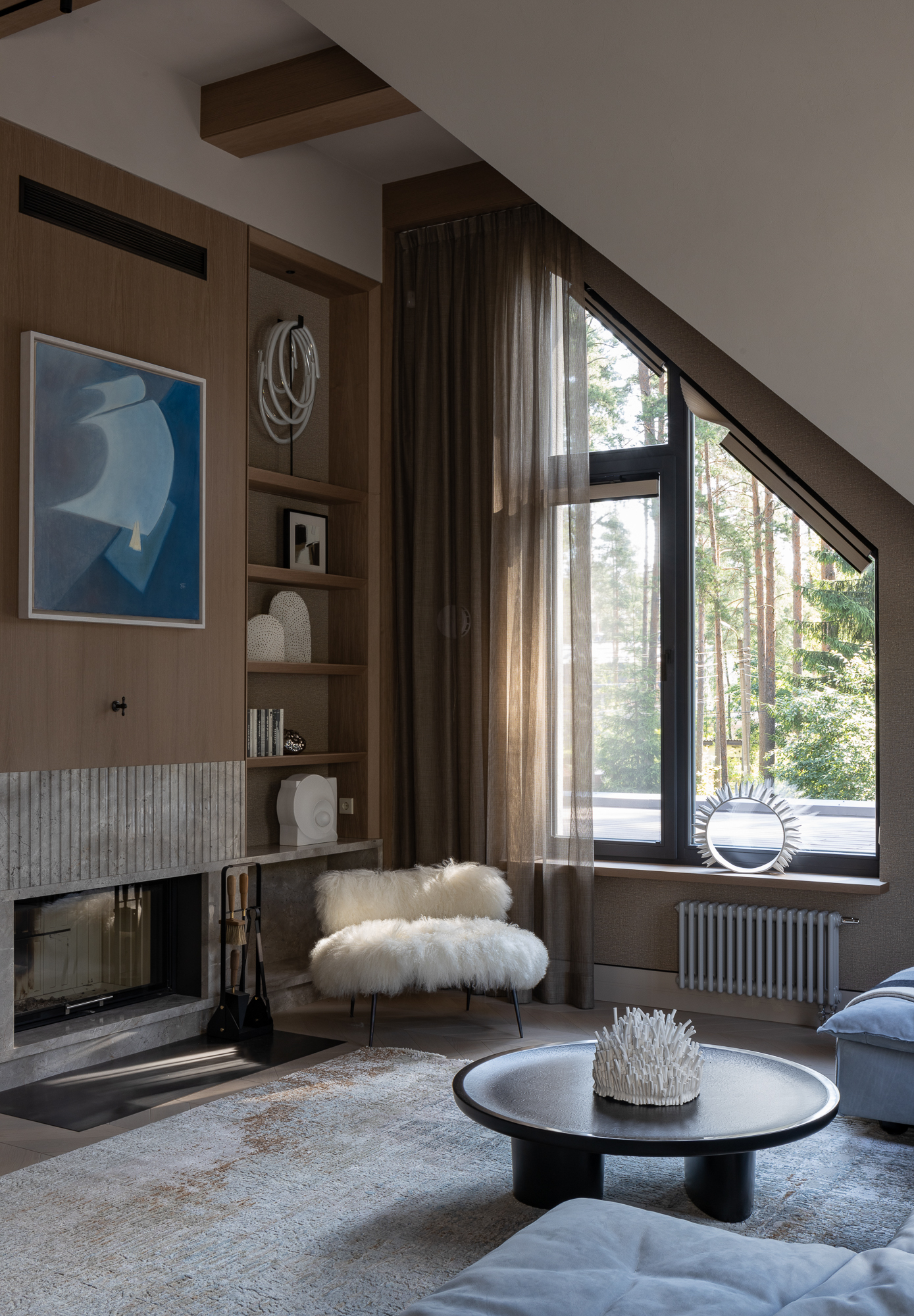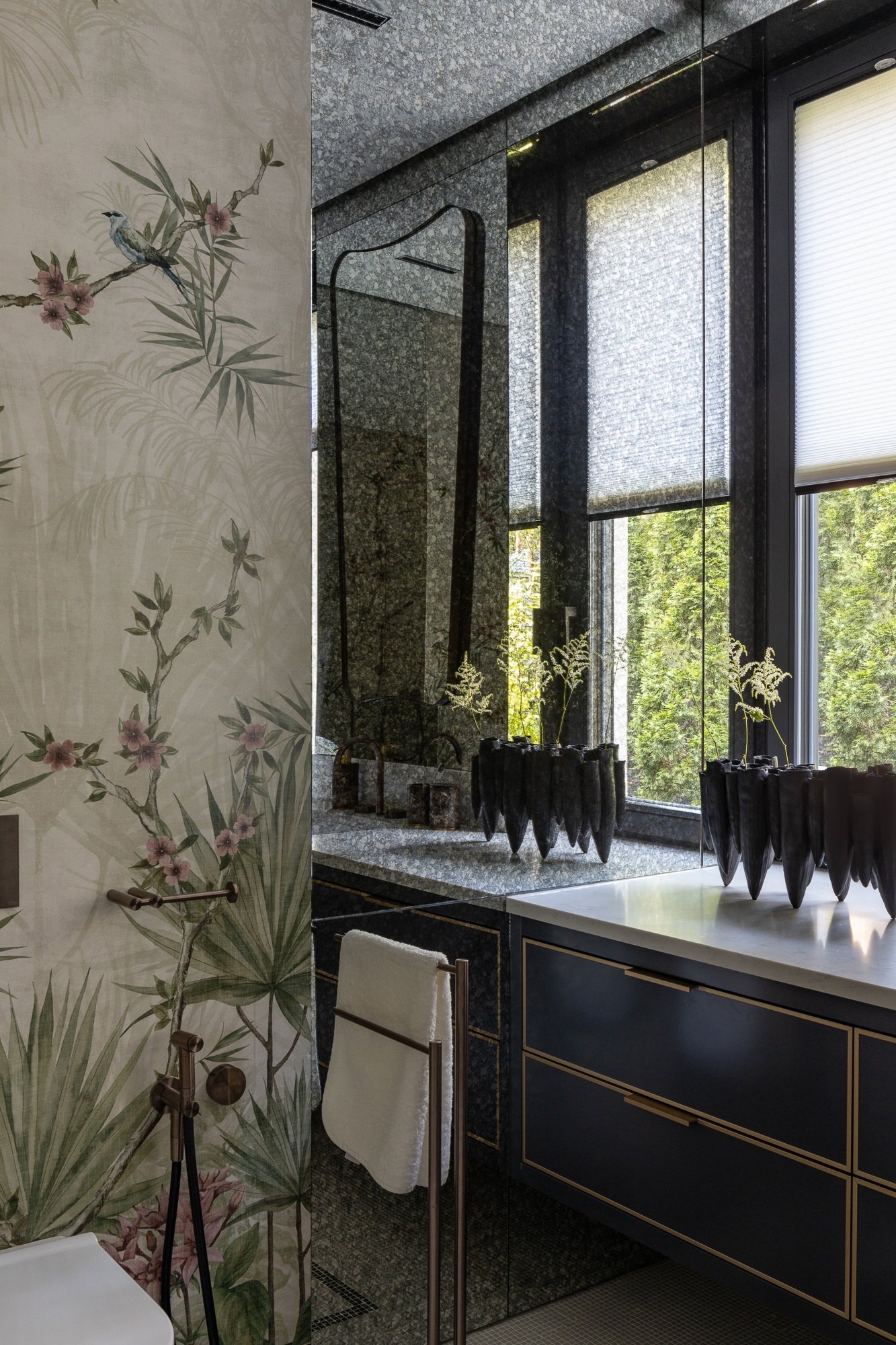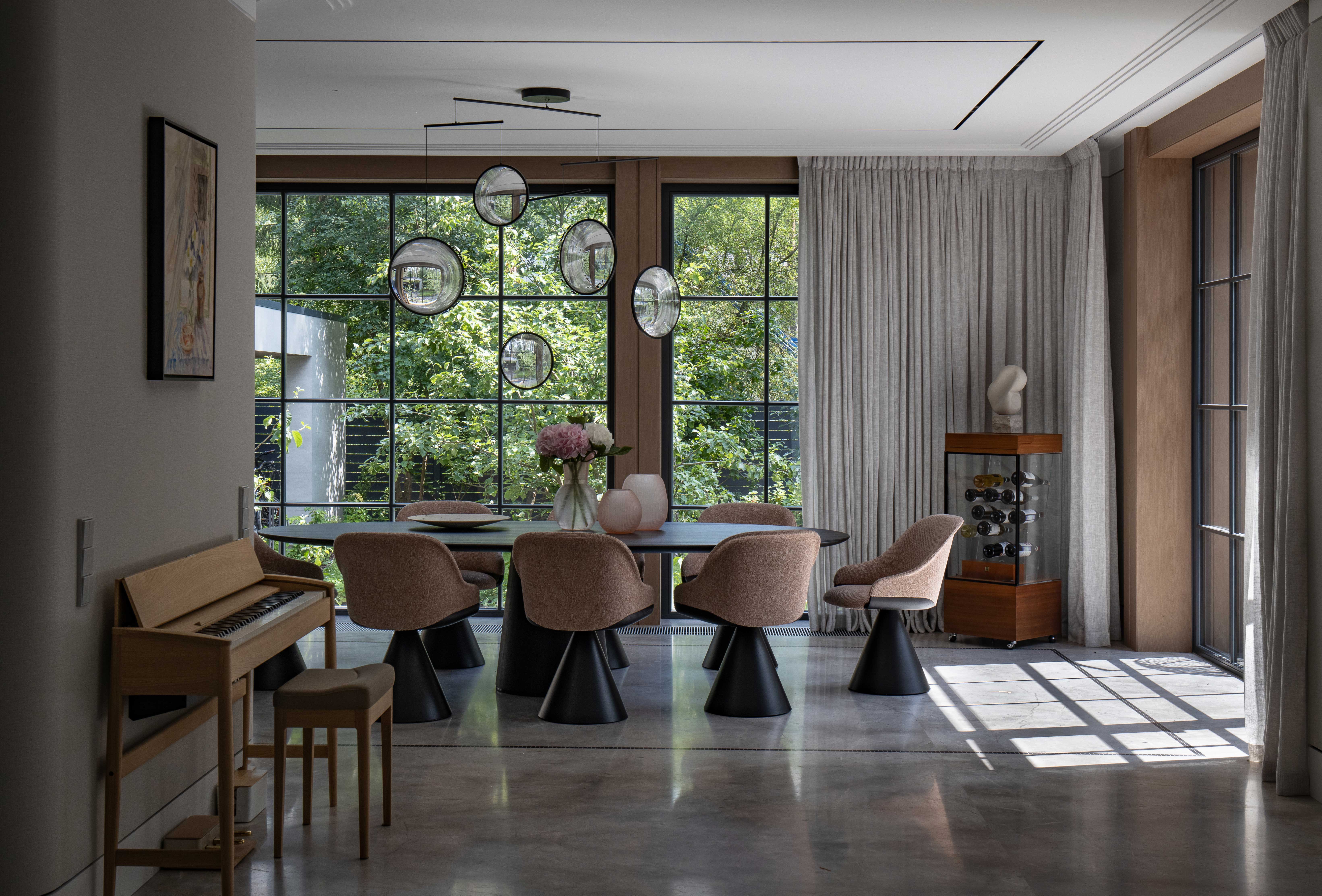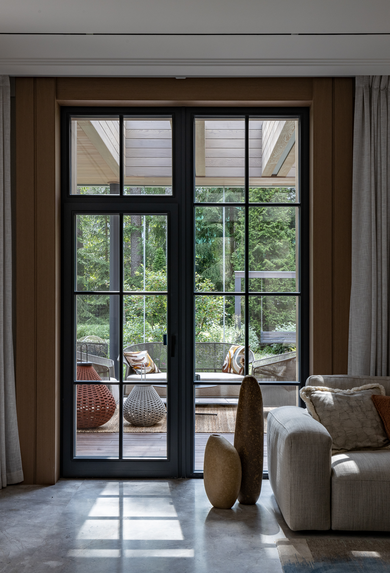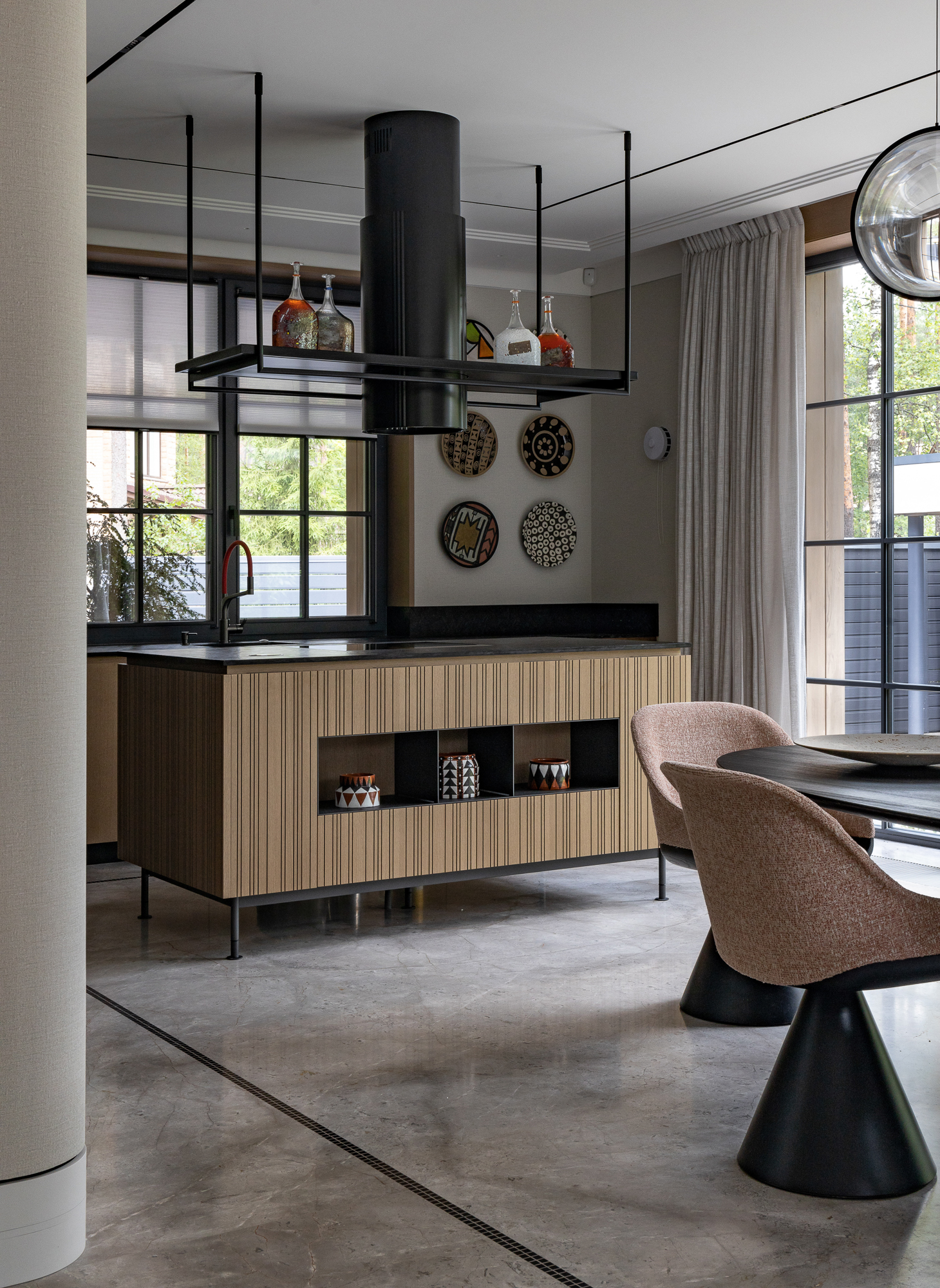В интерьере применен дуб с тонировкой в тон фасадам, текстильные обои, штукатурка, натуральный камень с интегрированной мозаикой. Для создания дачной атмосферы применены декоративные керамические элементы: глиняные кашпо – консоль в прихожей, этнические тарелки на стенах кухни, декоративные вазы. Помимо керамики дачное настроение задает мозаика с изображением маков по всем стенам гостевого санузла, керамогранит с цветочным принтом в мастер зоне. Мастер блок тотально залит зеленым цветом: этот оттенок повторился в текстильных обоях, ковролине и в драпировках штор, что создает летнее настроение круглый год и перекликается с кронами сосен за окнами.