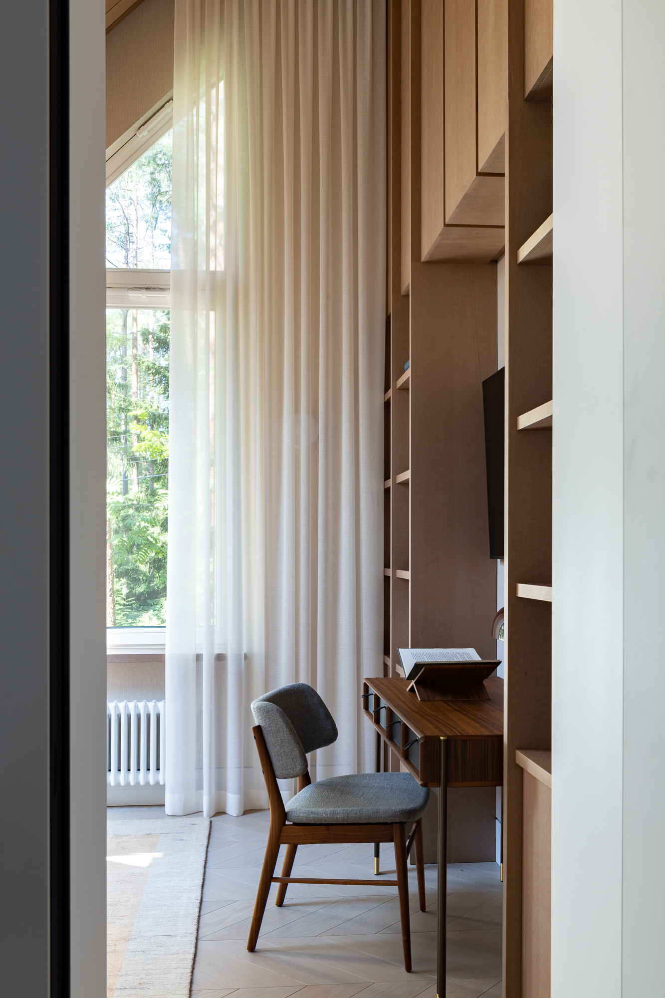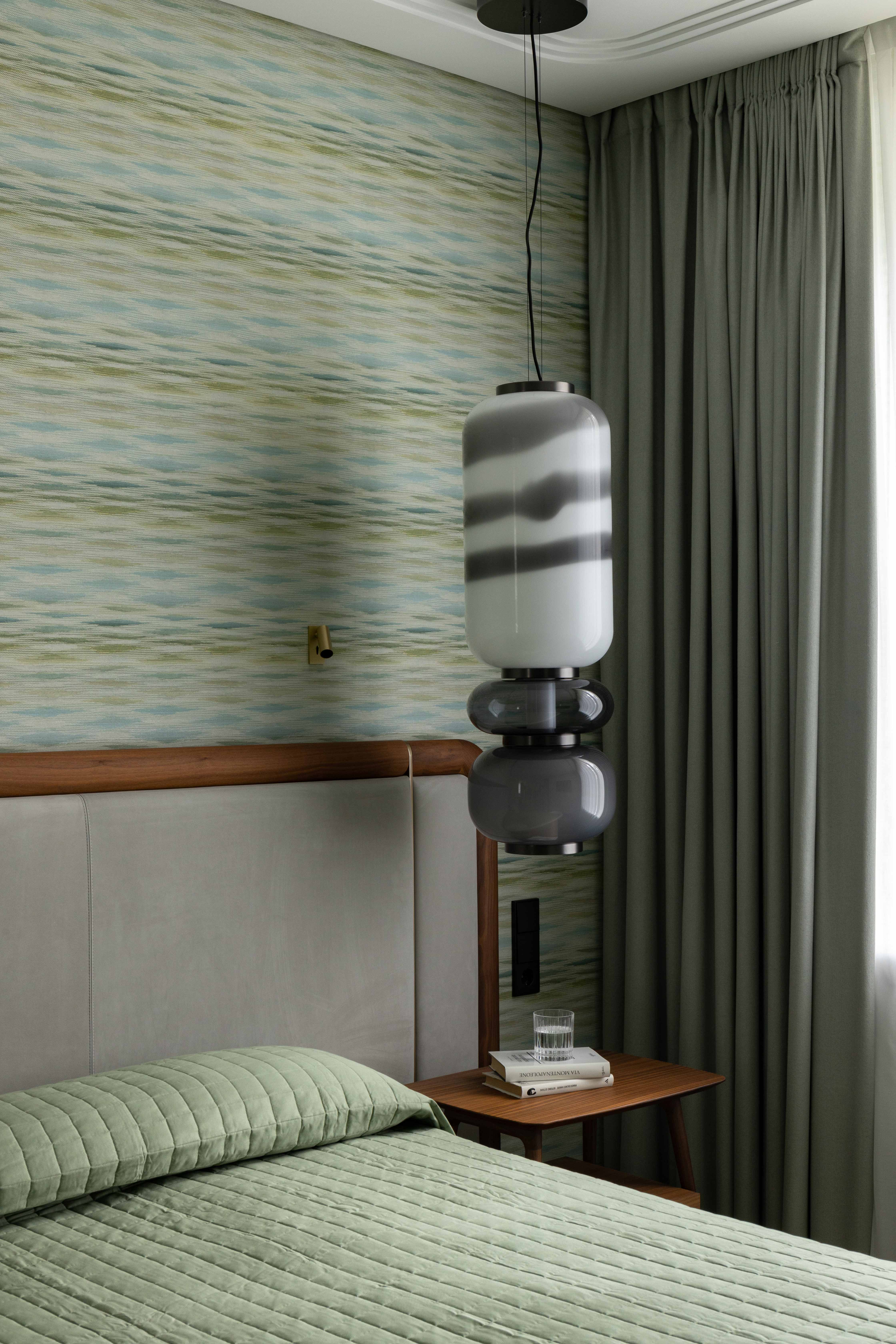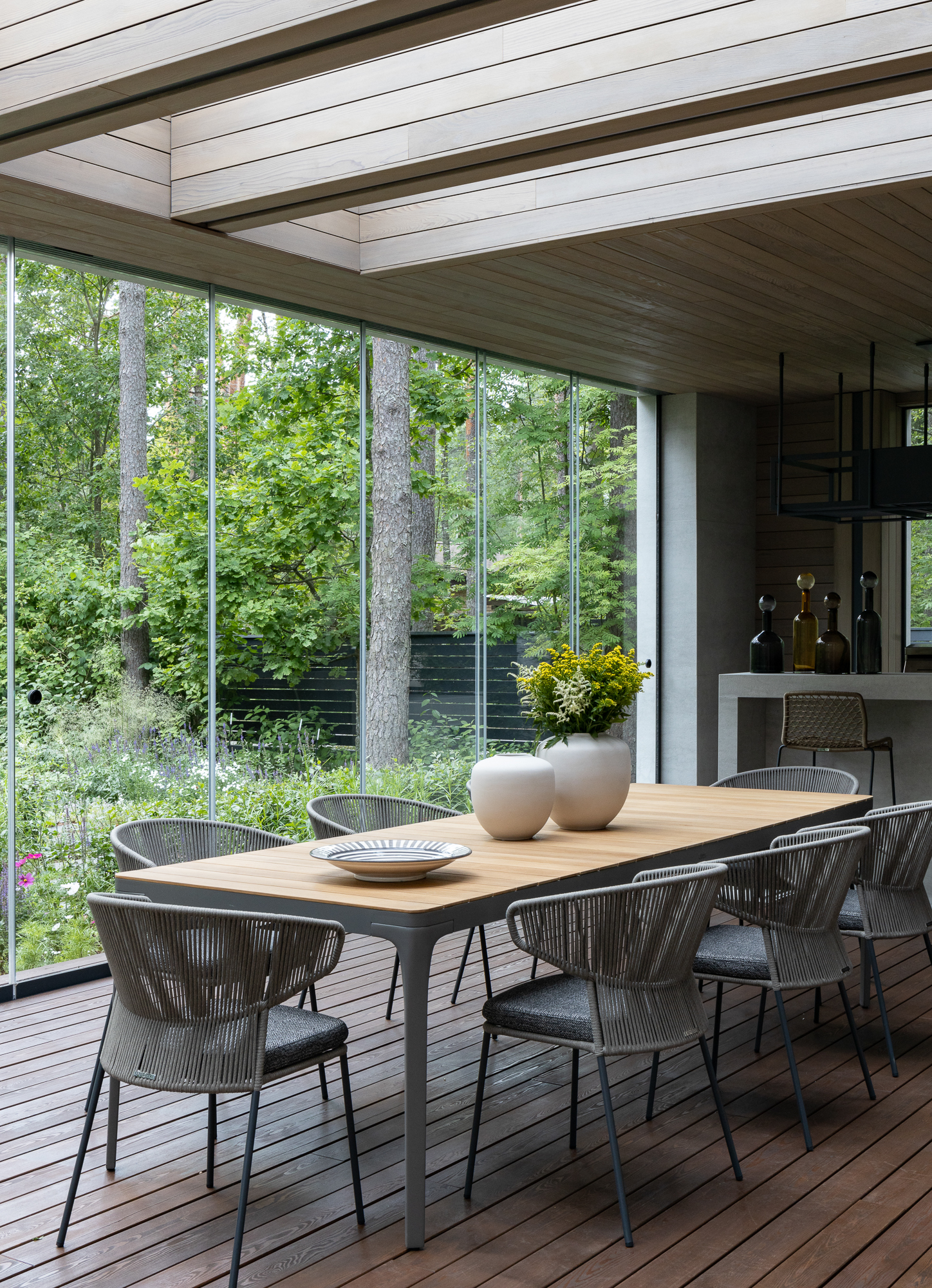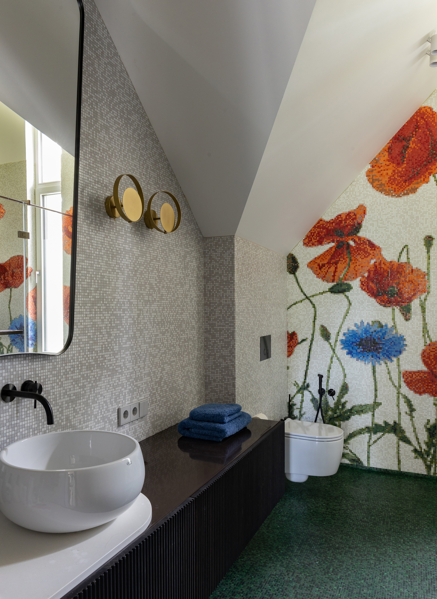 В интерьере применен дуб с тонировкой в тон фасадам, текстильные обои, штукатурка, натуральный камень с интегрированной мозаикой. Для создания дачной атмосферы применены декоративные керамические элементы: глиняные кашпо – консоль в прихожей, этнические тарелки на стенах кухни, декоративные вазы. Помимо керамики дачное настроение задает мозаика с изображением маков по всем стенам гостевого санузла, керамогранит с цветочным принтом в мастер зоне. Мастер блок тотально залит зеленым цветом: этот оттенок повторился в текстильных обоях, ковролине и в драпировках штор, что создает летнее настроение круглый год и перекликается с кронами сосен за окнами.