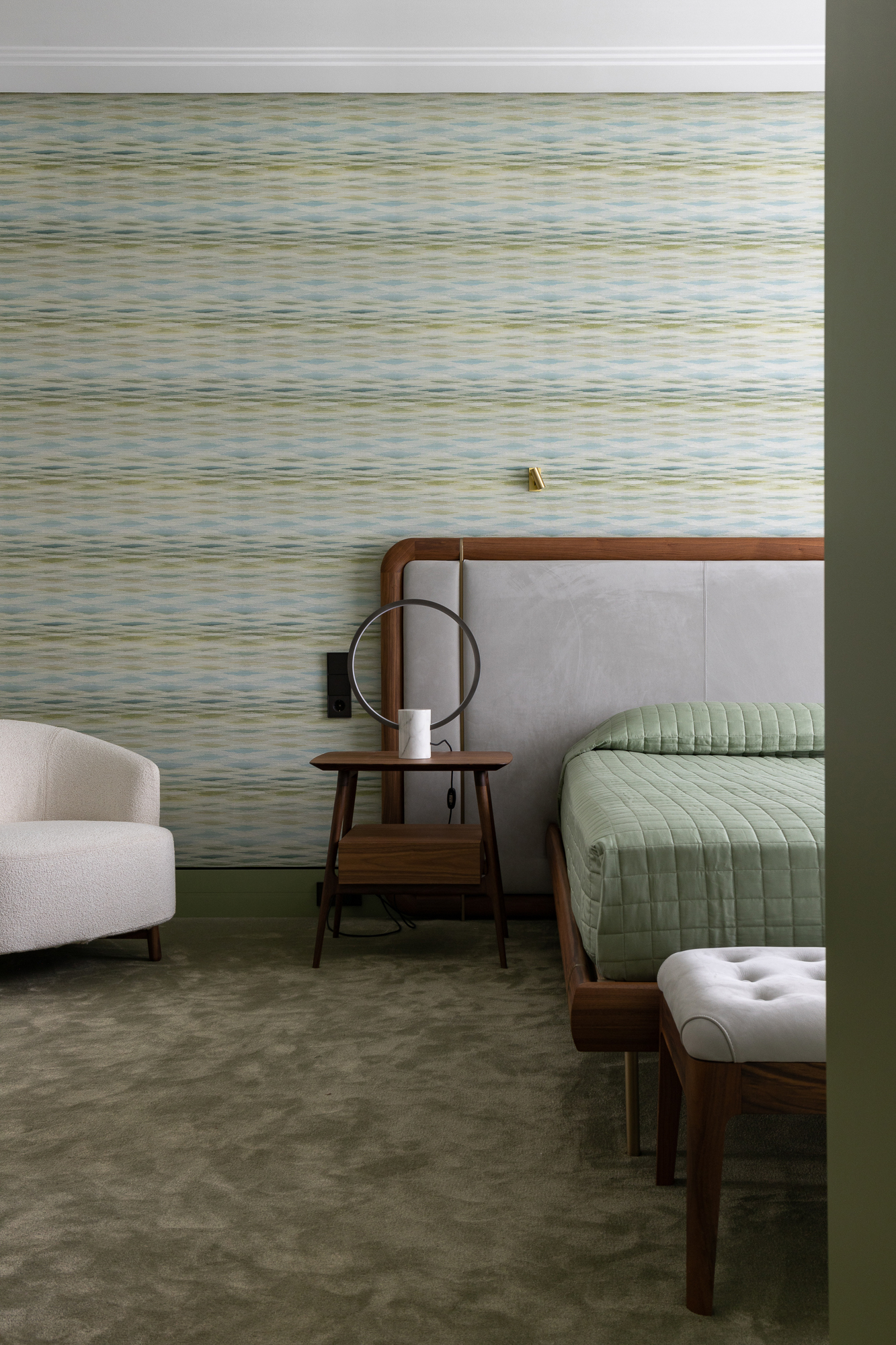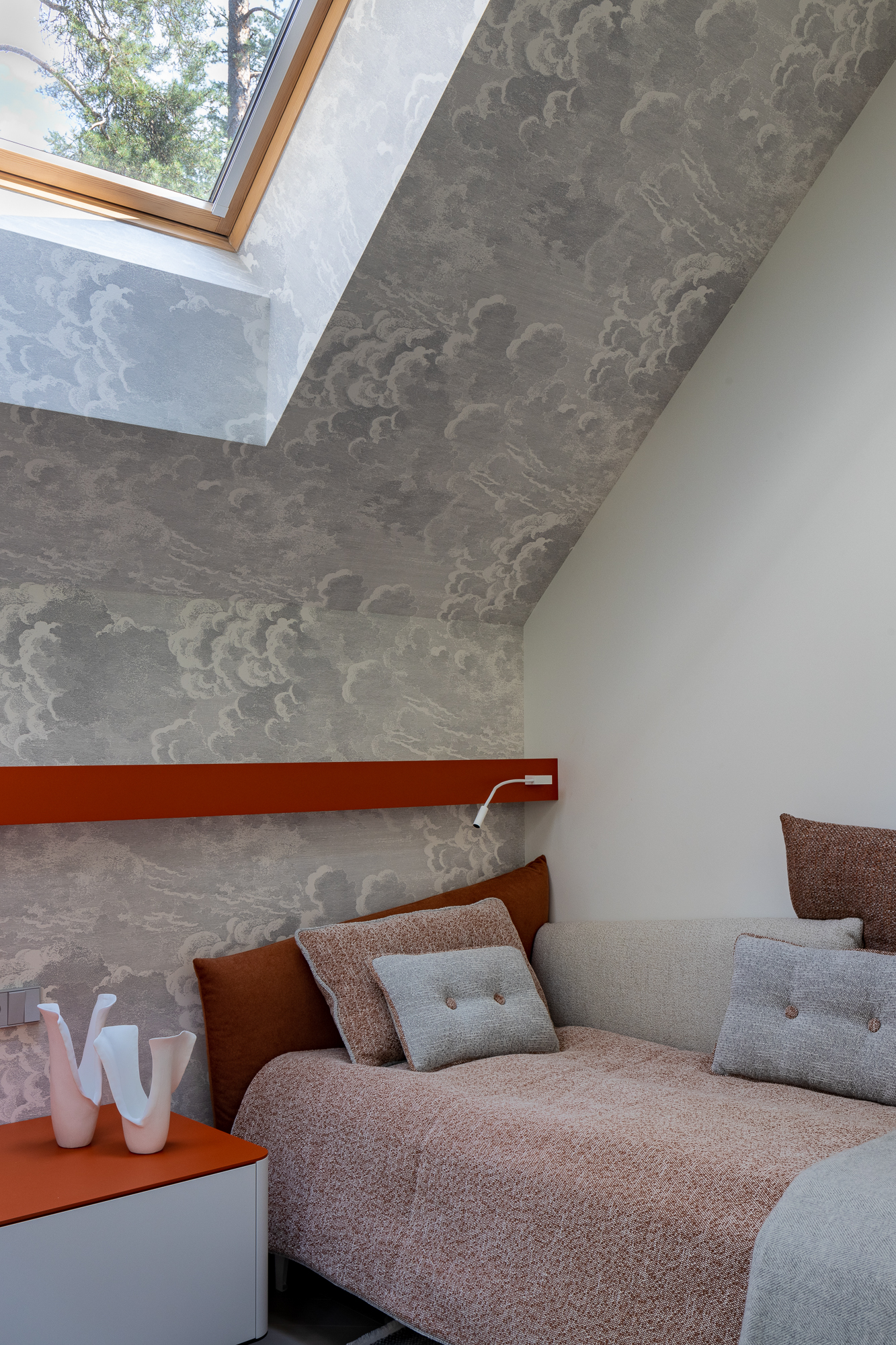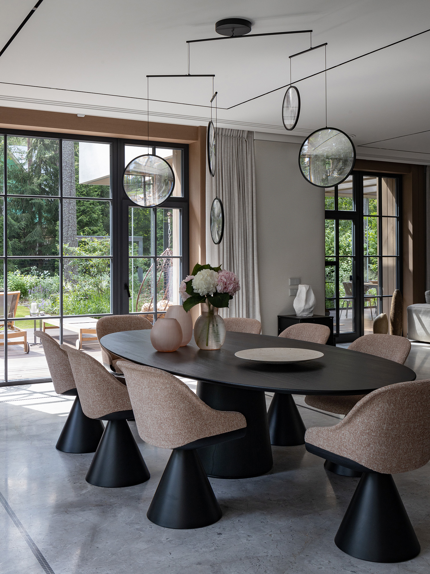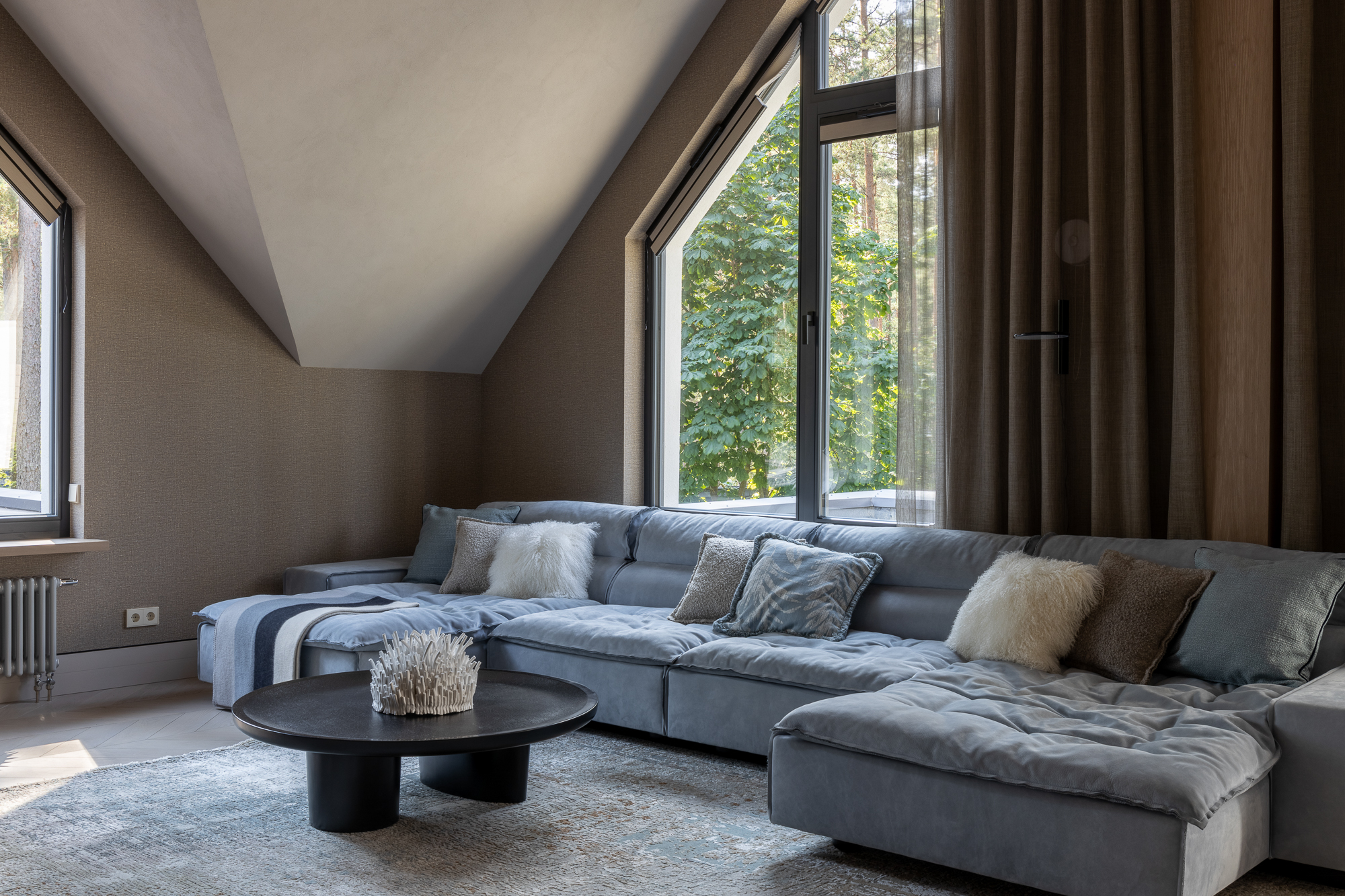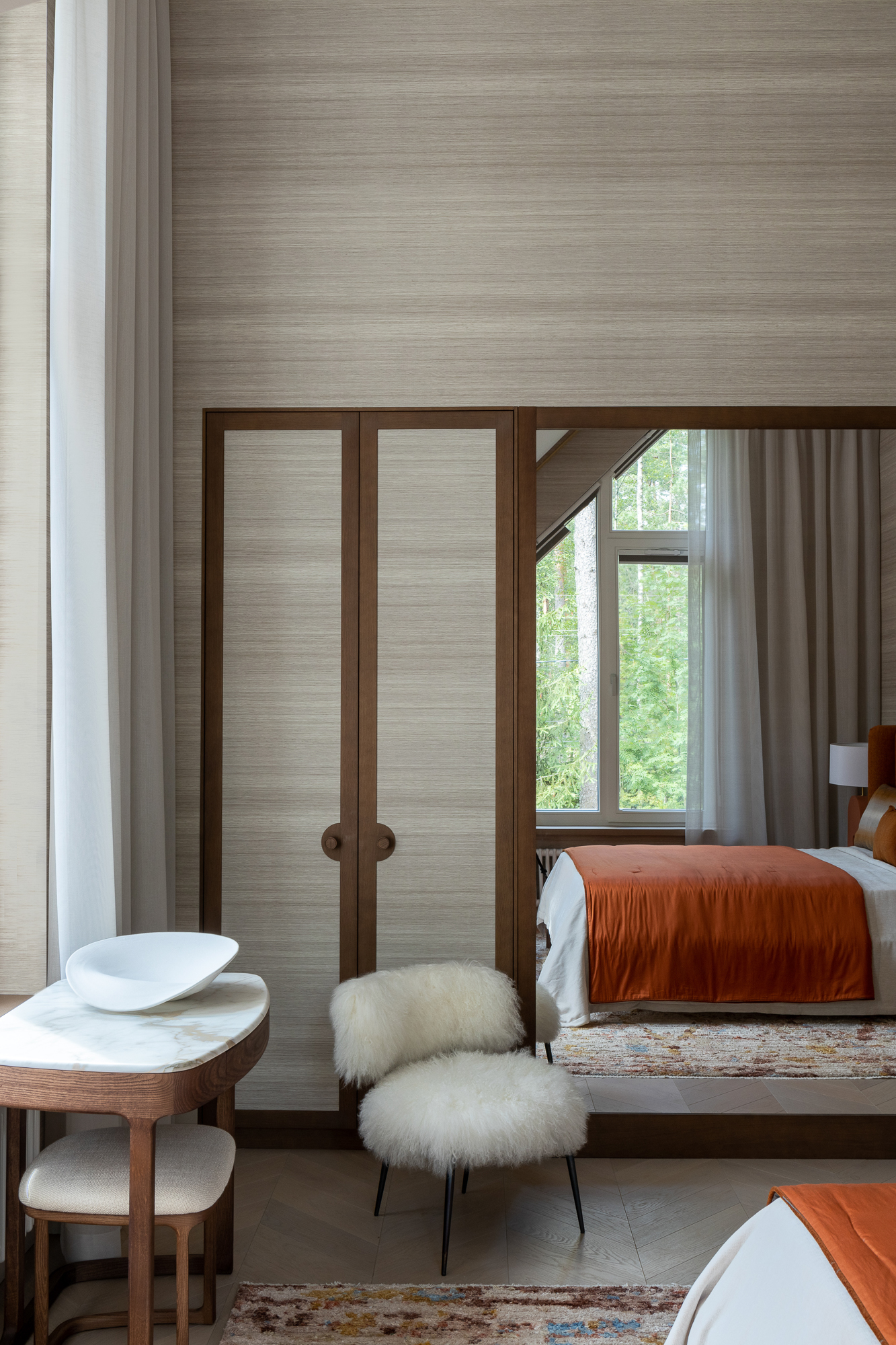 В интерьере применен дуб с тонировкой в тон фасадам, текстильные обои, штукатурка, натуральный камень с интегрированной мозаикой. Для создания дачной атмосферы применены декоративные керамические элементы: глиняные кашпо – консоль в прихожей, этнические тарелки на стенах кухни, декоративные вазы. Помимо керамики дачное настроение задает мозаика с изображением маков по всем стенам гостевого санузла, керамогранит с цветочным принтом в мастер зоне. Мастер блок тотально залит зеленым цветом: этот оттенок повторился в текстильных обоях, ковролине и в драпировках штор, что создает летнее настроение круглый год и перекликается с кронами сосен за окнами.