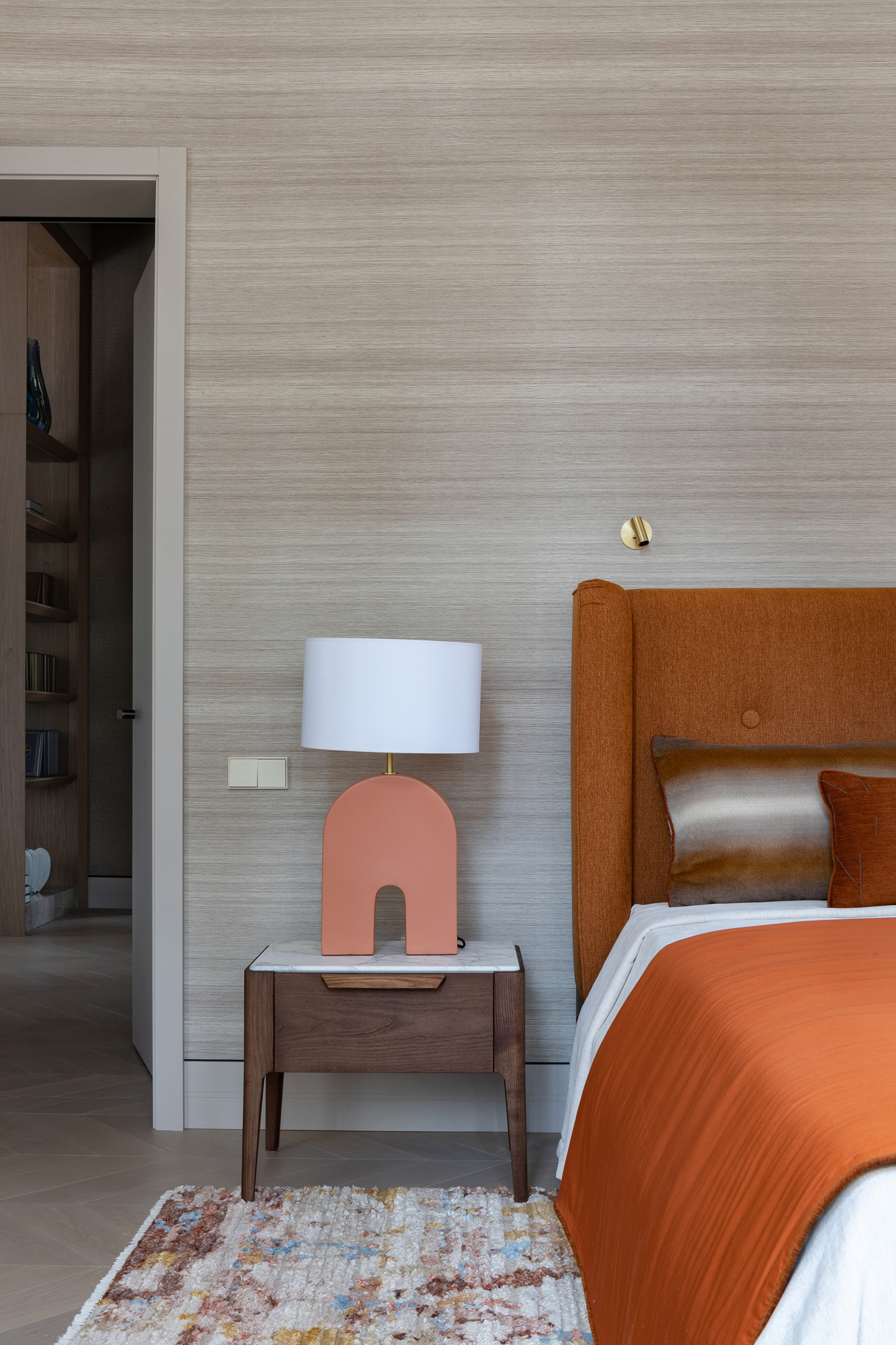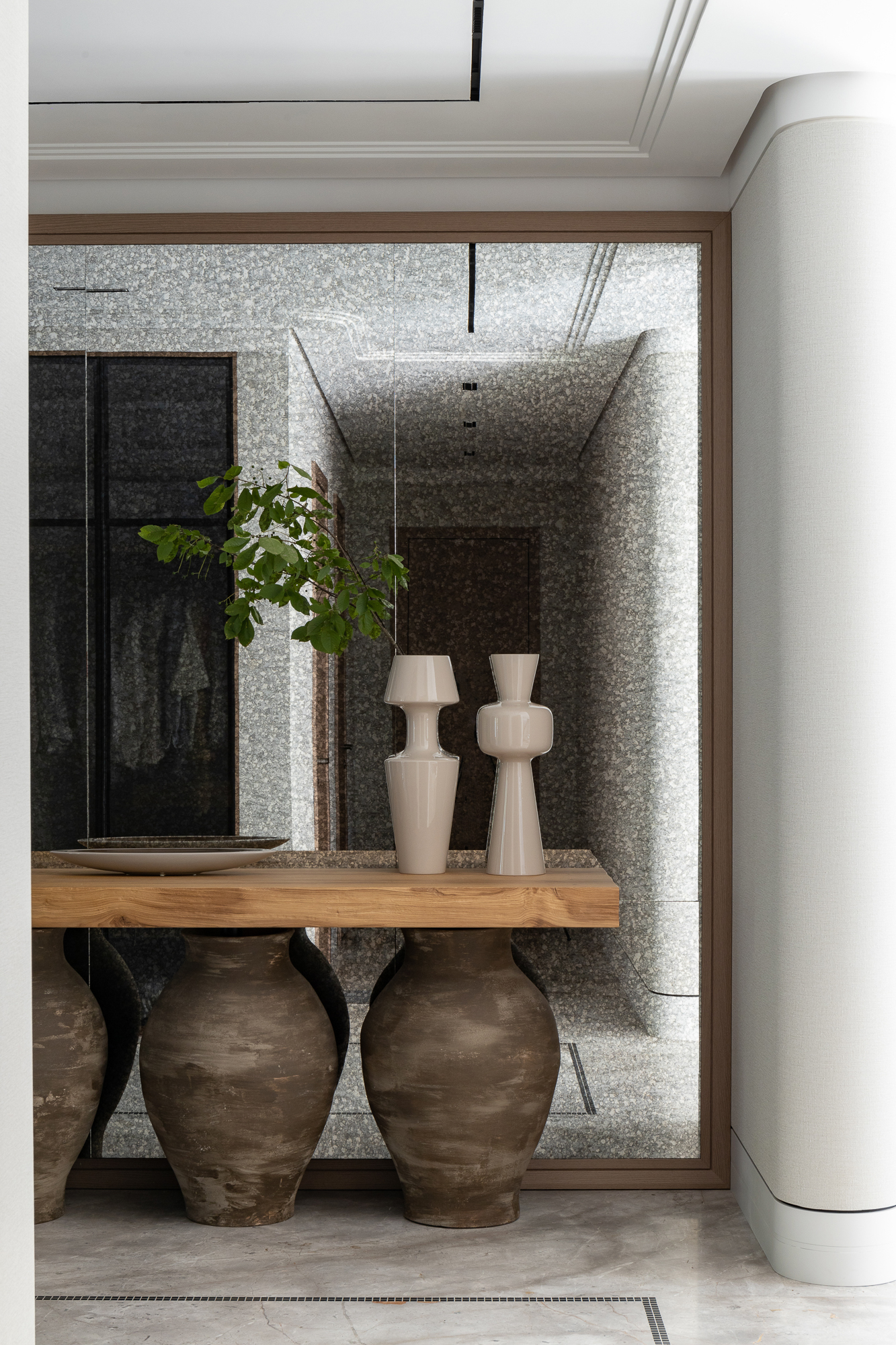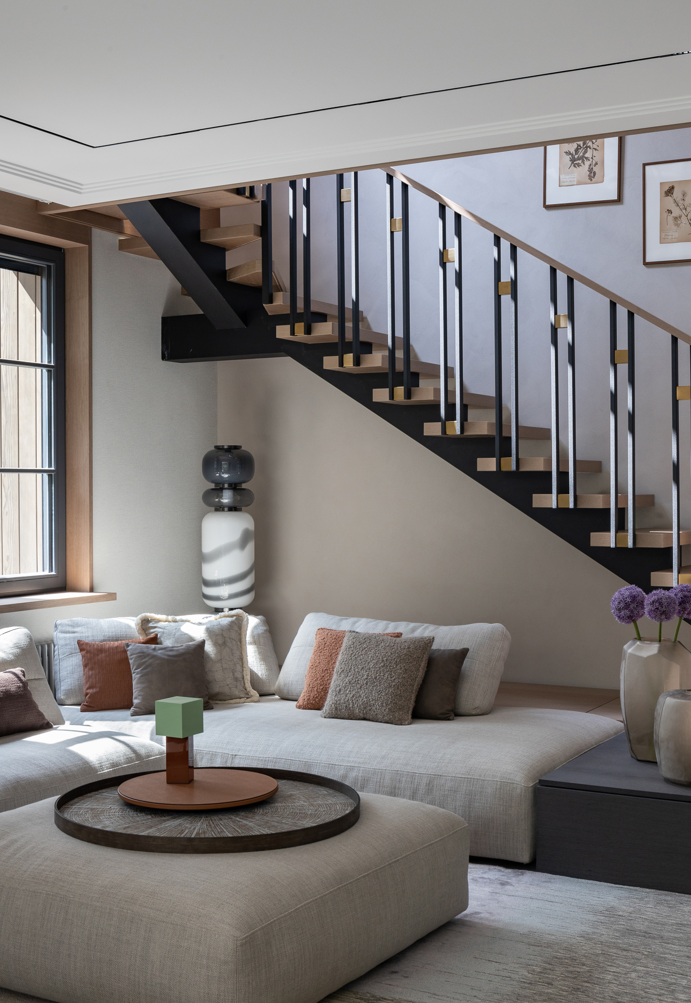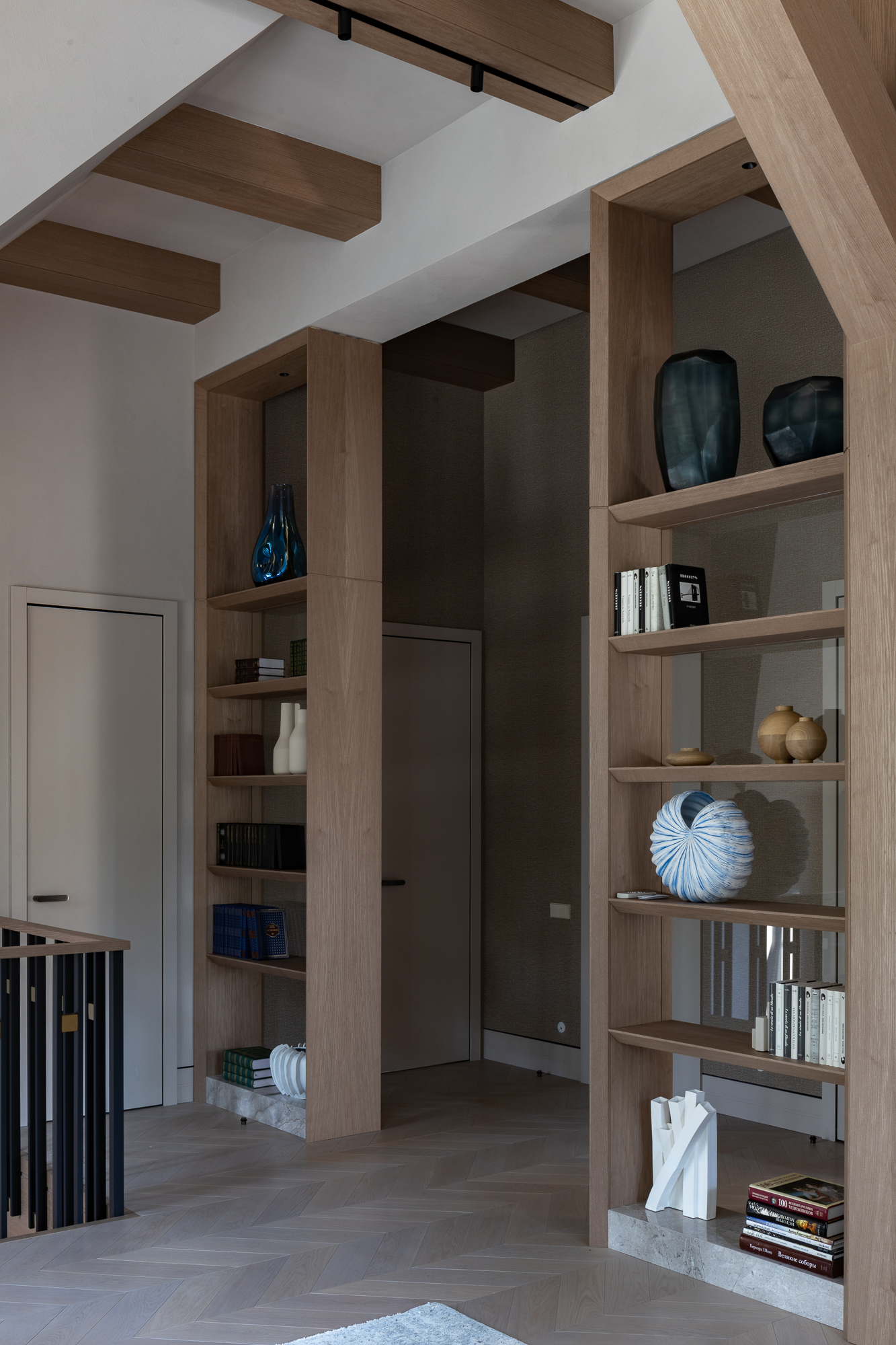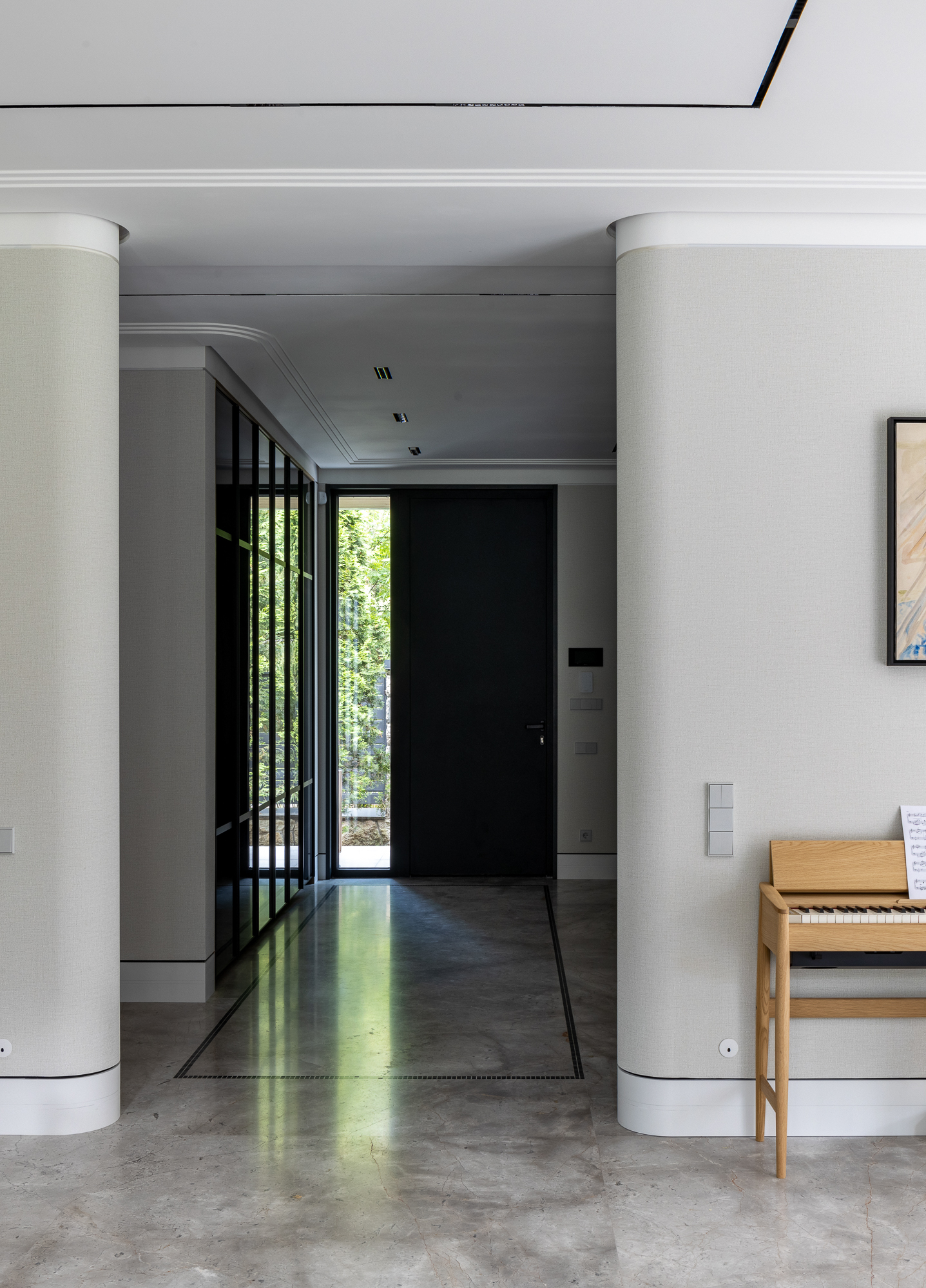 В интерьере применен дуб с тонировкой в тон фасадам, текстильные обои, штукатурка, натуральный камень с интегрированной мозаикой. Для создания дачной атмосферы применены декоративные керамические элементы: глиняные кашпо – консоль в прихожей, этнические тарелки на стенах кухни, декоративные вазы. Помимо керамики дачное настроение задает мозаика с изображением маков по всем стенам гостевого санузла, керамогранит с цветочным принтом в мастер зоне. Мастер блок тотально залит зеленым цветом: этот оттенок повторился в текстильных обоях, ковролине и в драпировках штор, что создает летнее настроение круглый год и перекликается с кронами сосен за окнами.