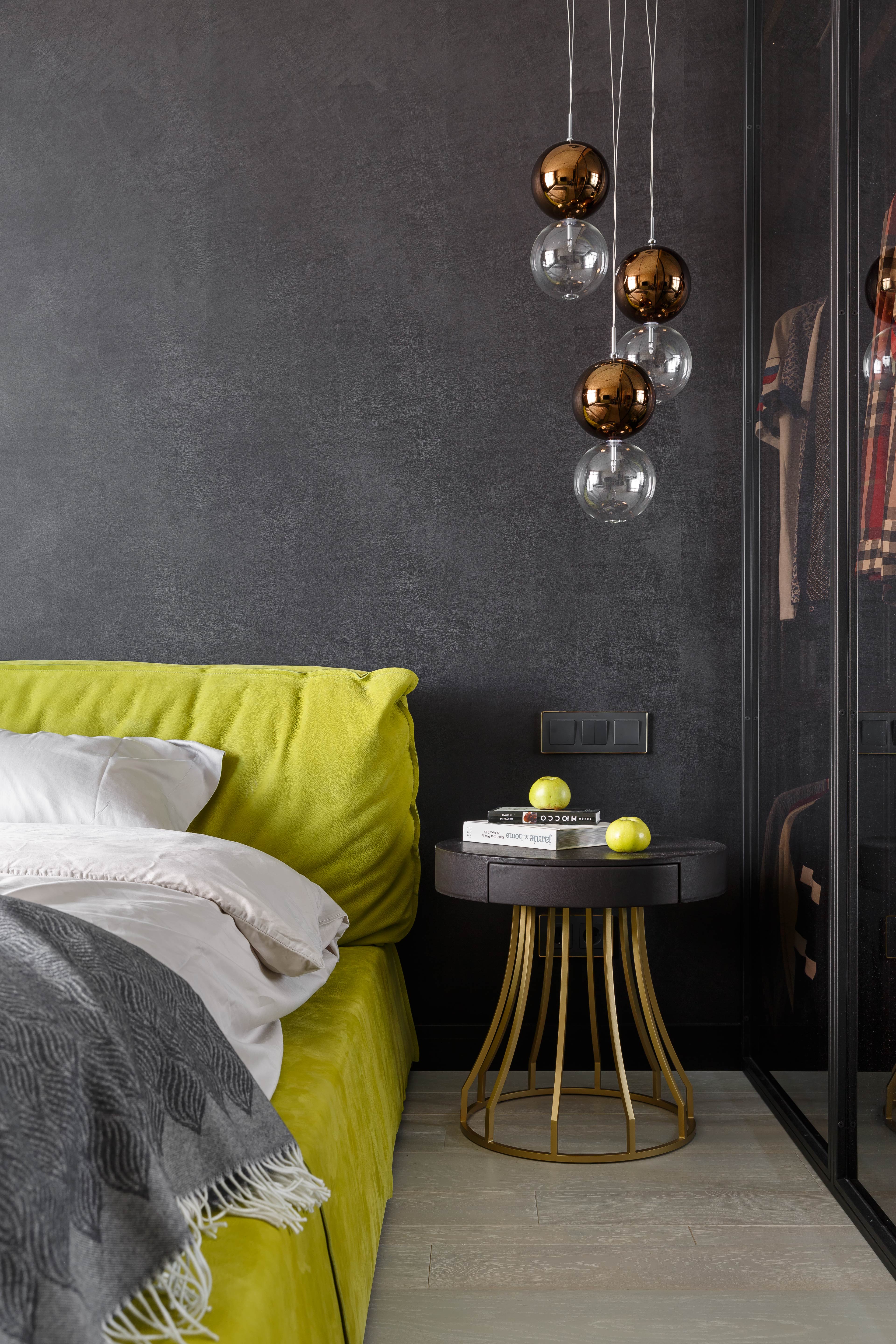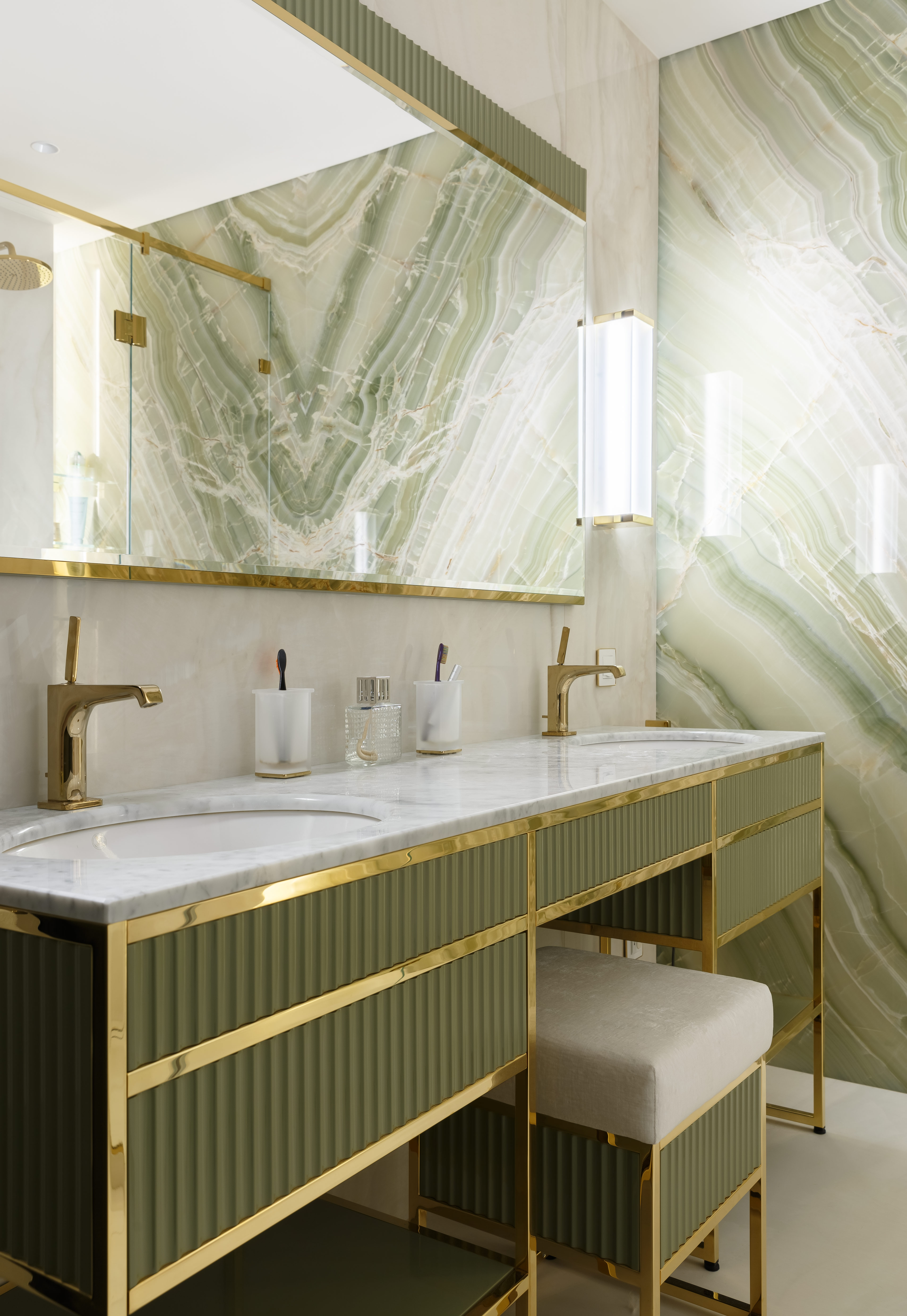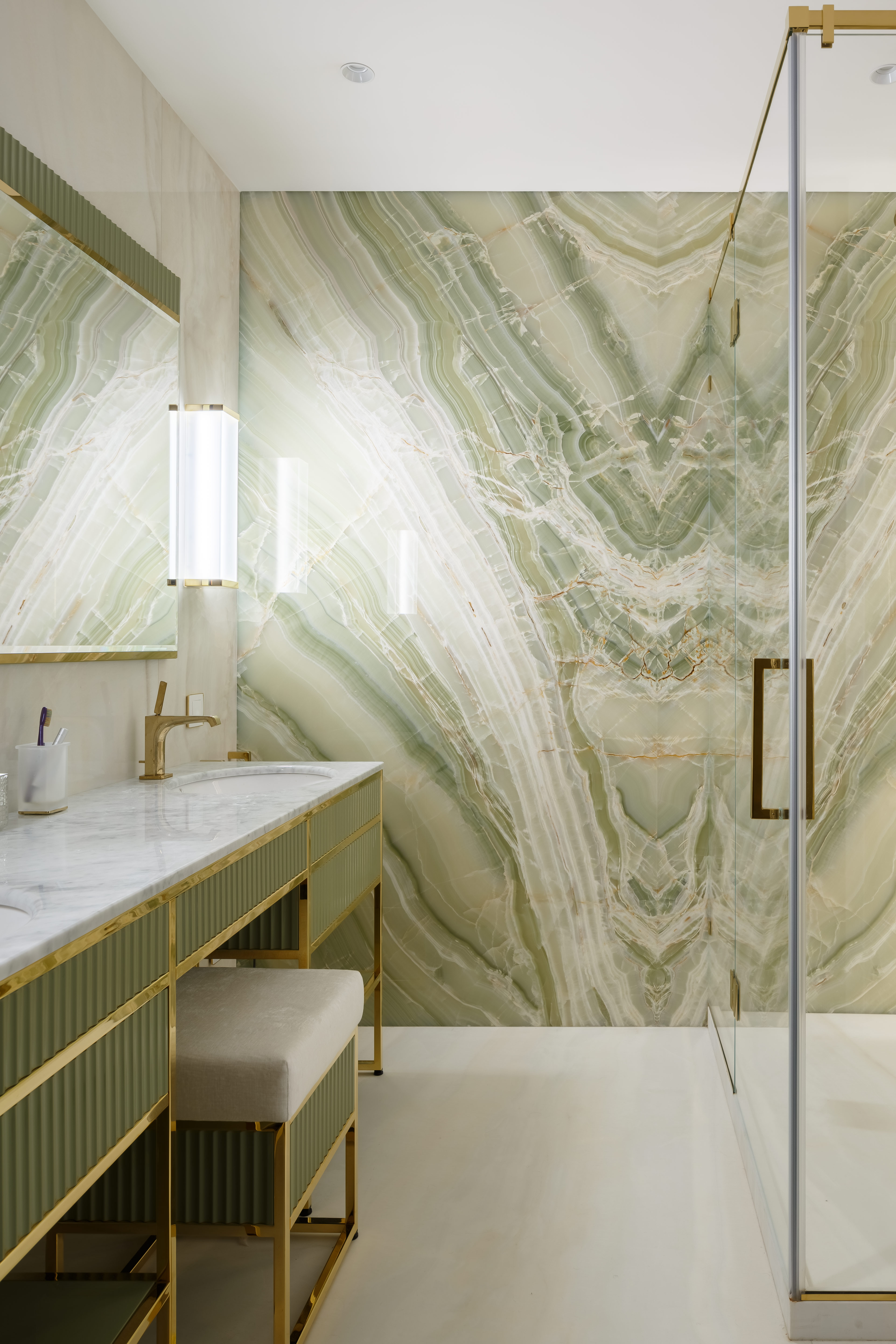Мастер-блок включает в себя спальню с гардеробной, скрытой за затемненным стеклом, и отдельную ванную комнату. В оформлении использованы оттенки зеленого: кровать фисташкового оттенка в спальне, мебель для ванной и стена из оникса оливково-зеленого цвета Jade Green. Детская комната и прилегающий санузел, подобно родительскому блоку, выдержаны в единой цветовой гамме, построенной на оттенках белого и василькового.
