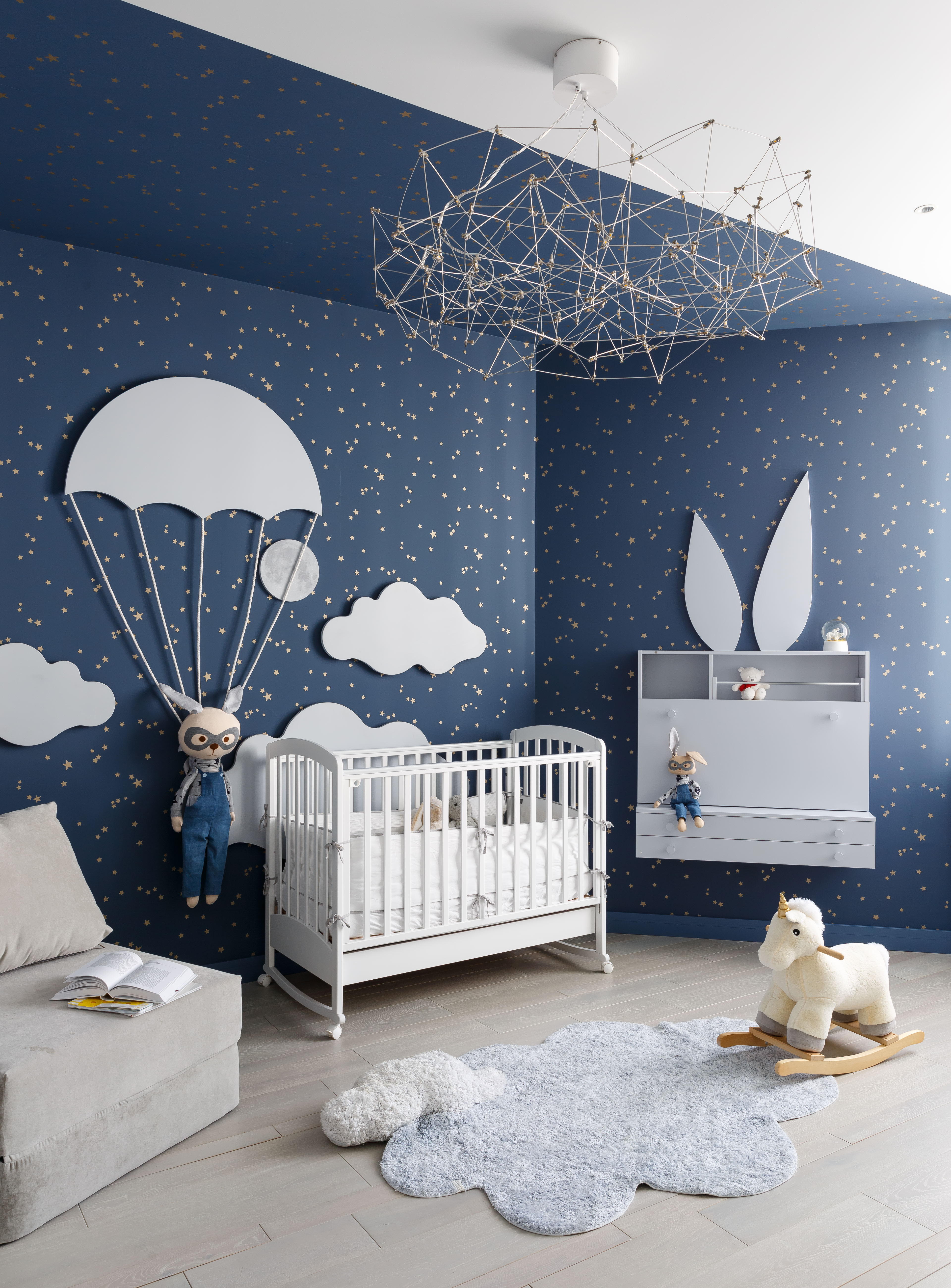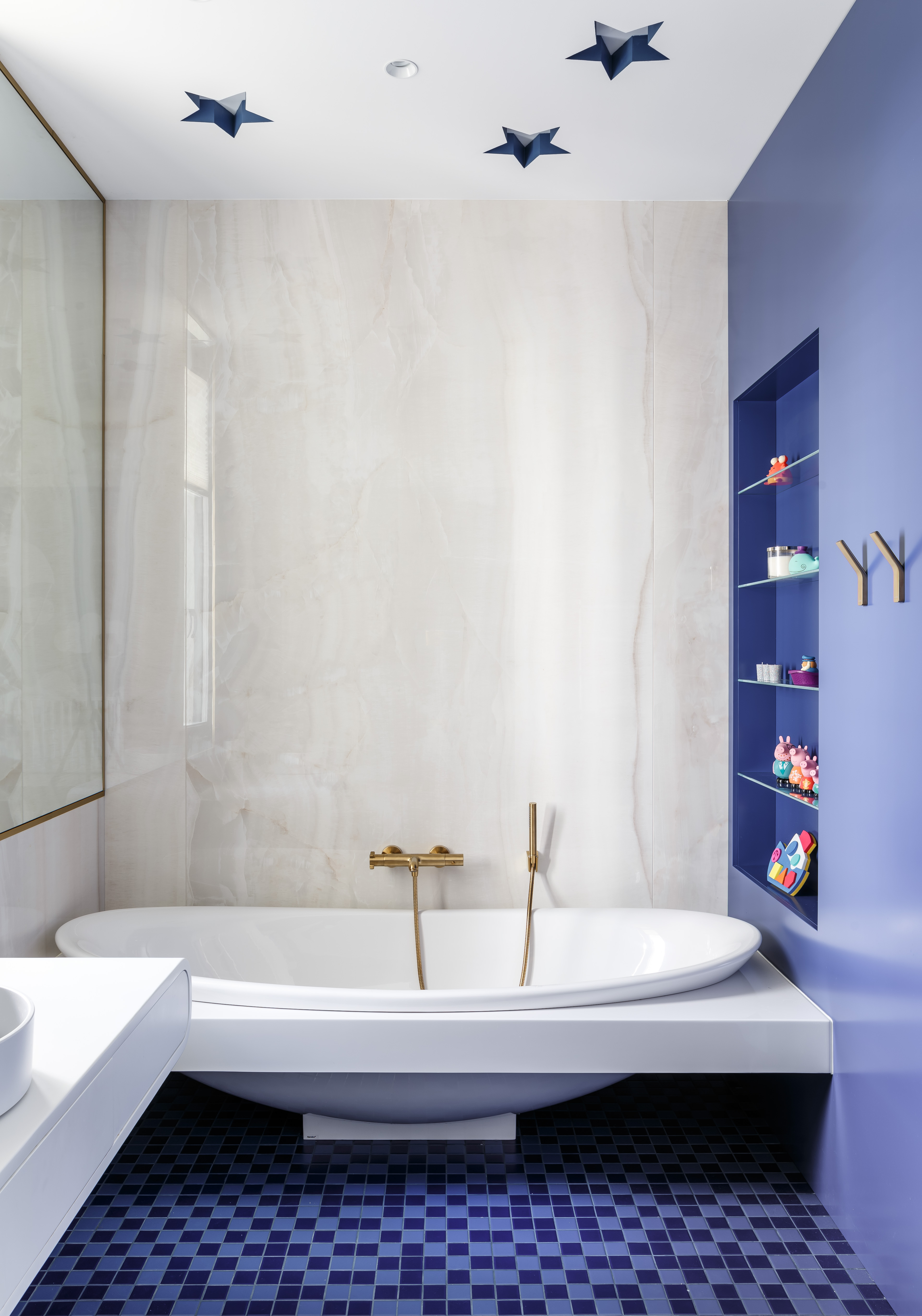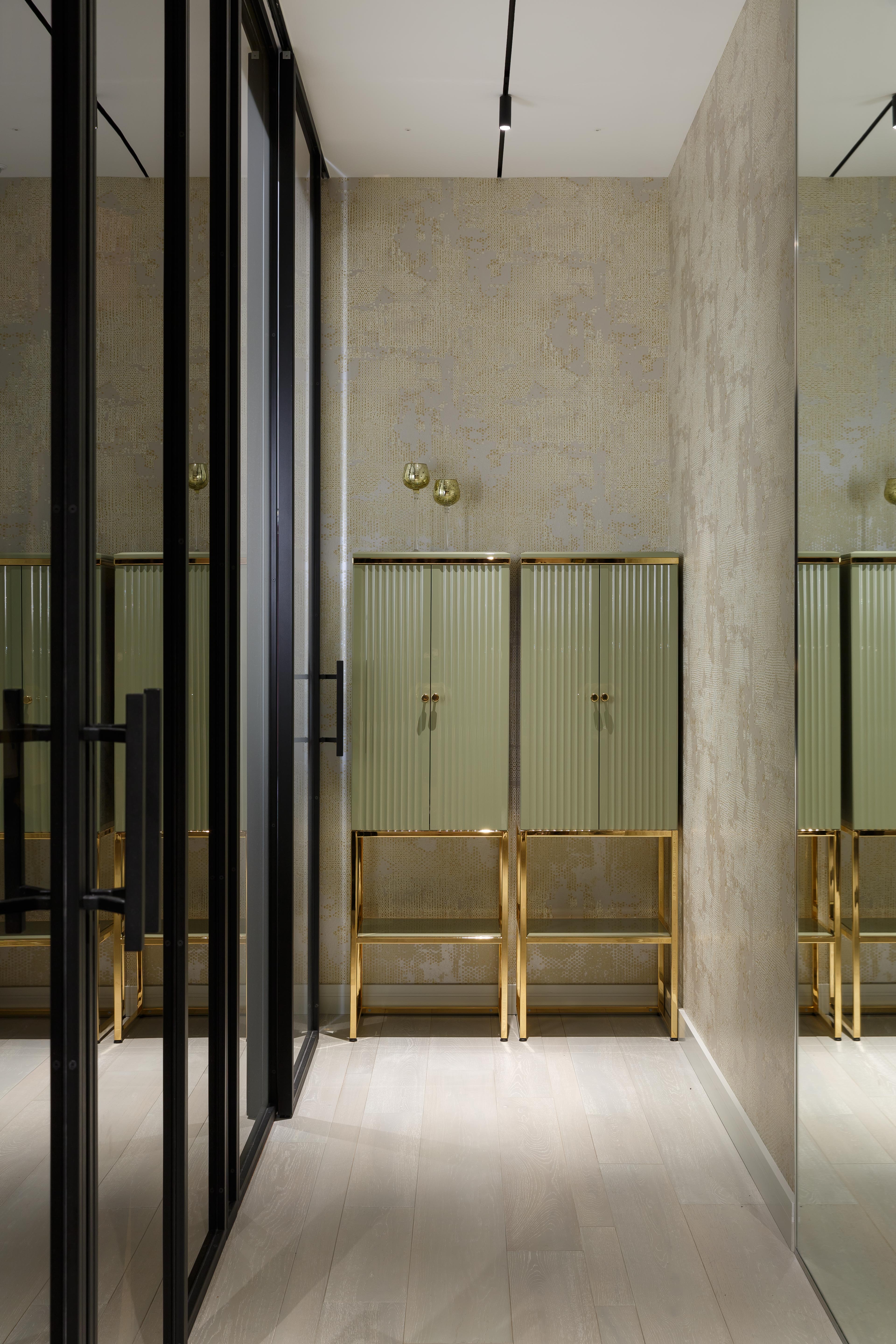 Мастер-блок включает в себя спальню с гардеробной, скрытой за затемненным стеклом, и отдельную ванную комнату. В оформлении использованы оттенки зеленого: кровать фисташкового оттенка в спальне, мебель для ванной и стена из оникса оливково-зеленого цвета Jade Green. Детская комната и прилегающий санузел, подобно родительскому блоку, выдержаны в единой цветовой гамме, построенной на оттенках белого и василькового.