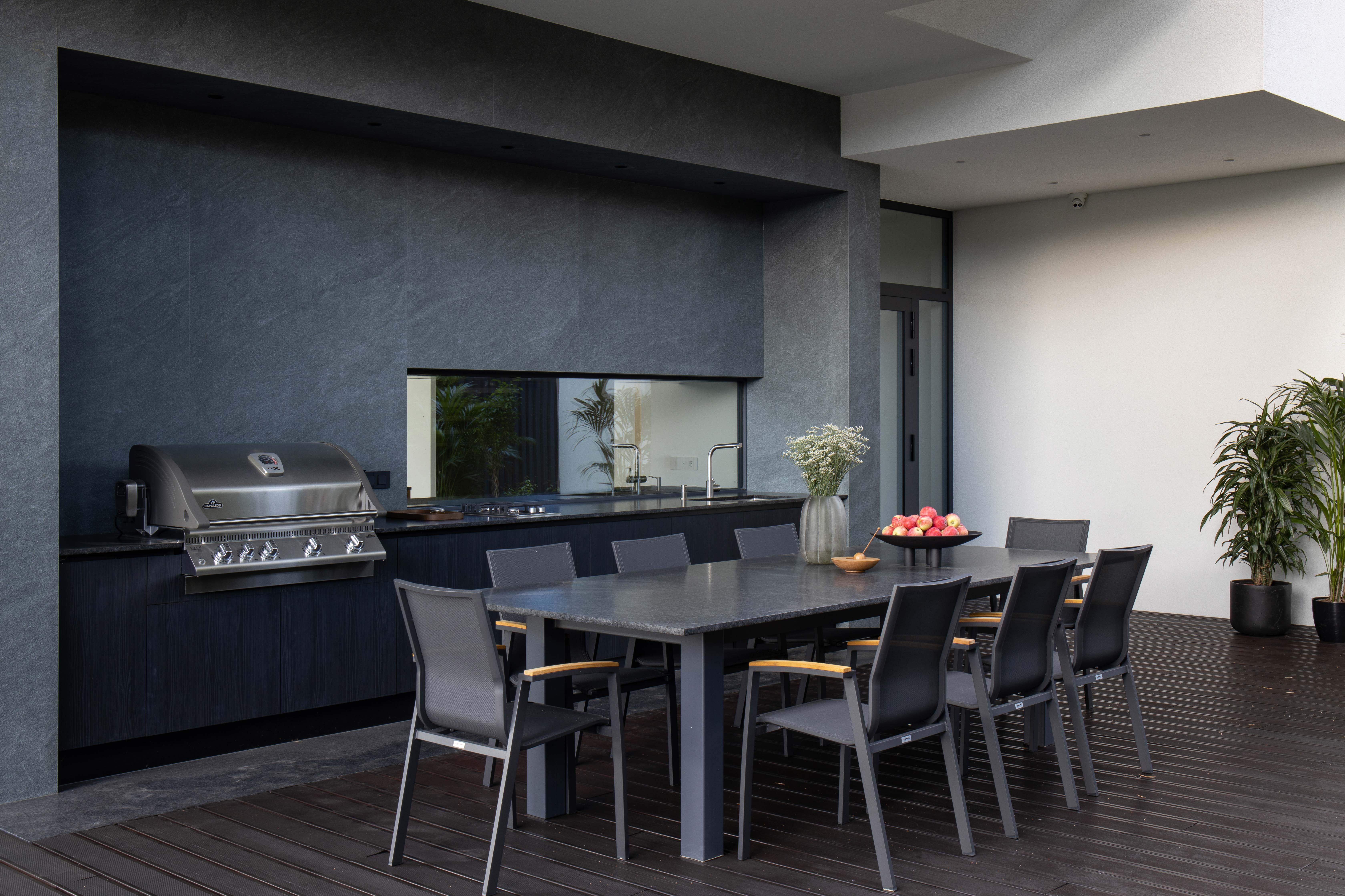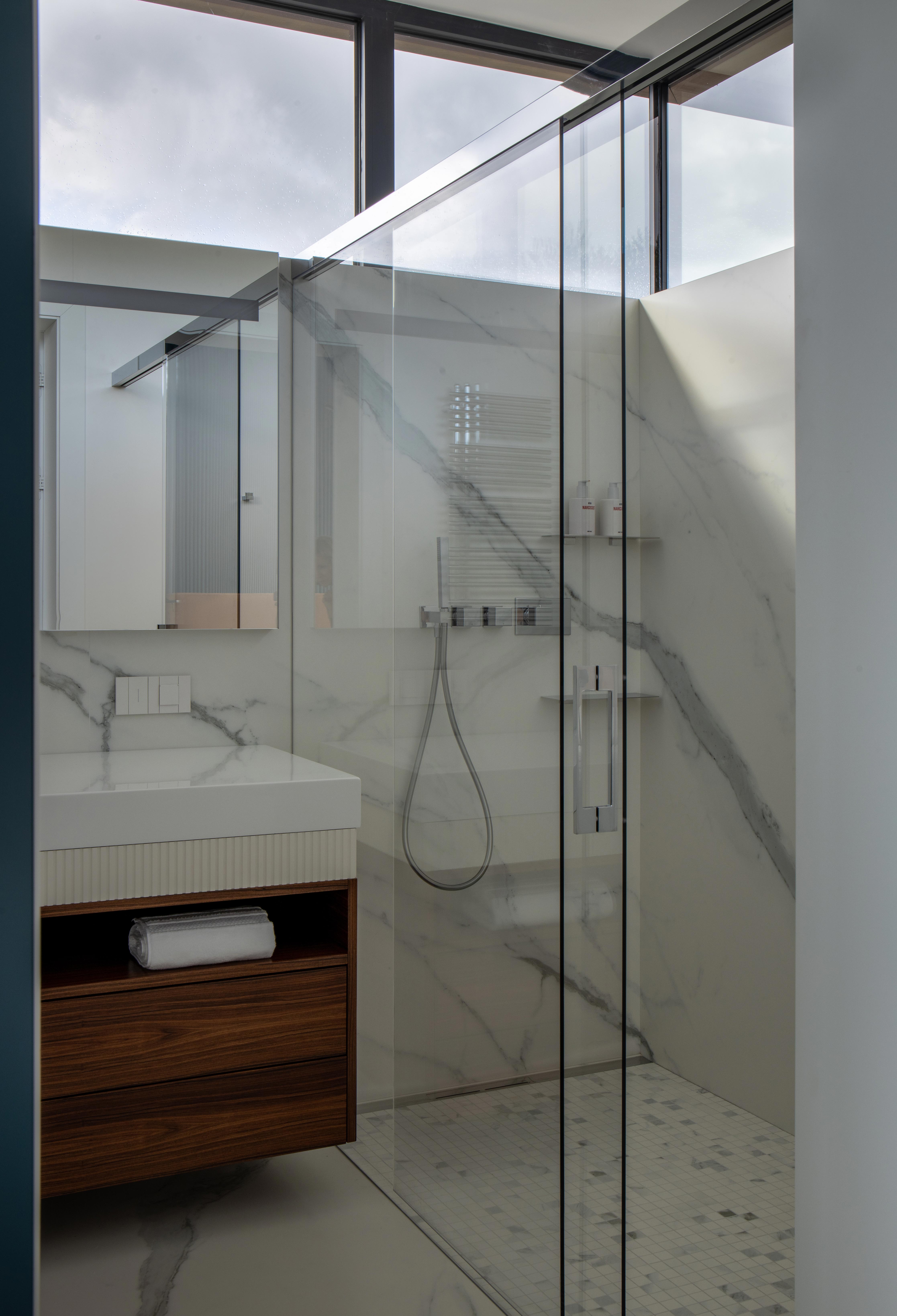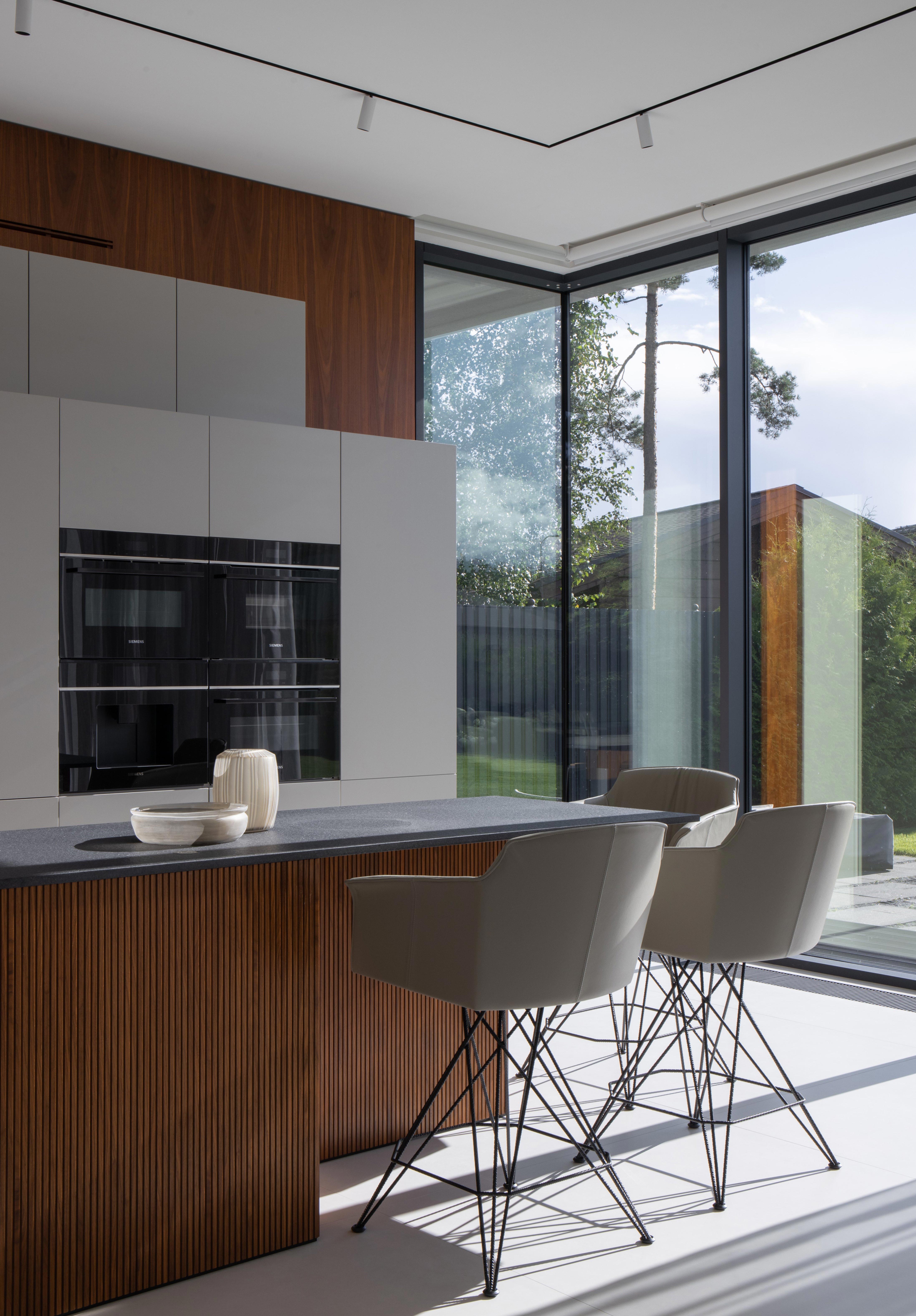 Несмотря на вытянутую форму участка все жилые зоны ориентированы на юг. На первом этаже расположены кухня-гостиная, гостевые спальни и технические помещения. Зона кухни-гостиной выделяется витражным остеклением, которое обеспечивает обилие дневного света и создает ощущение полного погружения в природный ландшафт. Логическим продолжением кухни служит уличная терраса. На террасе предусмотрена летняя кухня с окном-фартуком, визуально связанная с основным пространством. Второй этаж полностью отдан под личное пространство жильцов: мастер блок и детские спальни. Все комнаты второго этажа объединены общим лестничным холлом с непрерывным остеклением.