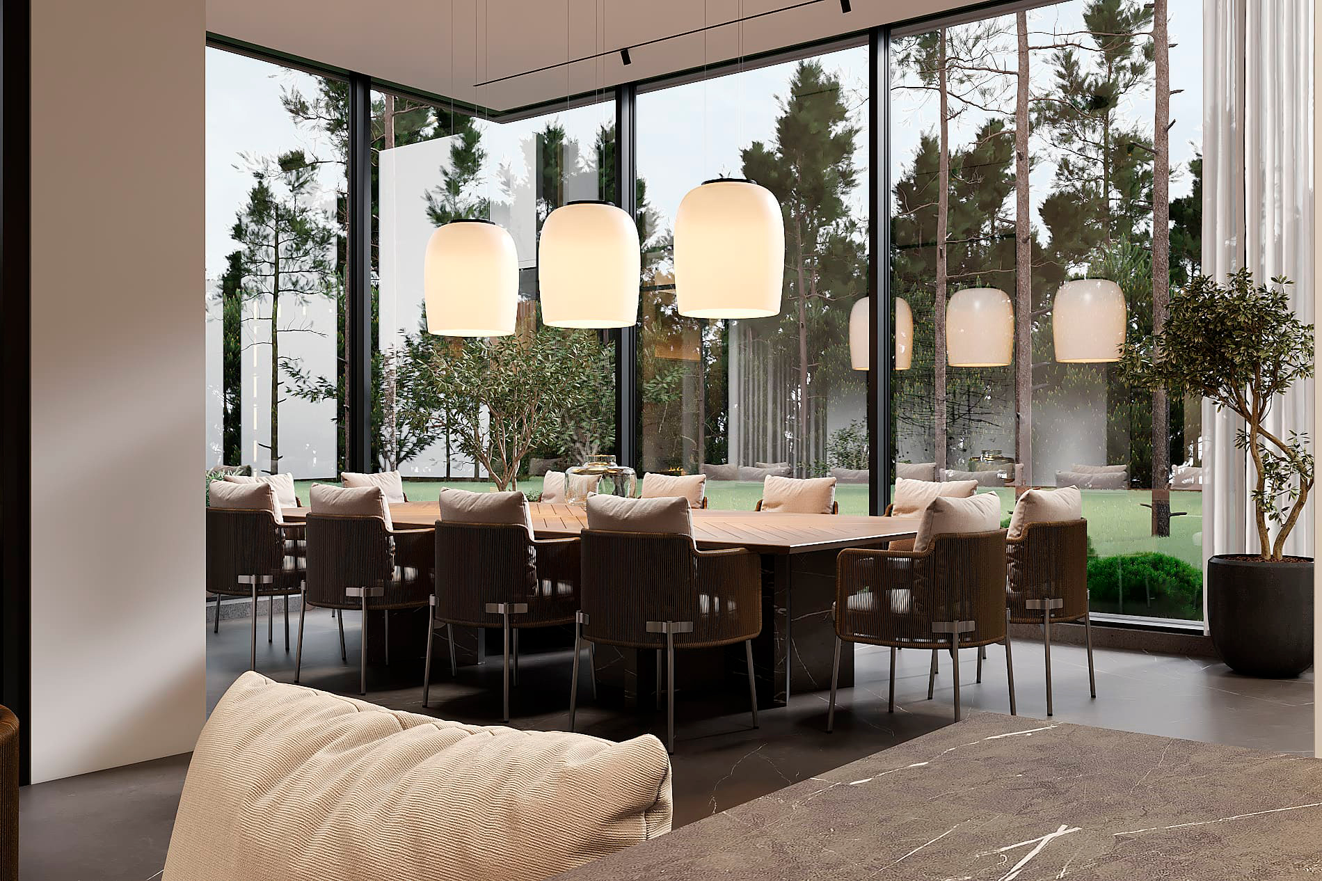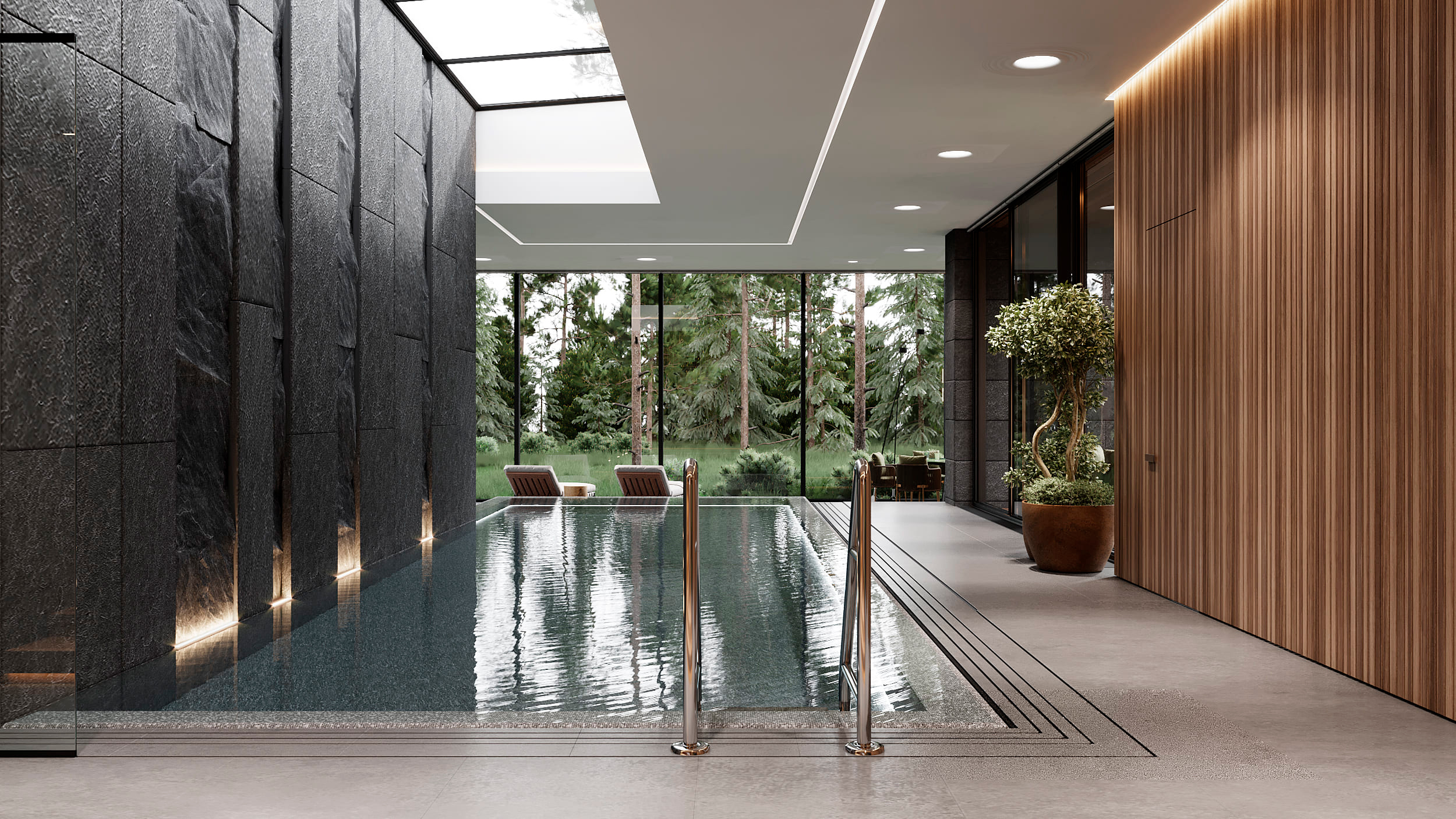 Функциональное зонирование дома подчинено принципу максимального комфорта. Сердцем планировки является внутренний озелененный двор, обеспечивающий визуальную и физическую связь с нетронутым лесным массивом. Все основные помещения первого этажа – мастер-блок, гостиная, кухня и столовая – спроектированы таким образом, чтобы обеспечить непосредственный доступ во внутренний двор. Это позволяет в любой момент выйти на свежий воздух, ощутить аромат трав и насладиться тишиной природы. Зона спа также имеет выход во дворик, предлагая возможность для уединенных солнечных ванн. Весь второй этаж предназначен для детских мастер-блоков, обеспечивая им приватное и комфортное пространство для жизни и развития. Отделка фасада (планкен теплых оттенков и керамогранит) плавно переходит в спа-зону, визуально объединяя экстерьер и зону отдыха. Инфинити-бассейн с переливным краем создает эффект визуального слияния с окружающим лесным массивом. Резиденция в Охта Парке представляет собой уникальное пространство для жизни, где архитектура и природа образуют единое целое.