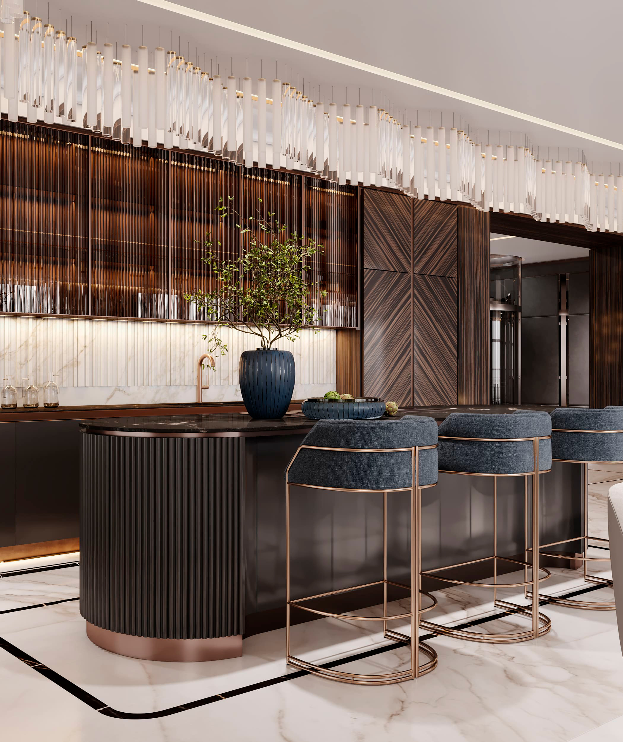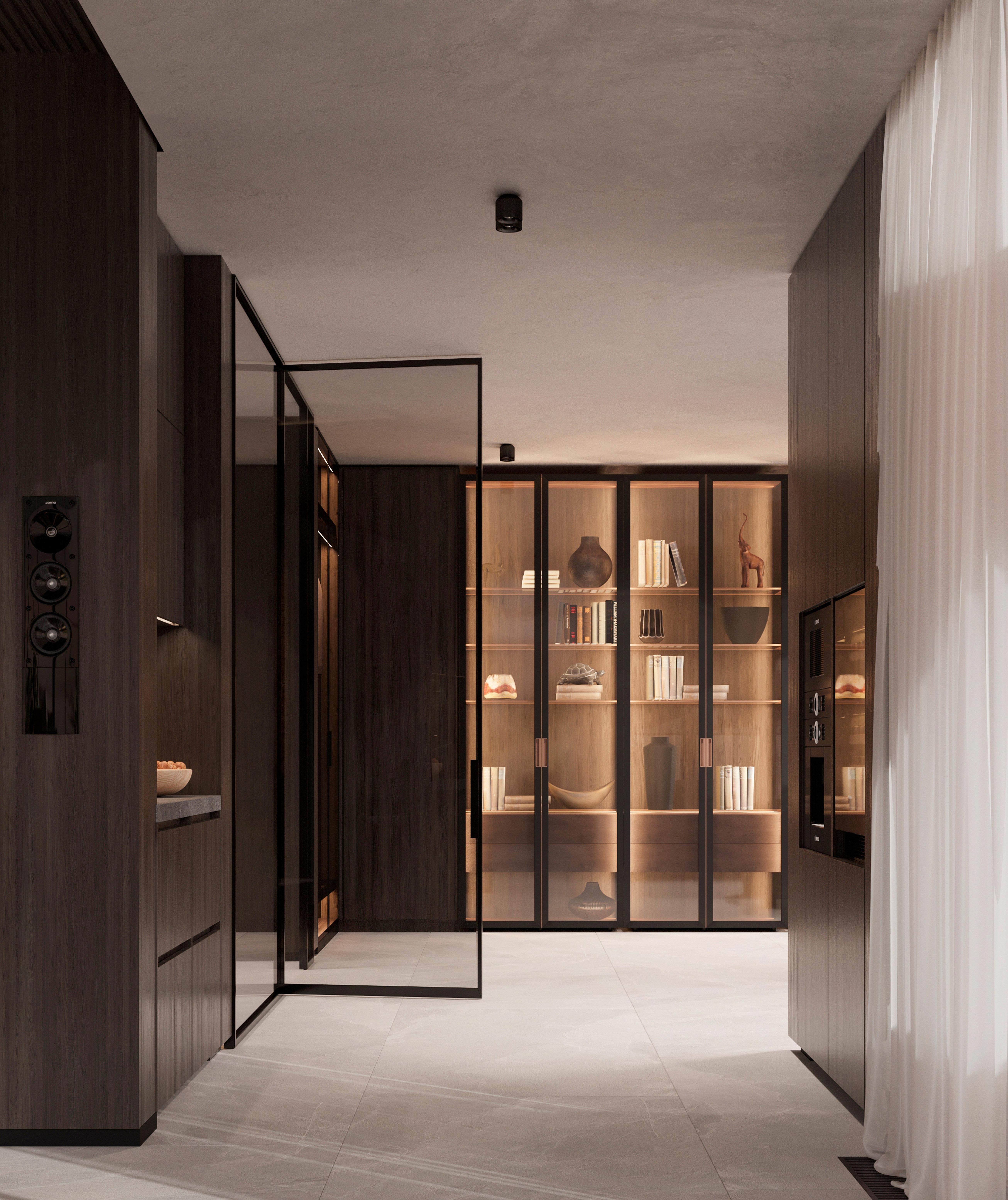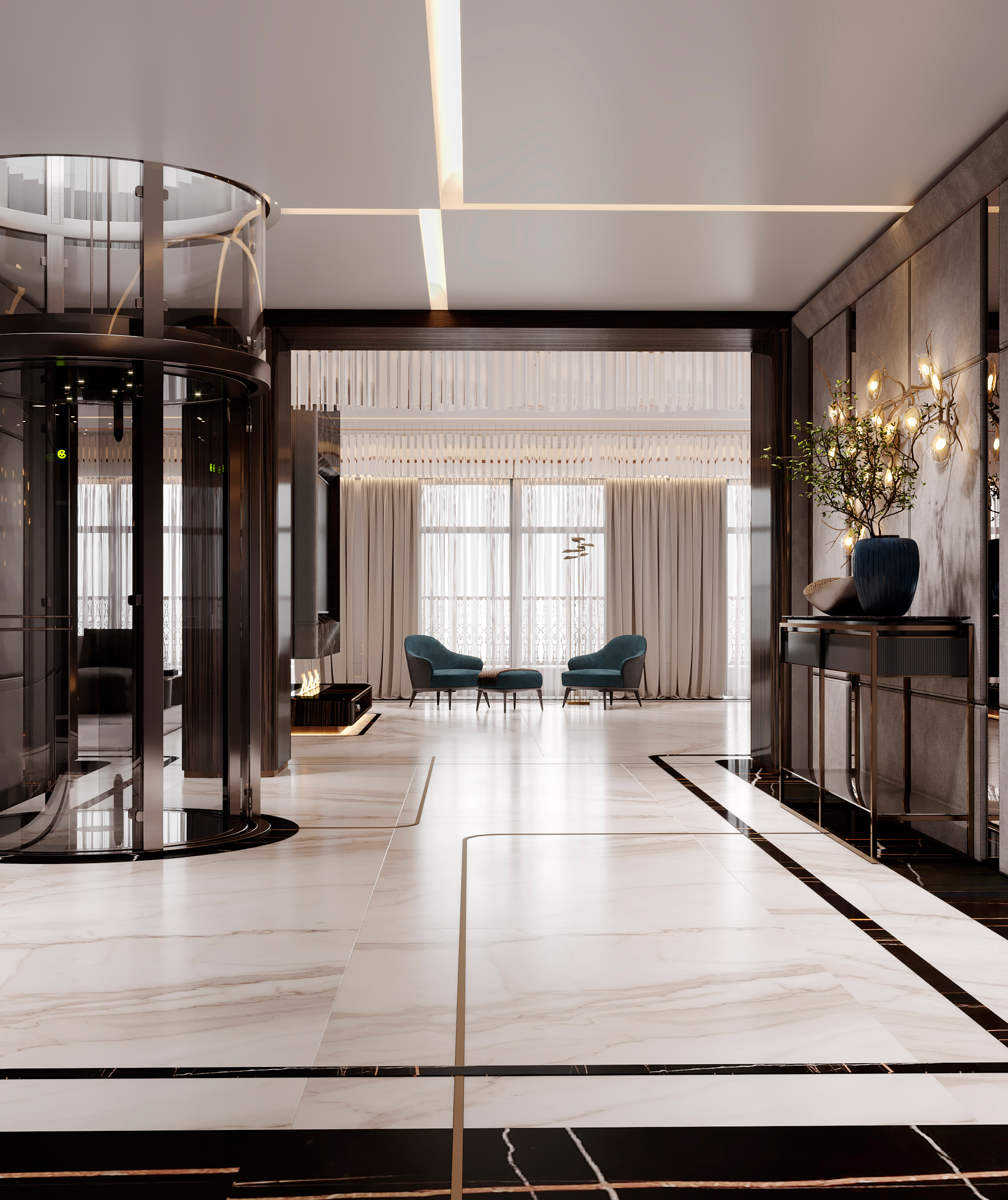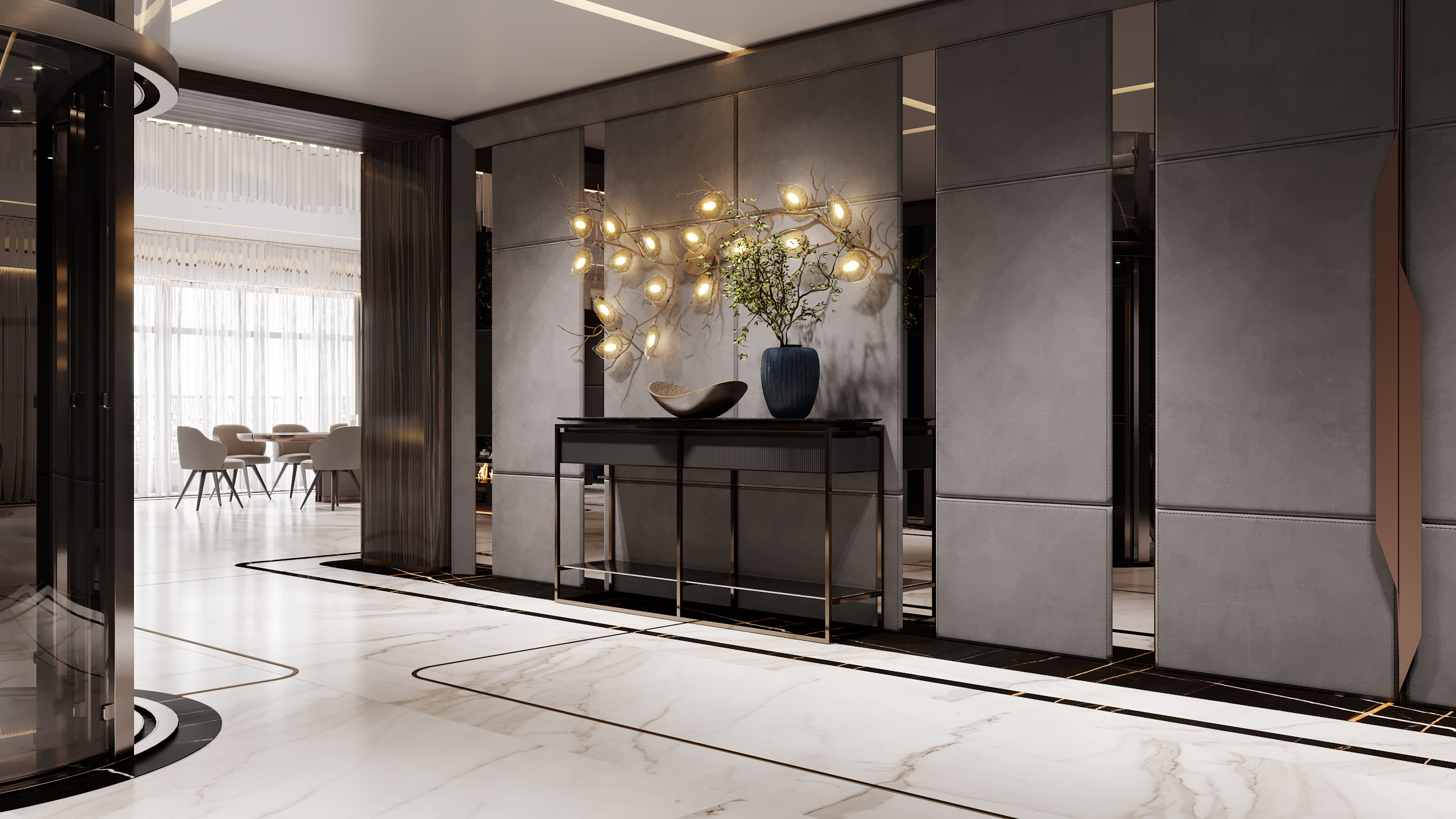 В отделке применены контрастный черно-белый мраморный пол в сочетании с эбеновым шпоном под лаком и панелями из алькантары. Особое внимание уделено деталям и проработке: алькантара дополнена строчкой, в мрамор интегрированы металлические вставки медного сатинированного оттенка, наборный паркет также включает интегрированные вставки из мрамора и металла. Визуально это сложный, многослойный интерьер, где декоративные решения гармонично сочетаются со сложными техническими и эстетическими задачами, успешно воплощенными в жизнь.