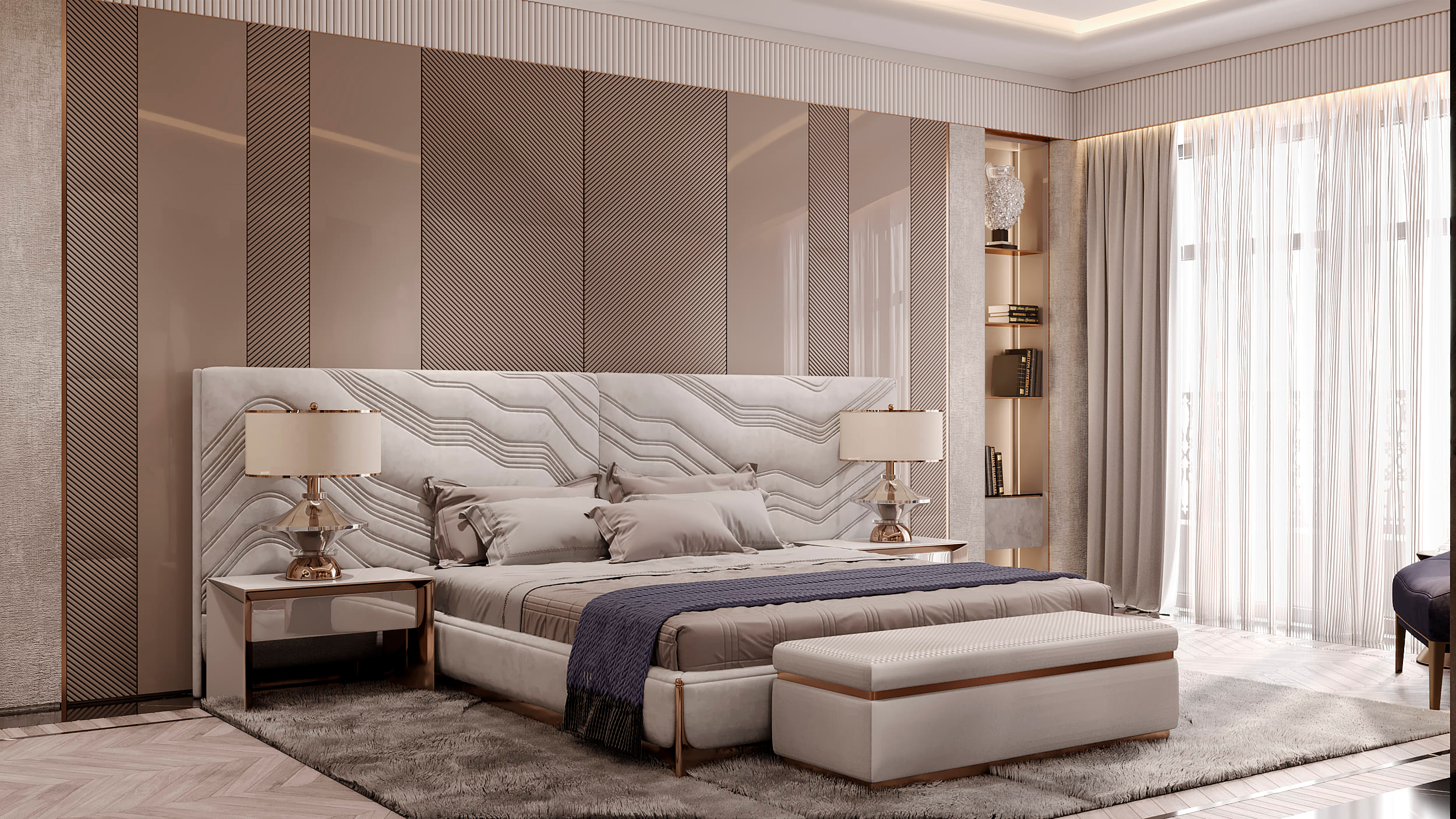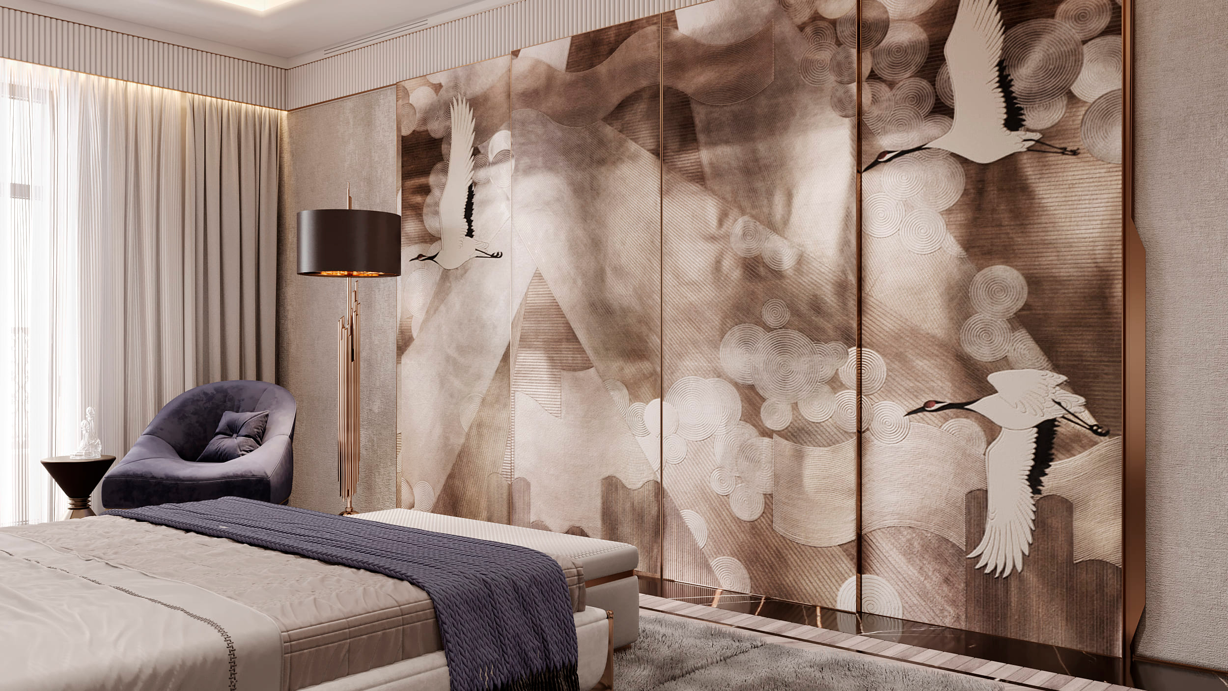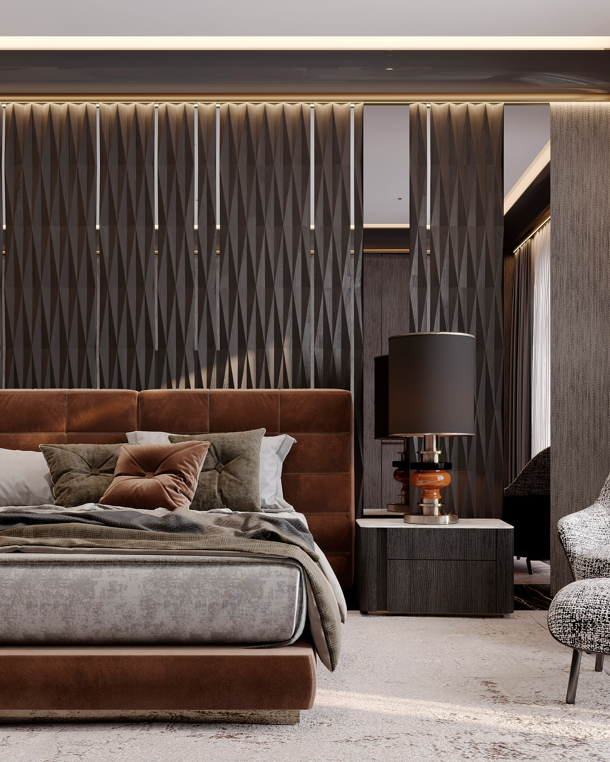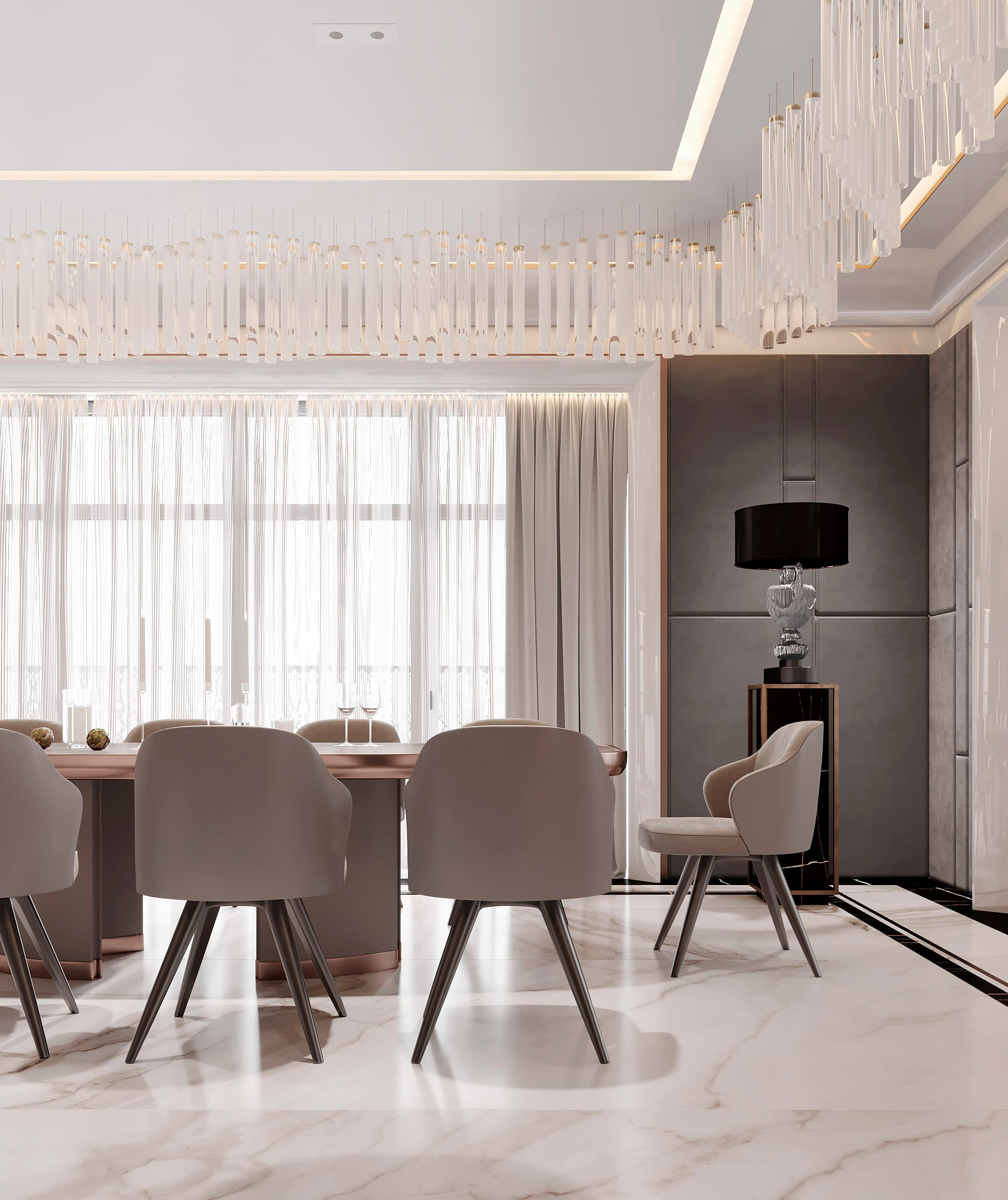 В отделке применены контрастный черно-белый мраморный пол в сочетании с эбеновым шпоном под лаком и панелями из алькантары. Особое внимание уделено деталям и проработке: алькантара дополнена строчкой, в мрамор интегрированы металлические вставки медного сатинированного оттенка, наборный паркет также включает интегрированные вставки из мрамора и металла. Визуально это сложный, многослойный интерьер, где декоративные решения гармонично сочетаются со сложными техническими и эстетическими задачами, успешно воплощенными в жизнь.