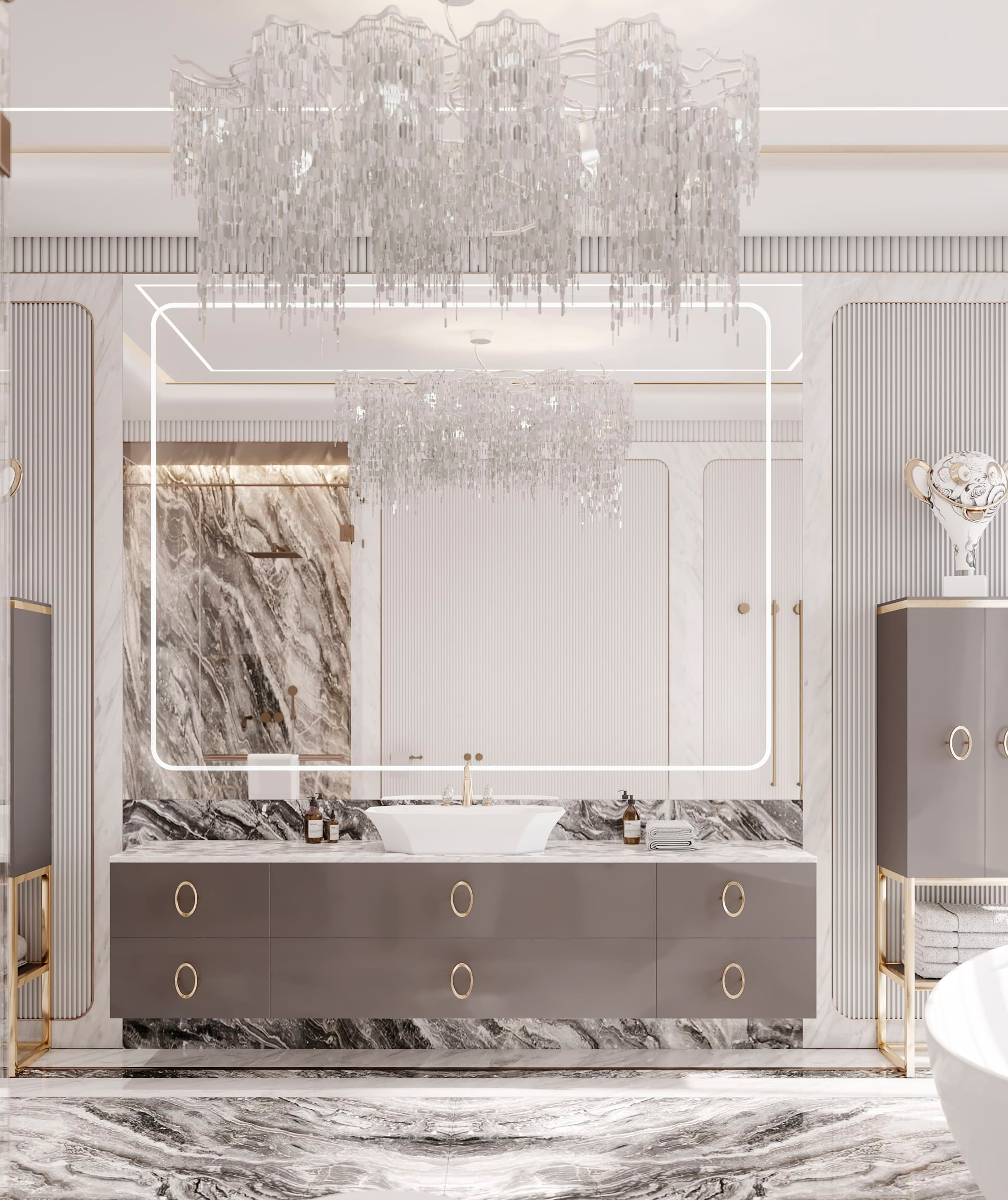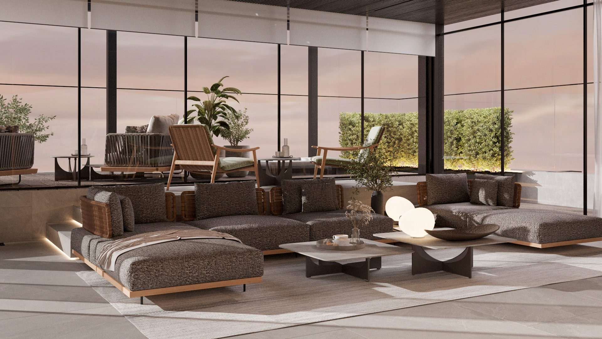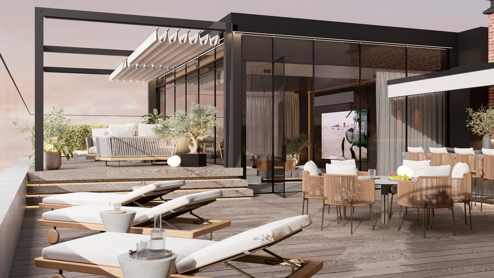 Функционально пентхаус делится на общее пространство столовой-гостиной с панорамным лифтом на крышу и отдельные мастер-блоки для всех членов семьи с гардеробными и ванными комнатами. Терраса на крыше включает спа-зону и гостиную для просмотра кино с собственным джакузи, соляной комнатой и зоной для барбекю.