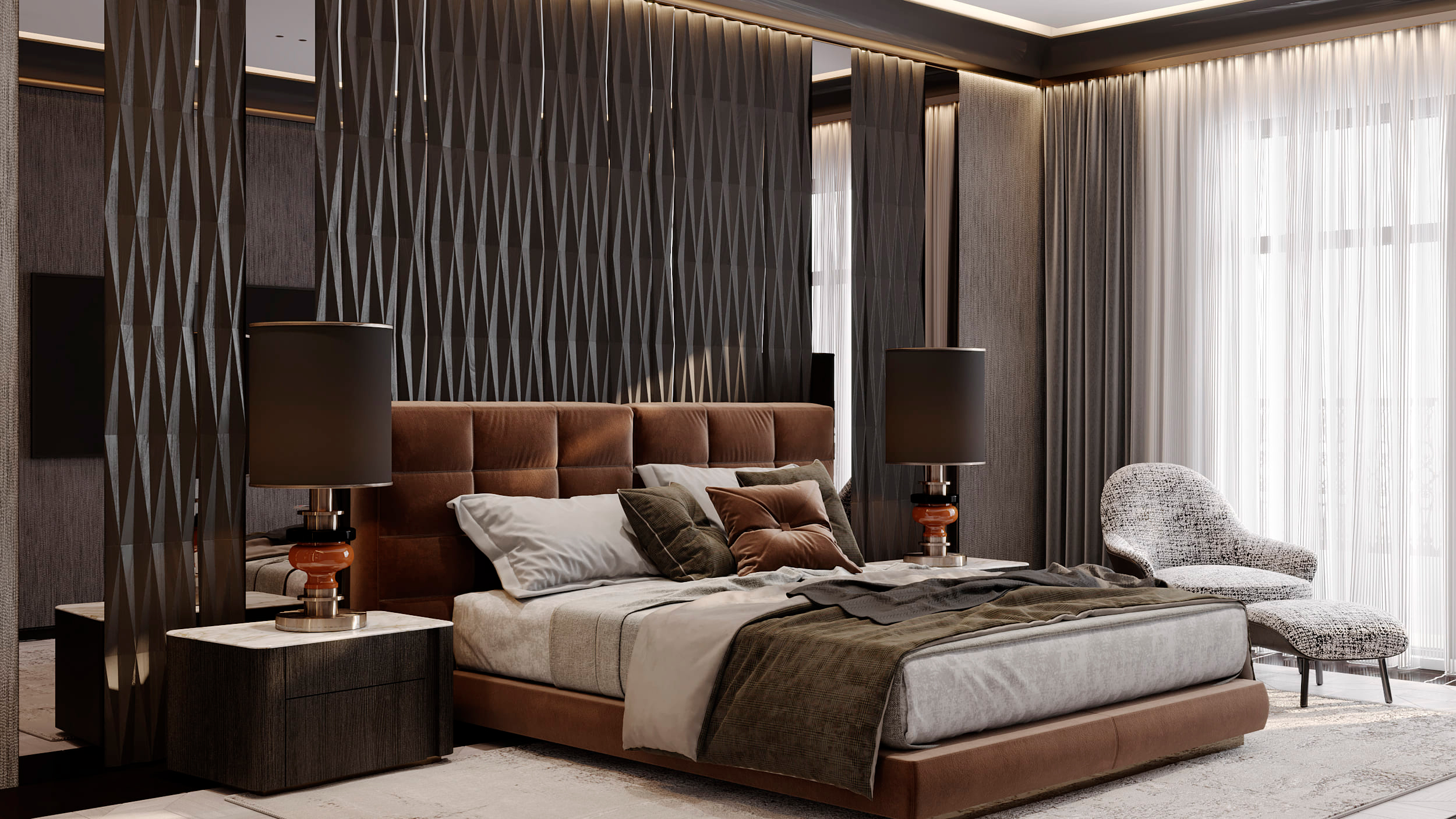 Проект двухуровневого пентхауса с террасой, общей площадью 800 м². По замыслу – это респектабельный, атмосферный интерьер с тщательно проработанными деталями и богатым сочетанием различных материалов. Окна и терраса расположены по всему периметру пентхауса, благодаря чему из каждого помещения открывается потрясающий вид и есть возможность выхода на улицу.