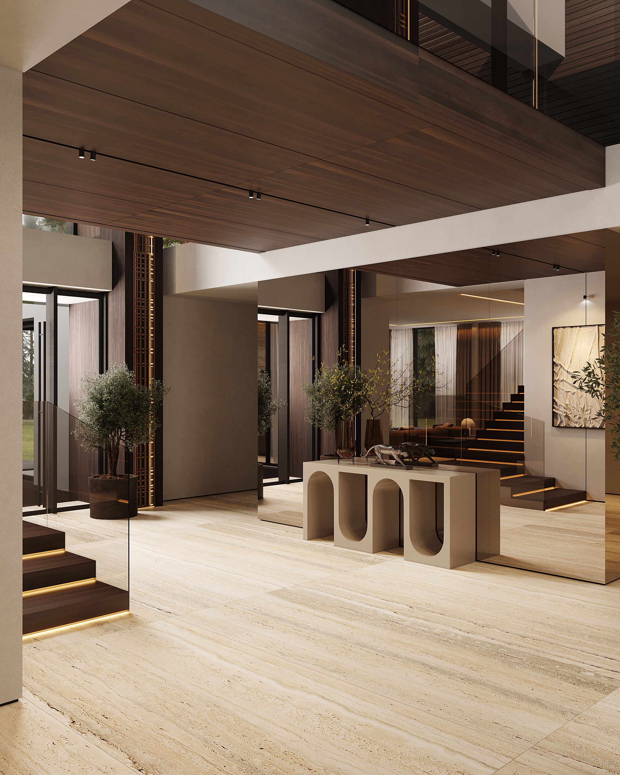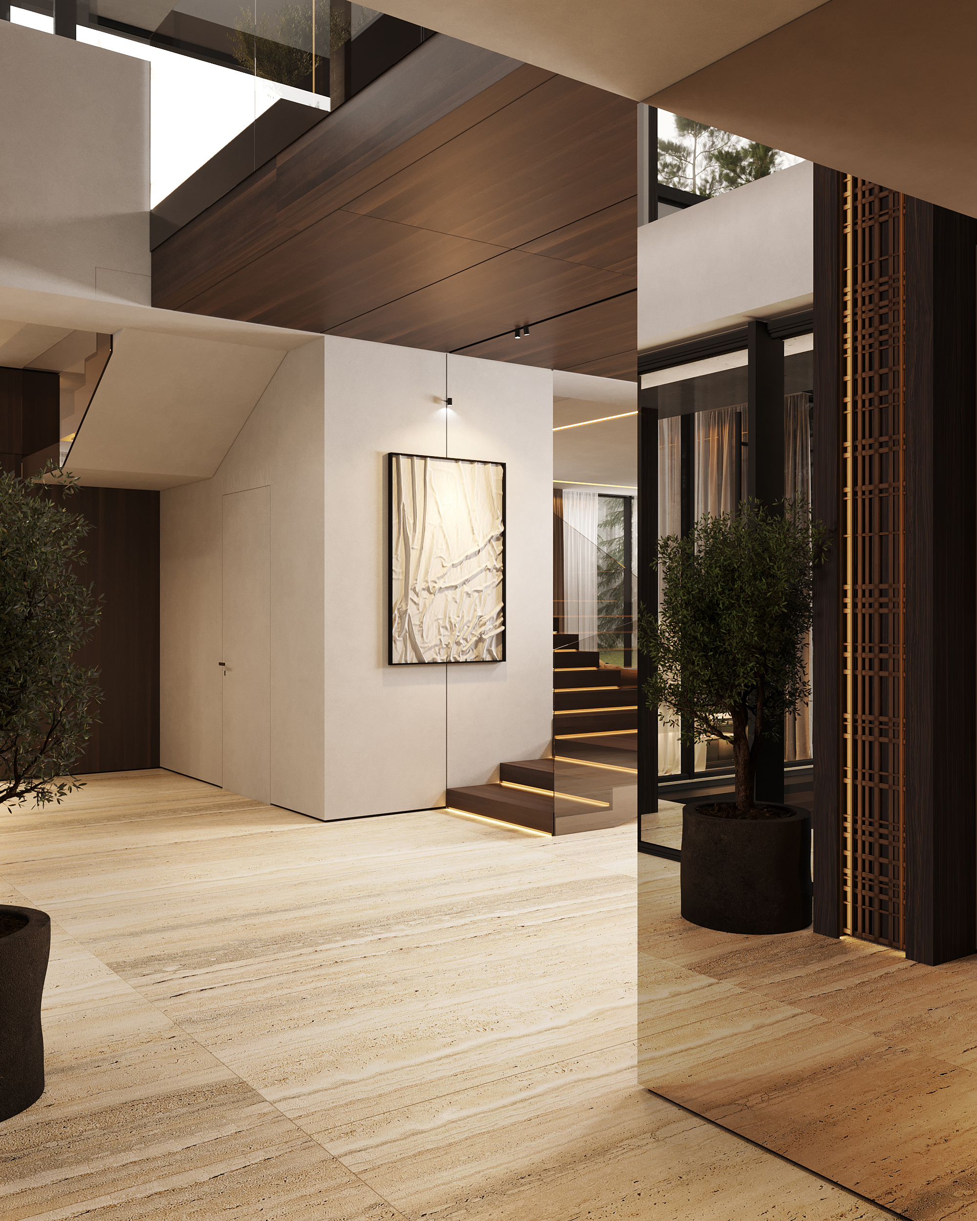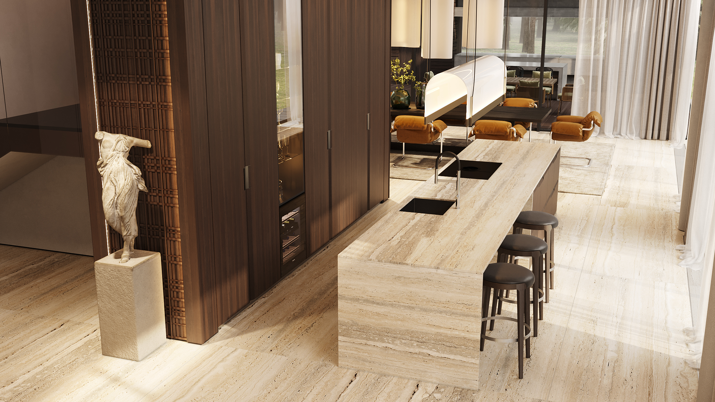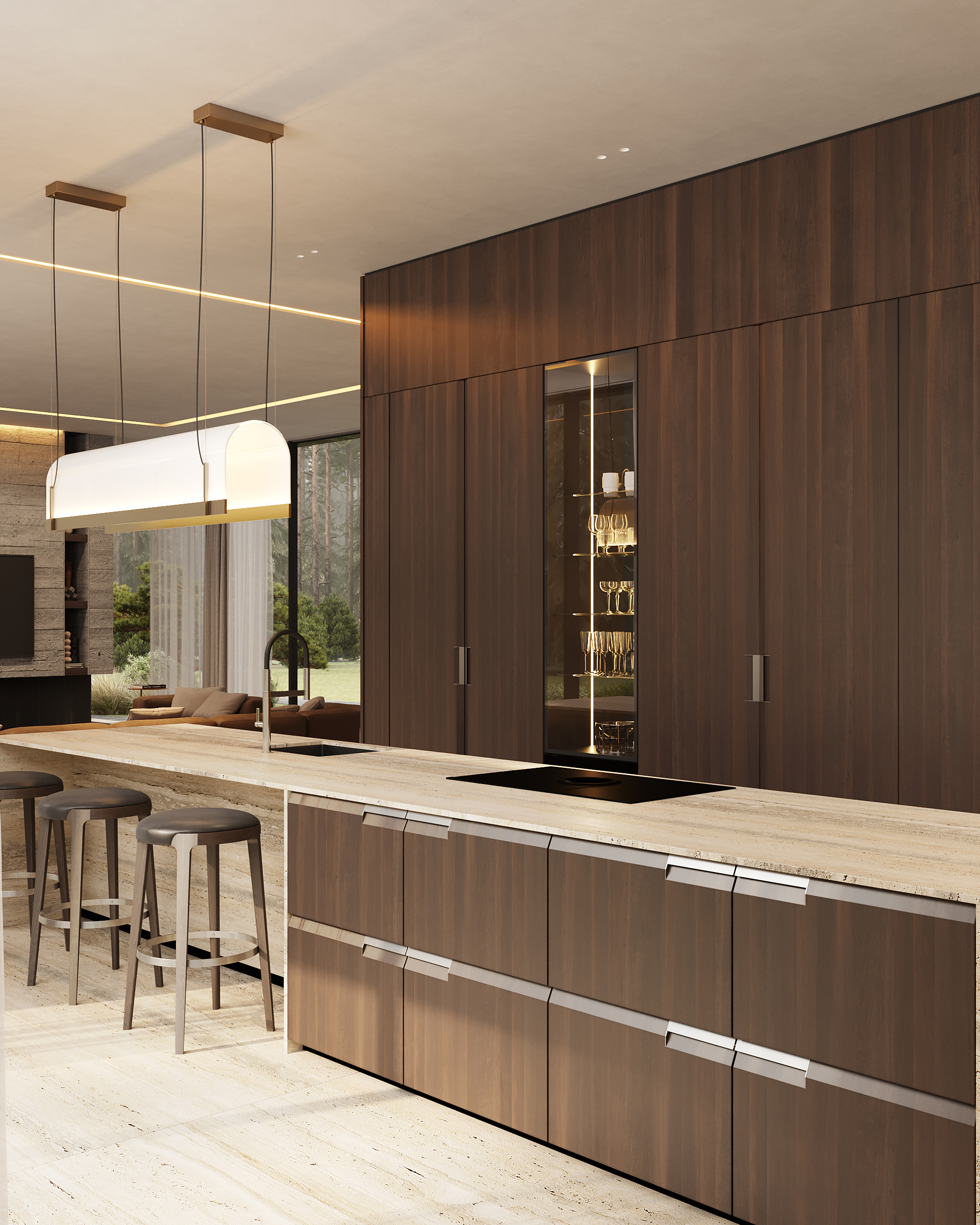 Сердцем дома, объединяющим все пространства, является центральный блок, включающий лестницу, ведущую к мосту, и кухню. Этот объем, отделанный шпоном, представляет собой своего рода ядро резиденции, где располагается просторная кухня с большим островом – идеальное место для семейных встреч и кулинарных экспериментов. Цветовая гамма интерьера выдержана в теплых тонах: бежевый травертин гармонично сочетается с коньячными оттенками мягкой мебели и шоколадным цветом дуба, создавая атмосферу тепла.