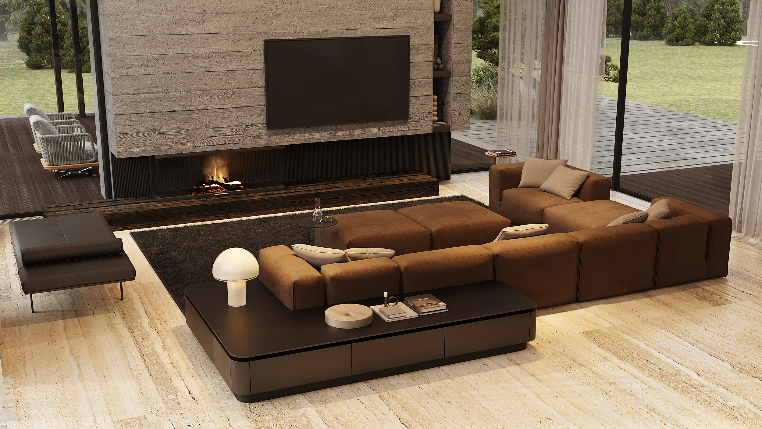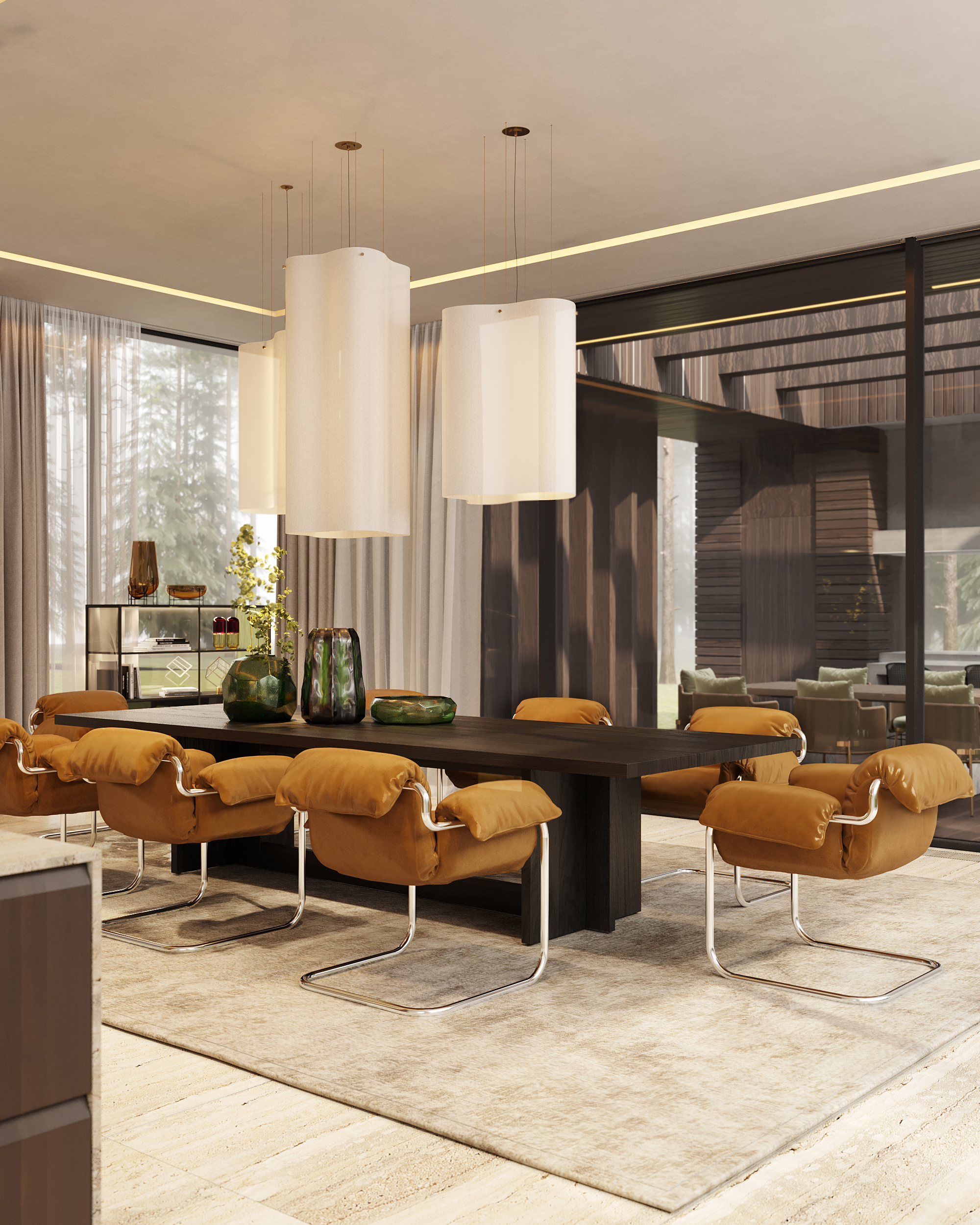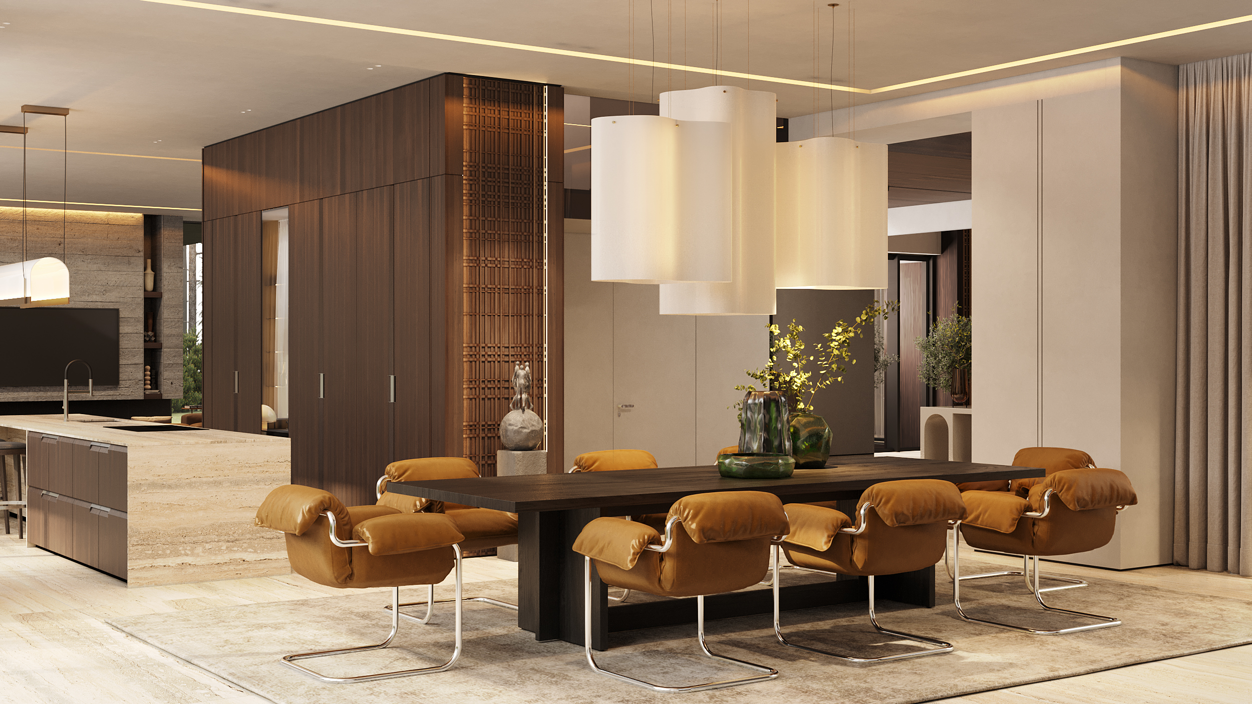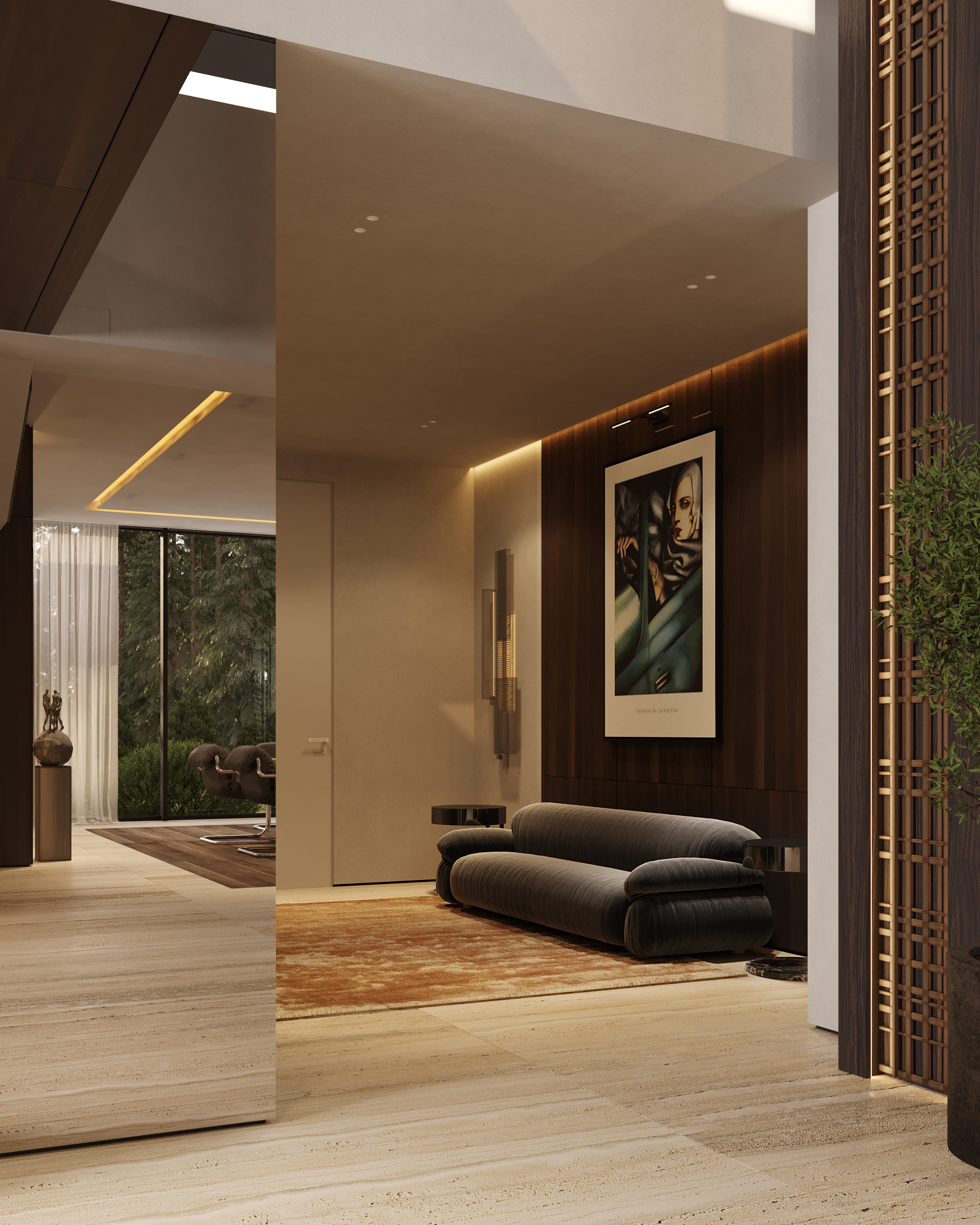 Сердцем дома, объединяющим все пространства, является центральный блок, включающий лестницу, ведущую к мосту, и кухню. Этот объем, отделанный шпоном, представляет собой своего рода ядро резиденции, где располагается просторная кухня с большим островом – идеальное место для семейных встреч и кулинарных экспериментов. Цветовая гамма интерьера выдержана в теплых тонах: бежевый травертин гармонично сочетается с коньячными оттенками мягкой мебели и шоколадным цветом дуба, создавая атмосферу тепла.