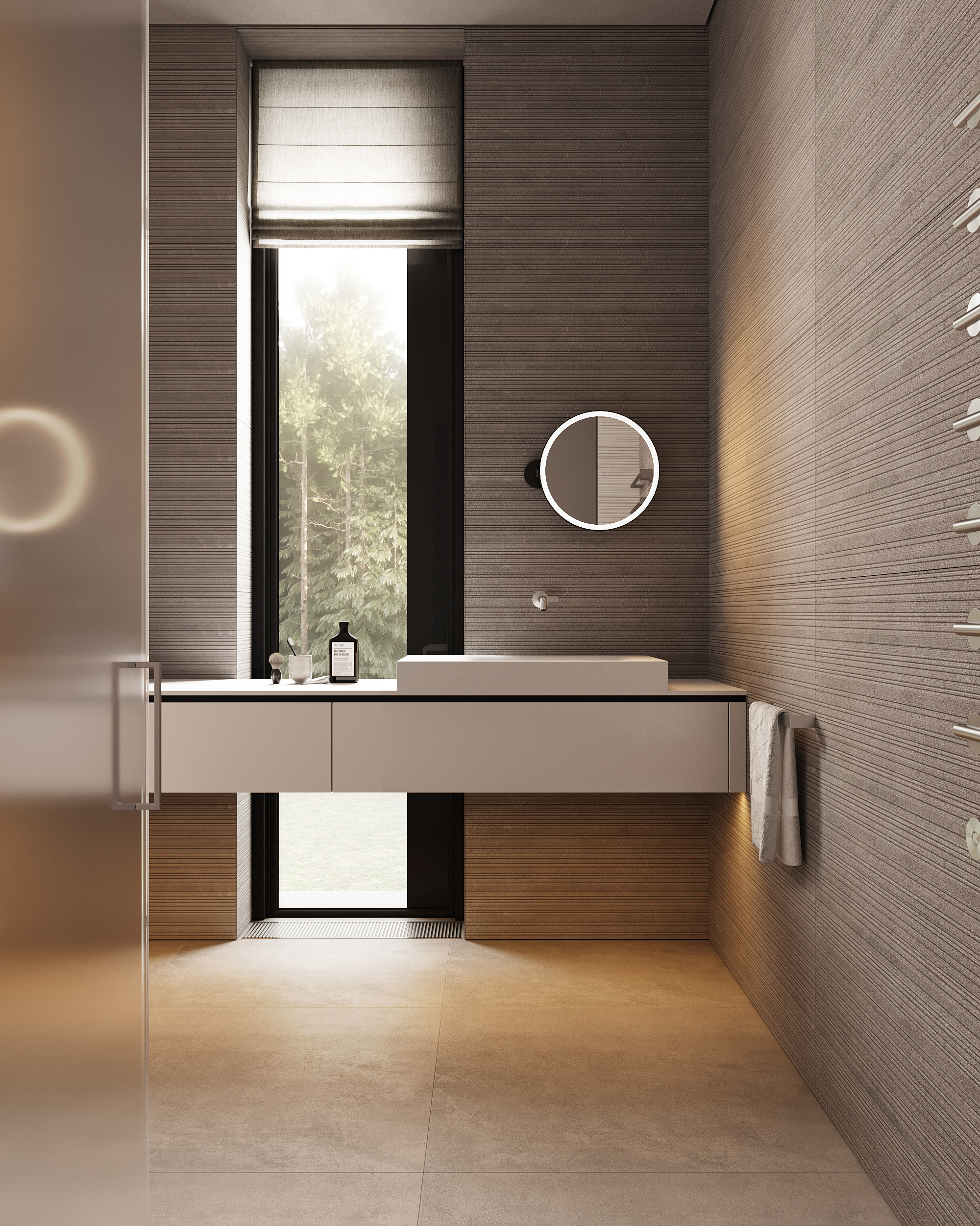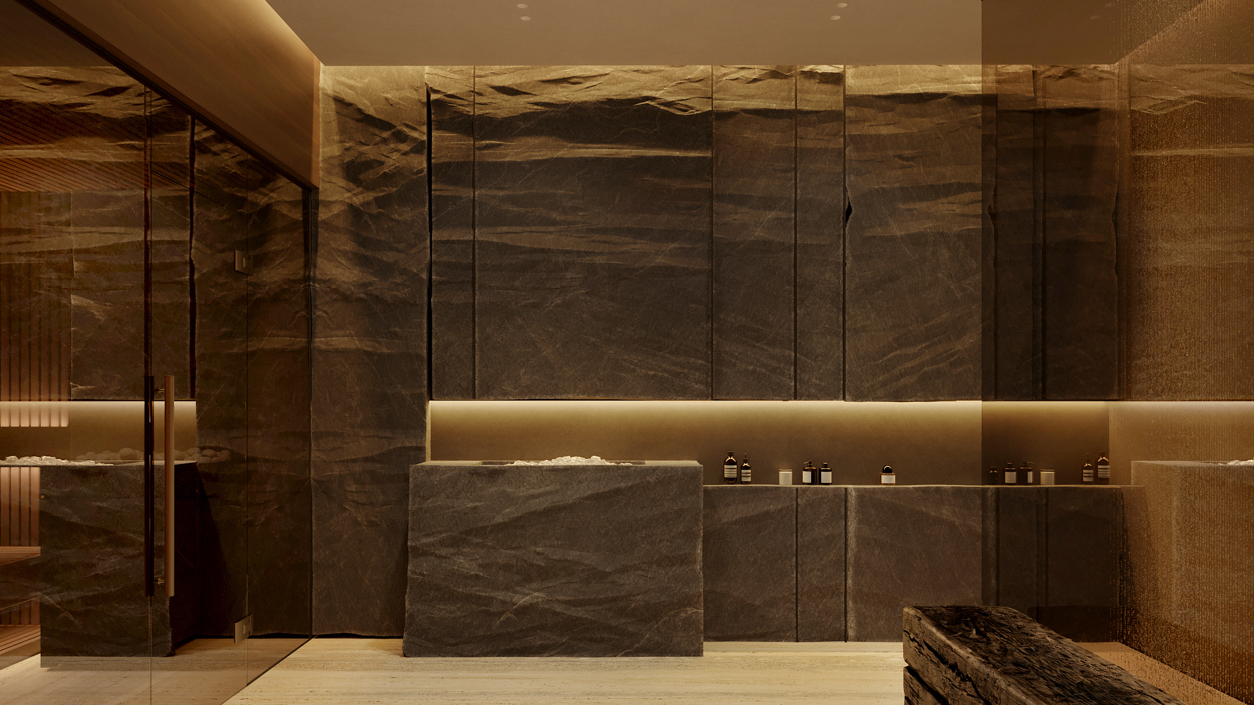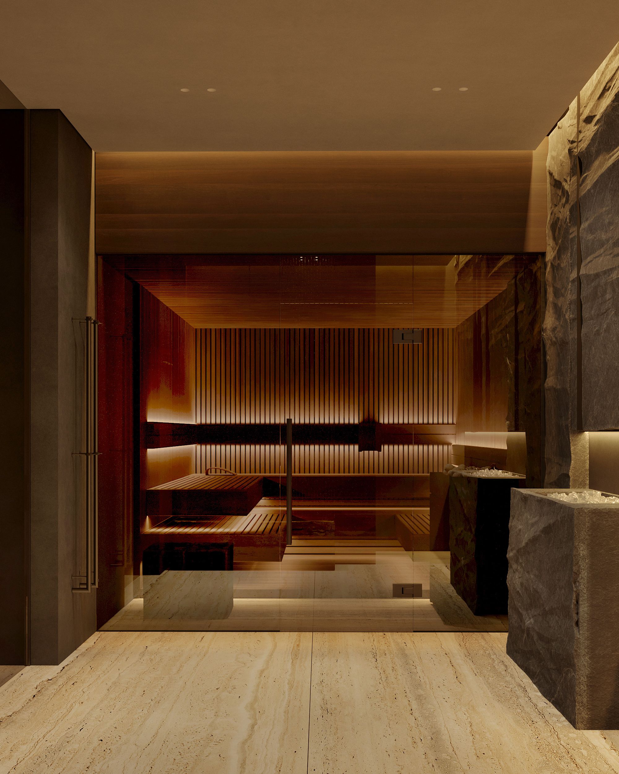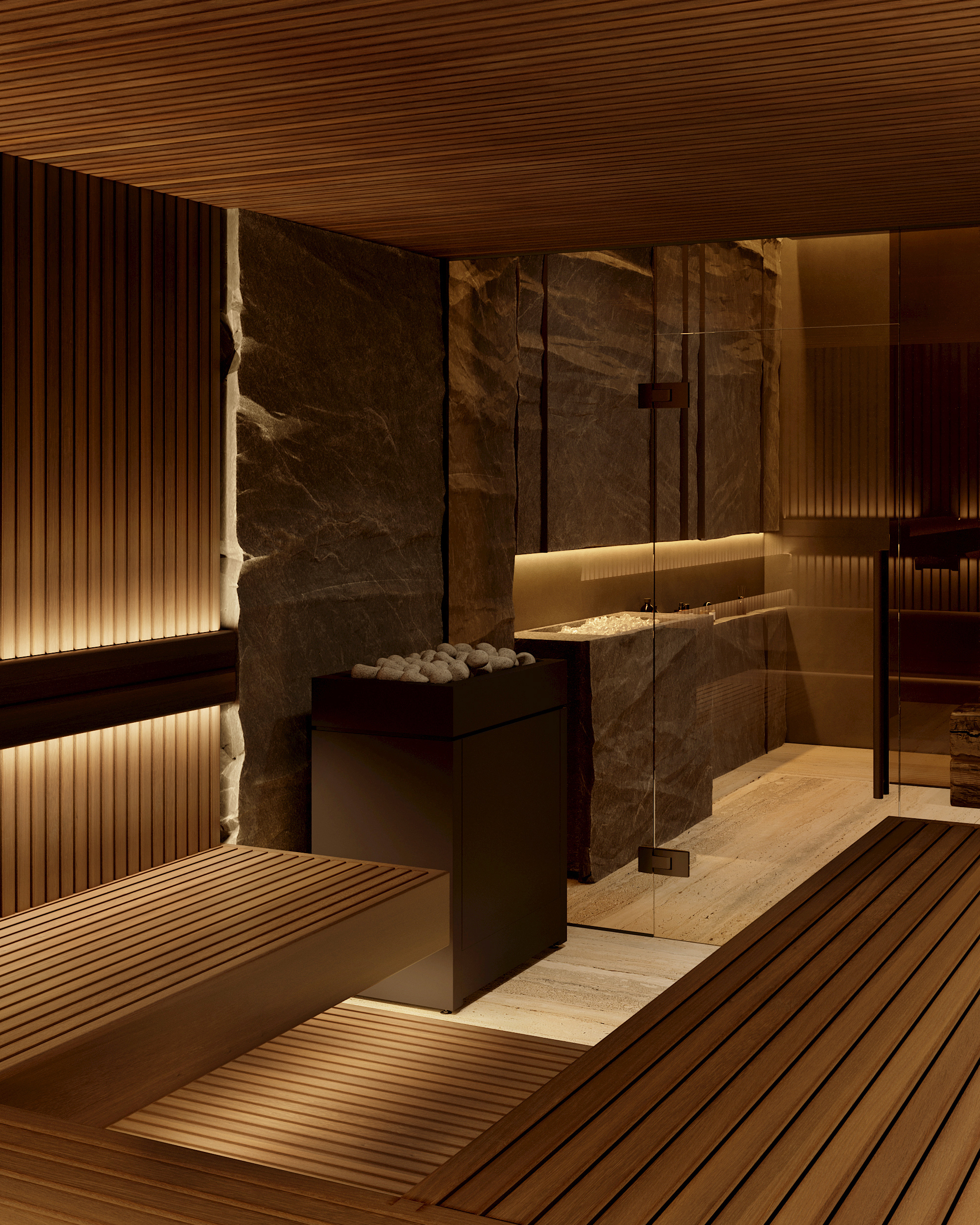 Для полноценного отдыха и восстановления сил в резиденции предусмотрена спа-зона, включающая сауну и зону отдыха. В их отделке использованы фактурные гранитные блоки из габбро, которые добавляют брутальности и позволяют владельцам ощутить связь с суровой красотой северной природы, отвлекаясь от городской суеты.