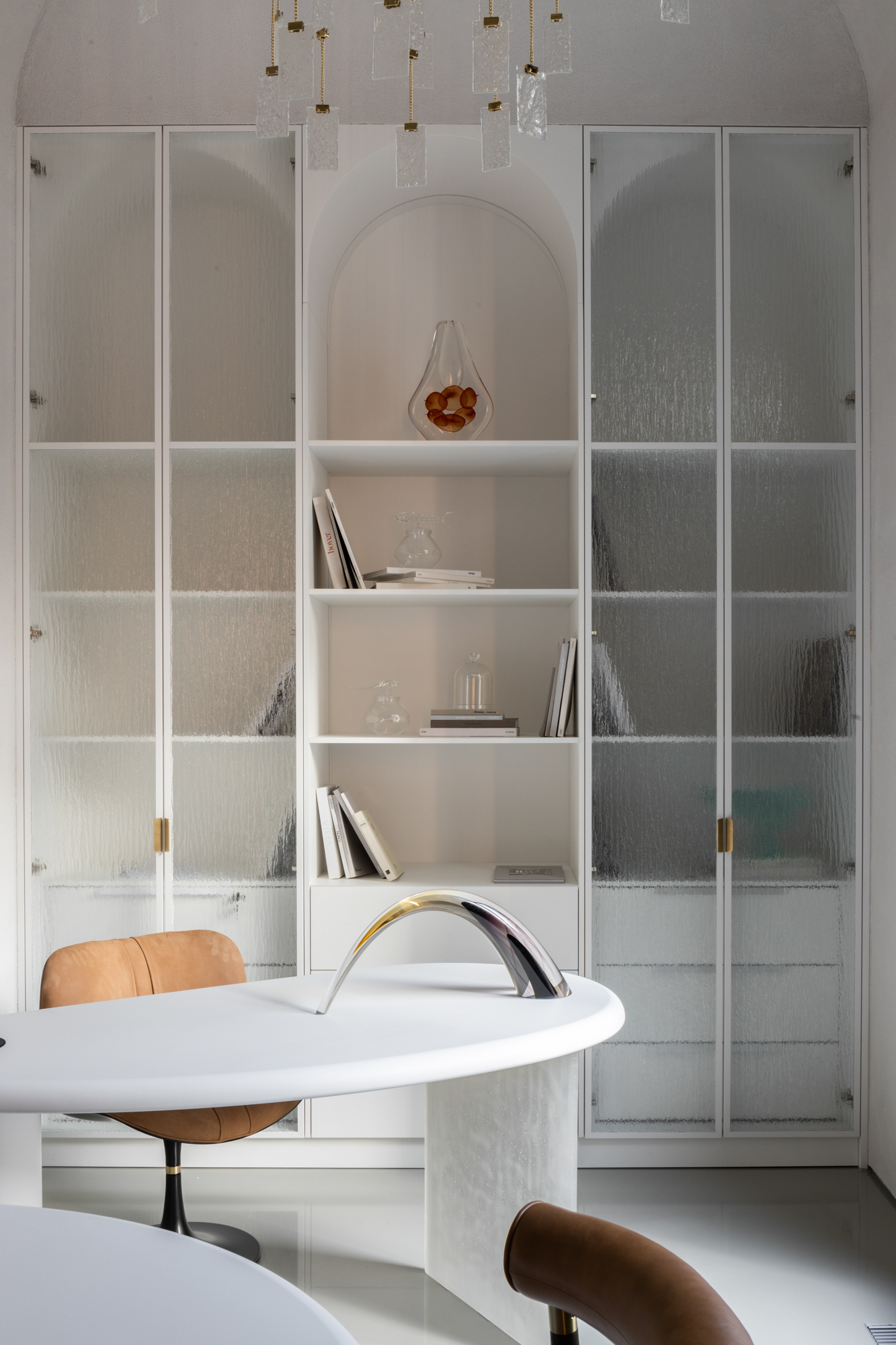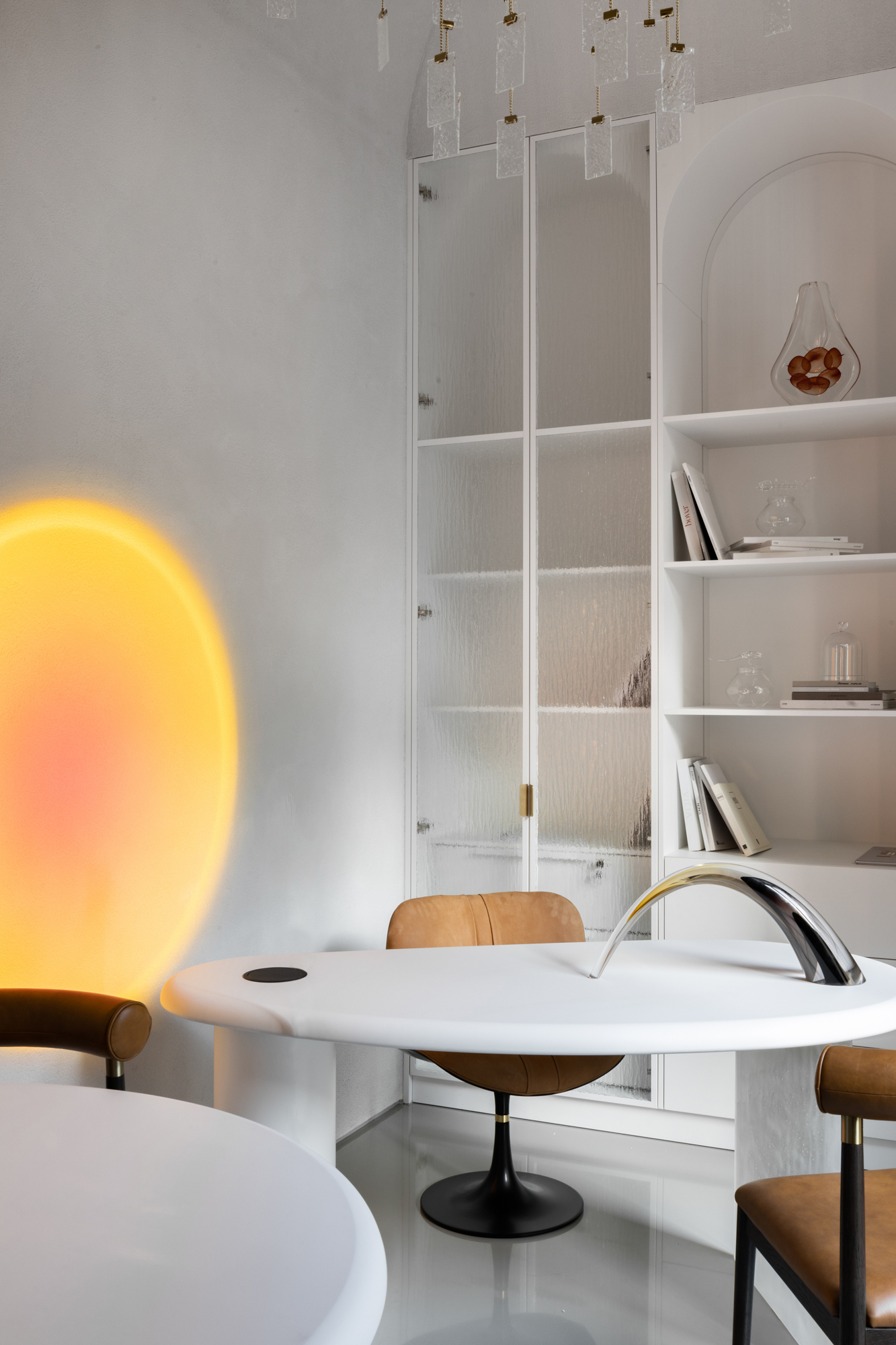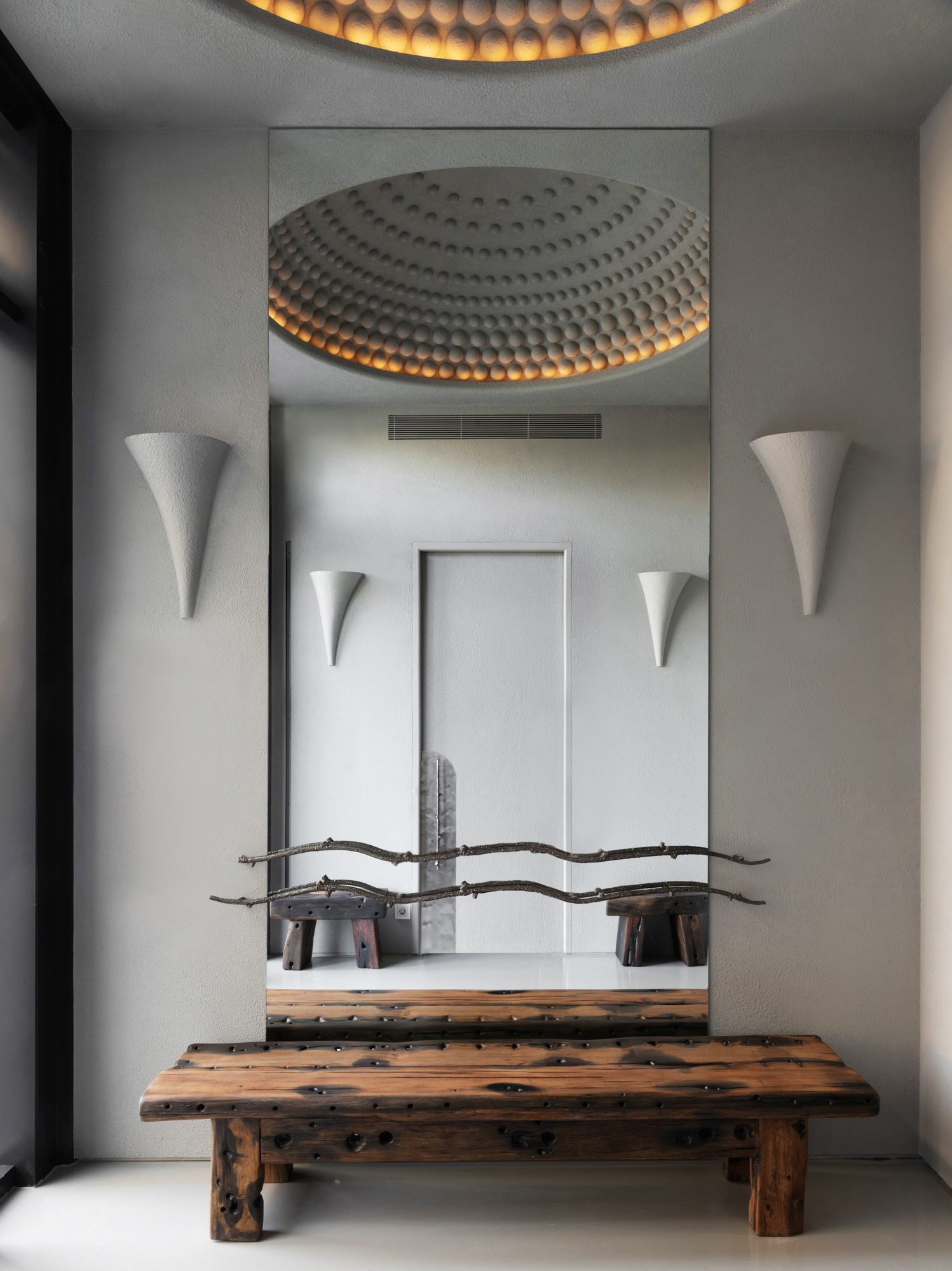 Не обошлось без индивидуальных изделий при выборе декоративных элементов для студии. Дверные ручки в виде ветвей, декоративный подвес, собранный из стеклянных элементов в кабинете руководителя, и аутентичный арт-объект в зоне ресепшн подчеркивают уникальность пространства. Отдельного внимания заслуживает оформление потолка в холле – он напоминает вазу, сформированную на гончарном круге и украшенную минималистичным, но ритмичным декором из глины.