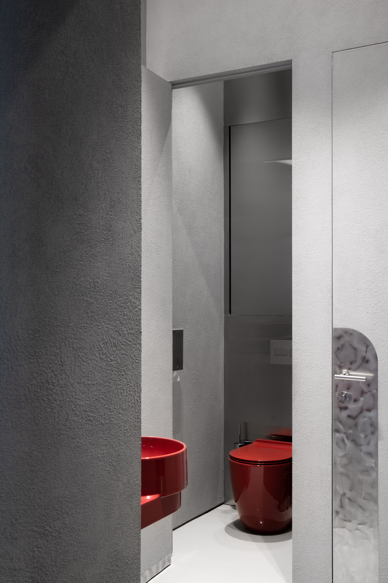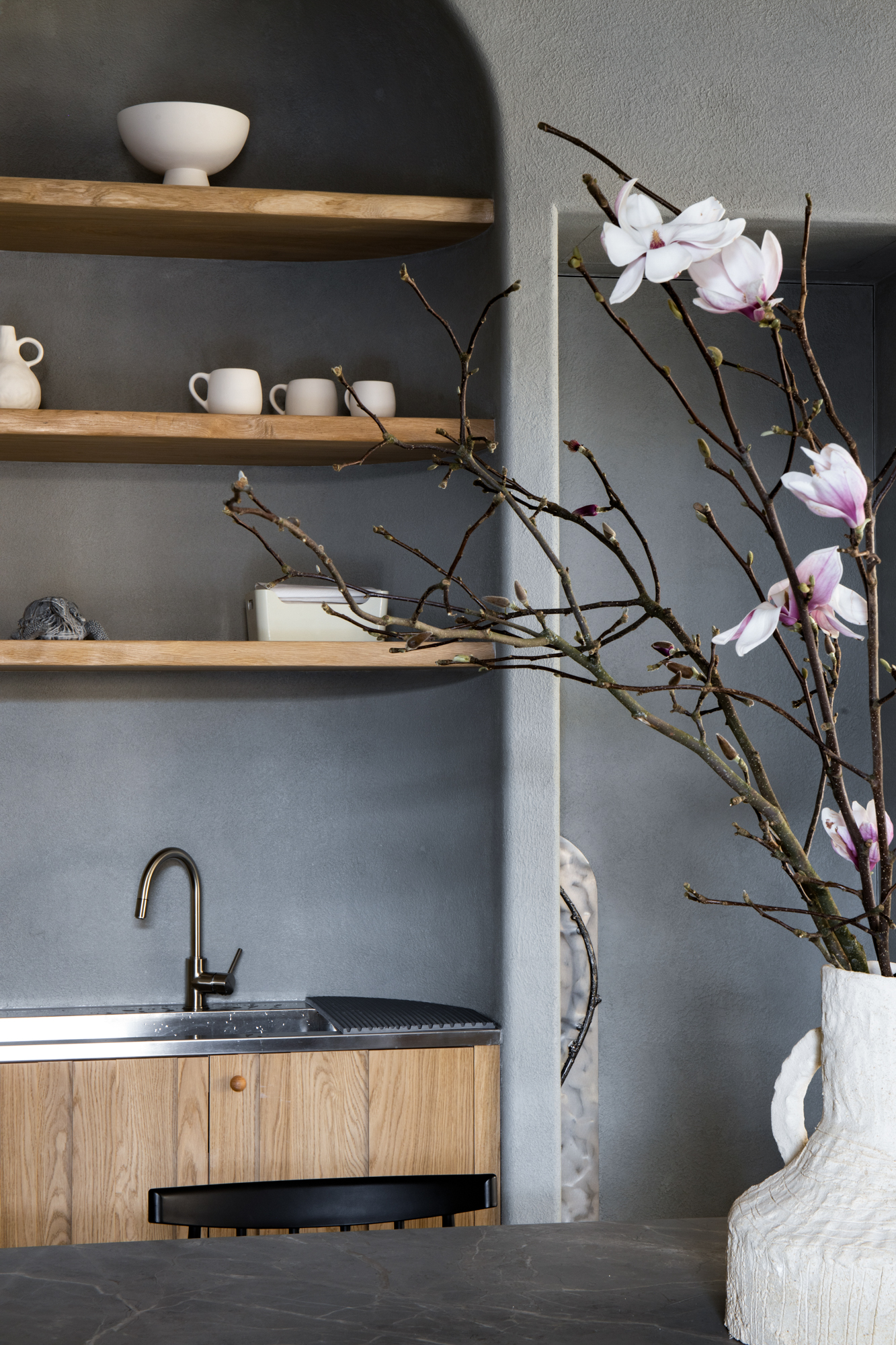 В отделке применены декоративная штукатурка, натуральное дерево с живыми необработанными краями и шлифованная нержавейка. Сохранена эстетика необработанного бетона, оставлены открытыми все коммуникации потолка, а штукатурка выбрана с выраженной фактурой – все для усиления впечатления от работы с природным материалом.