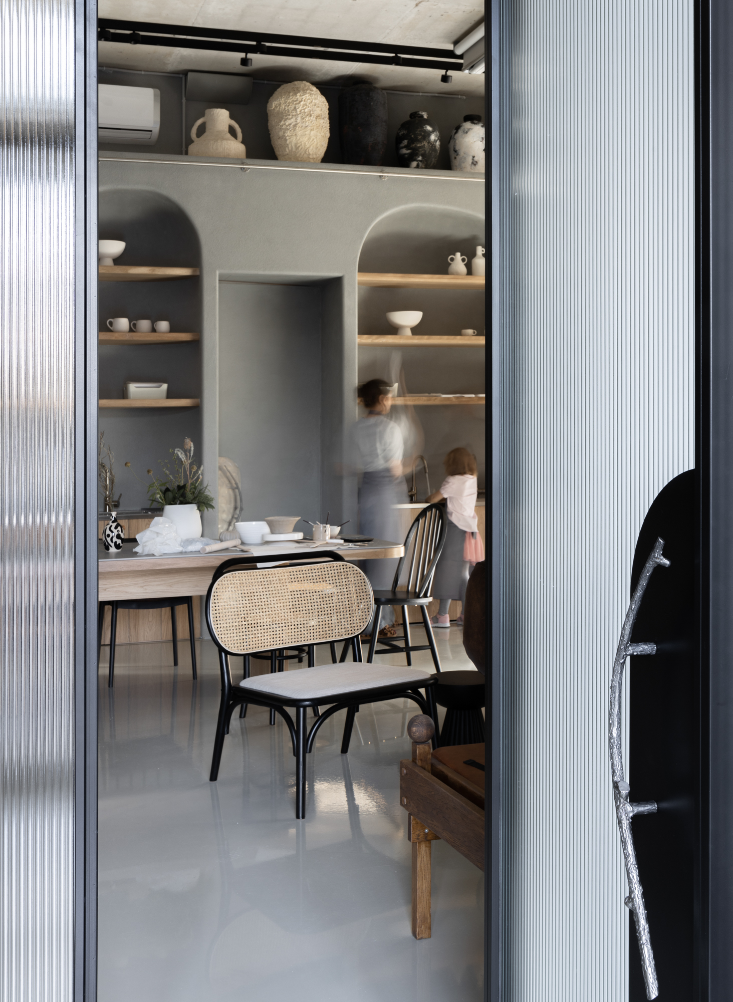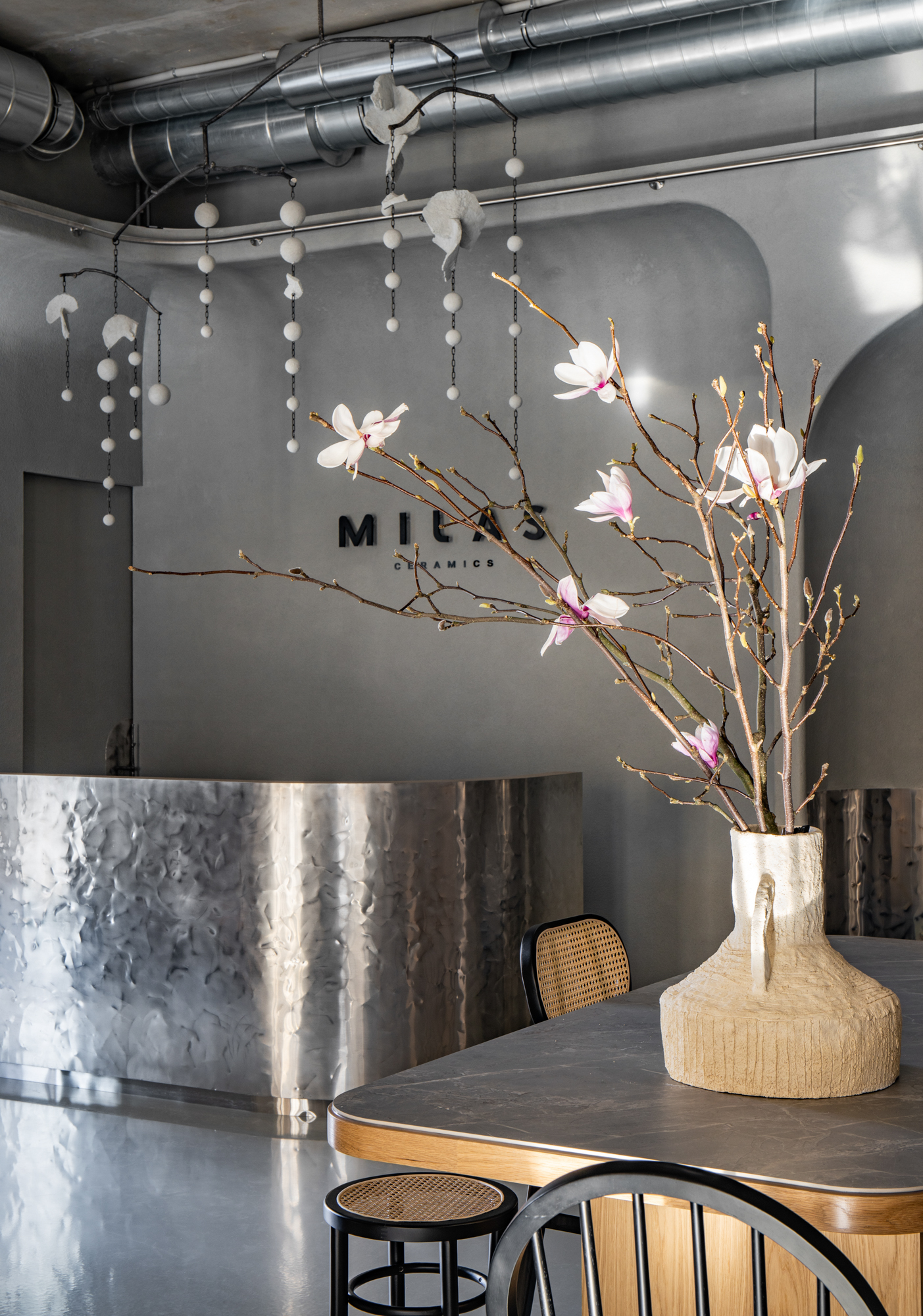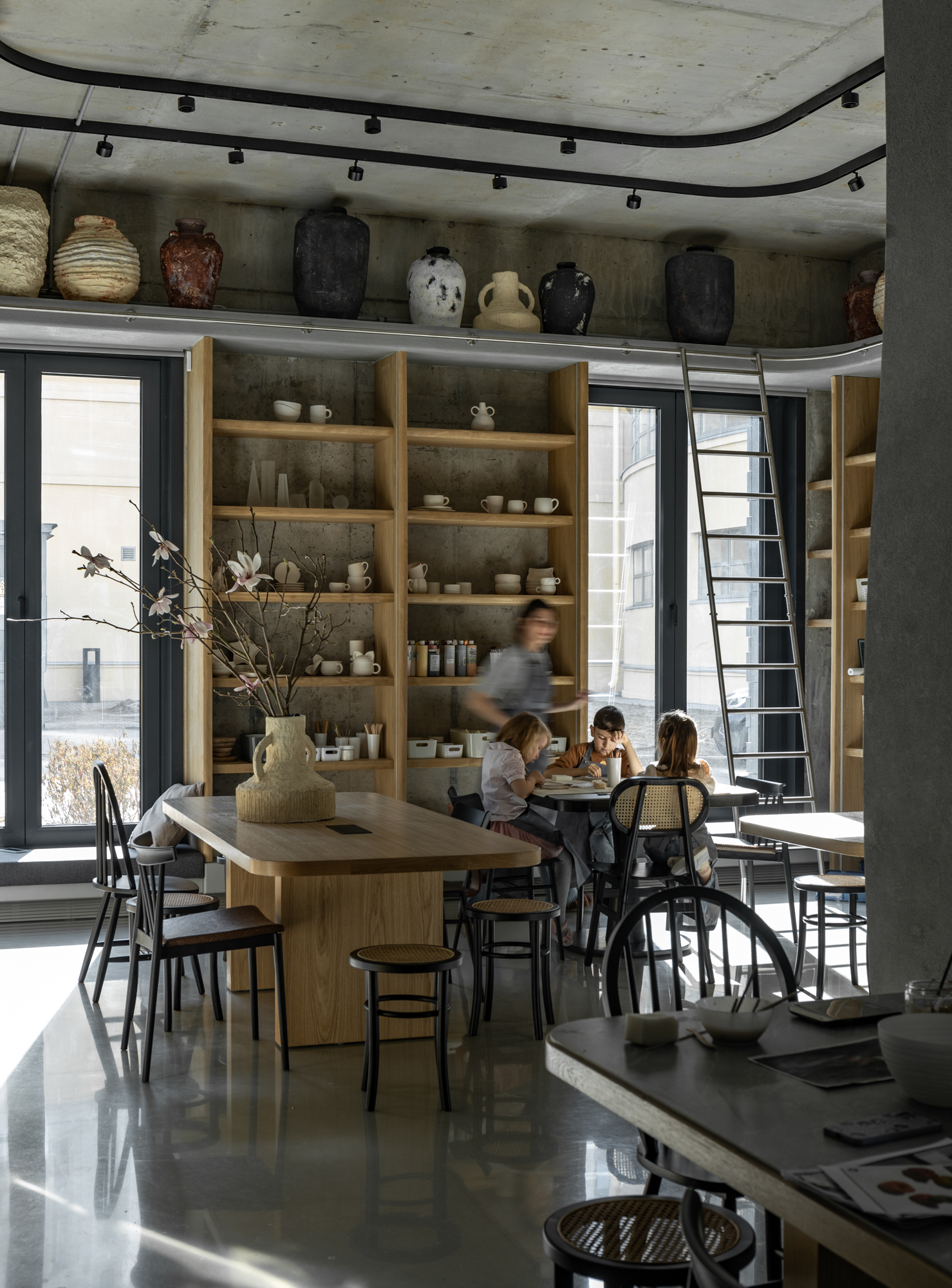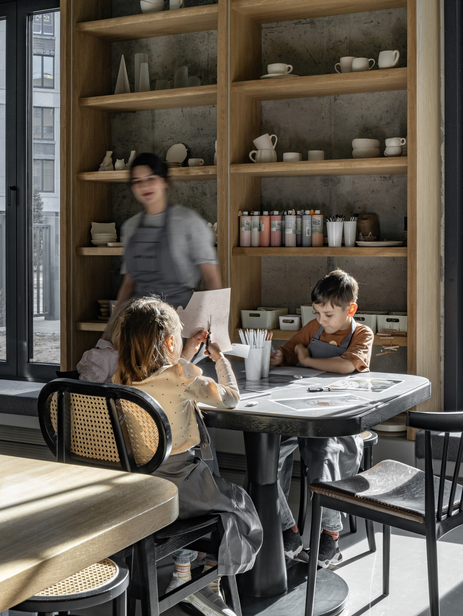 основе концепции проекта лежат мягкие, плавные формы, живые линии и натуральные материалы, позволяющие визуально передать ощущения от древнейшего гончарного ремесла и работы с глиной. Просторные светлые помещения с высокими потолками, залитые мягким дневным светом, проникающим сквозь большие окна, наполнены теплом и уютом. Задача пространства – наполнять людей вдохновением и творческой энергией, позволить замедлить течение времени и наслаждаться созданием красоты.