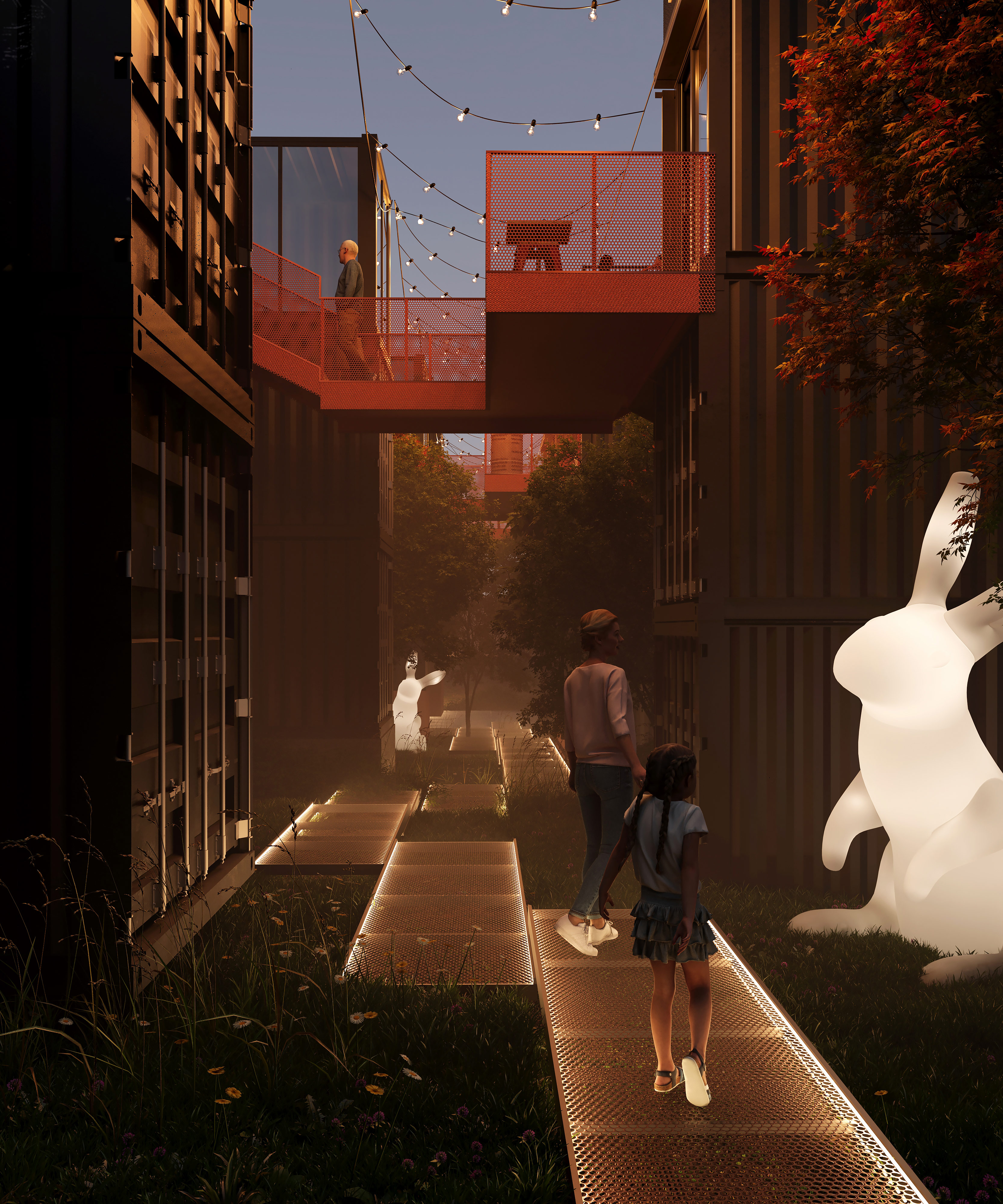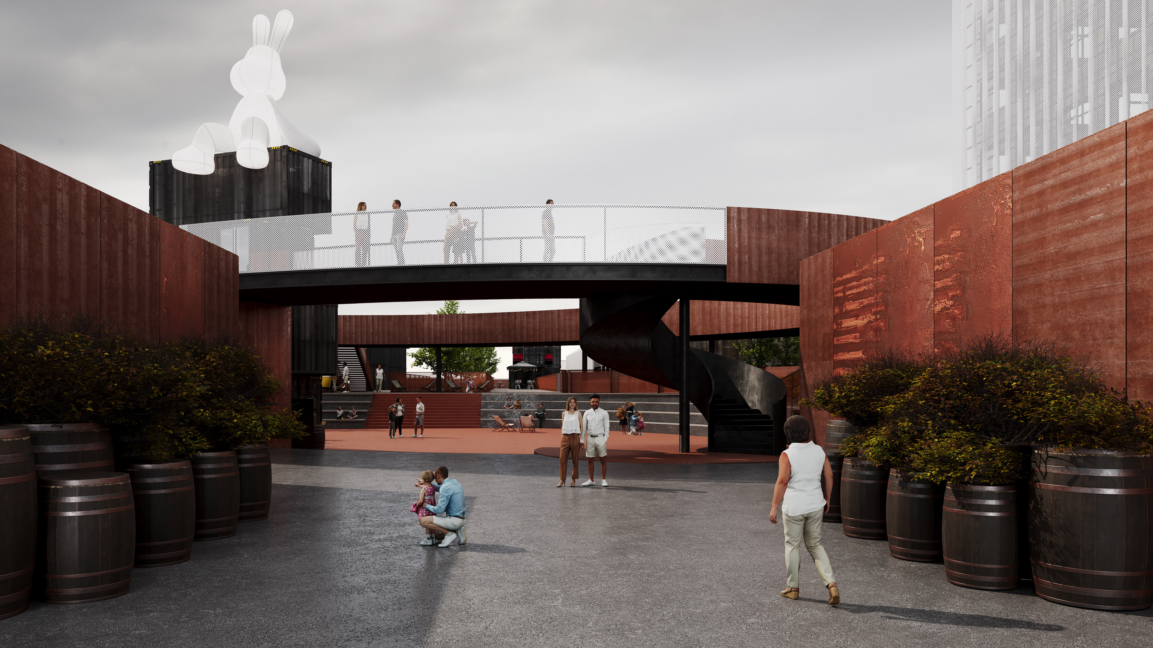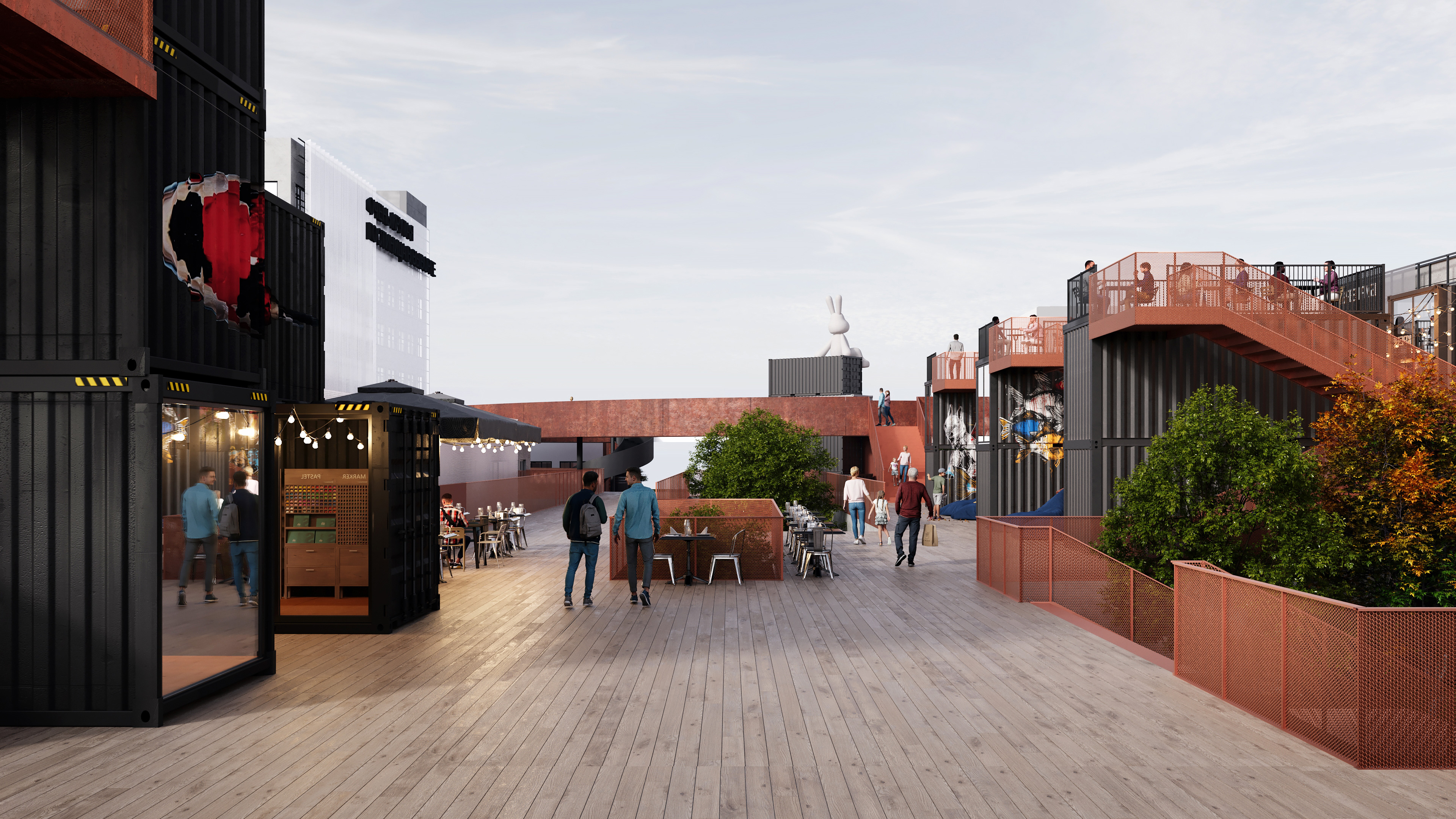 Морские контейнеры выступают в роли гибких модулей для стрит-фуда, поп-ап ритейла и творческих студий, предоставляя резидентам готовую платформу для реализации своих идей и выражения визуального манифеста в рамках кластера. Это не только дань портовому характеру Выборга, но и адаптивная платформа для бизнеса и творчества. Визуальный язык проекта строится на контрасте суровой промышленной палитры и современной архитектурной эстетики. Кортеновская сталь с рыжим оттенком окисленного металла применена в облицовке входной группы и эффектного видового кольца, парящего над основной площадью. Это доминанта, притягивающая взгляд и связывающая пространство воедино. Фасады промышленных корпусов одеты в «кольчугу» из металлической сетки. Она сохраняет объем зданий, придавая им современный технологичный облик.