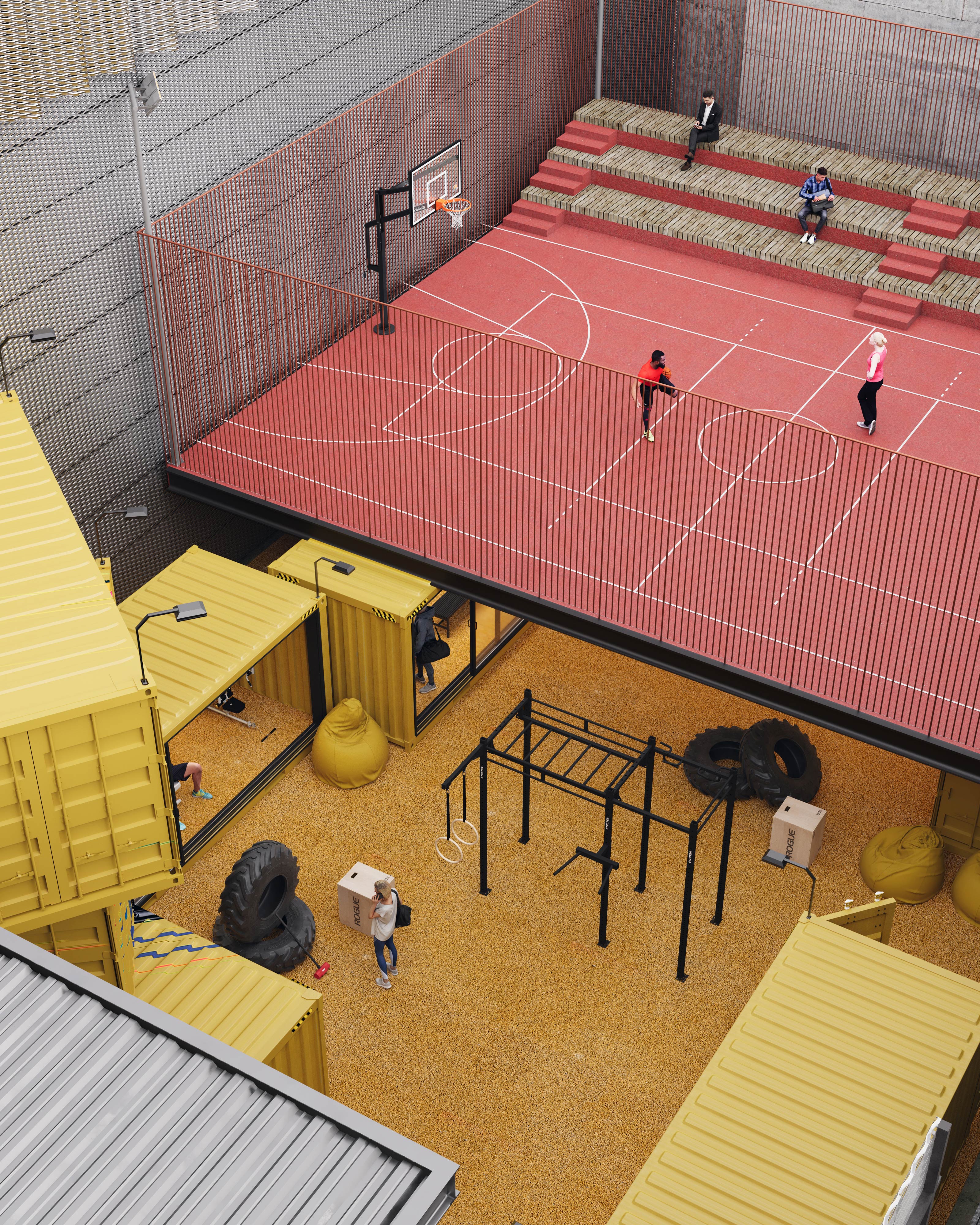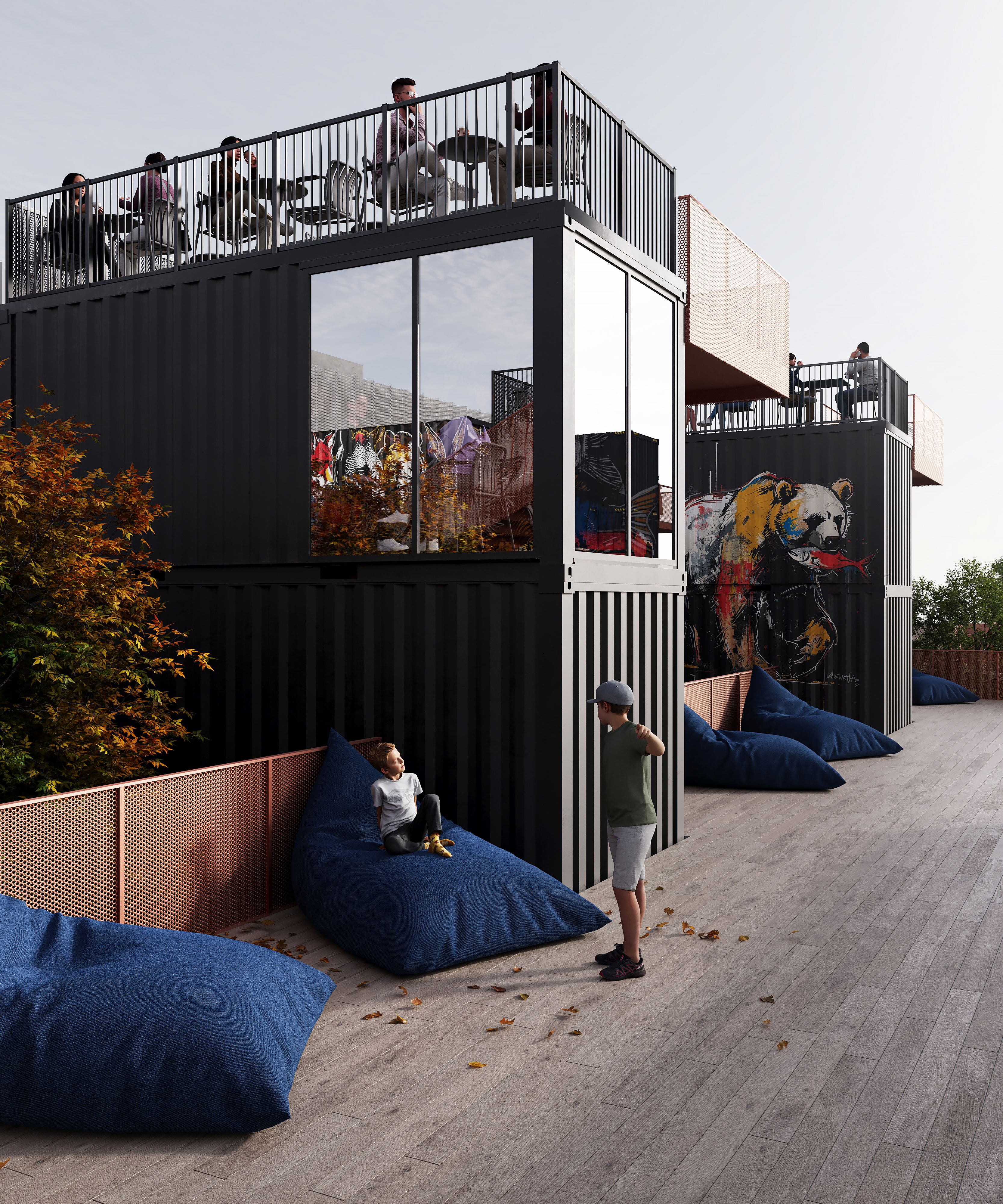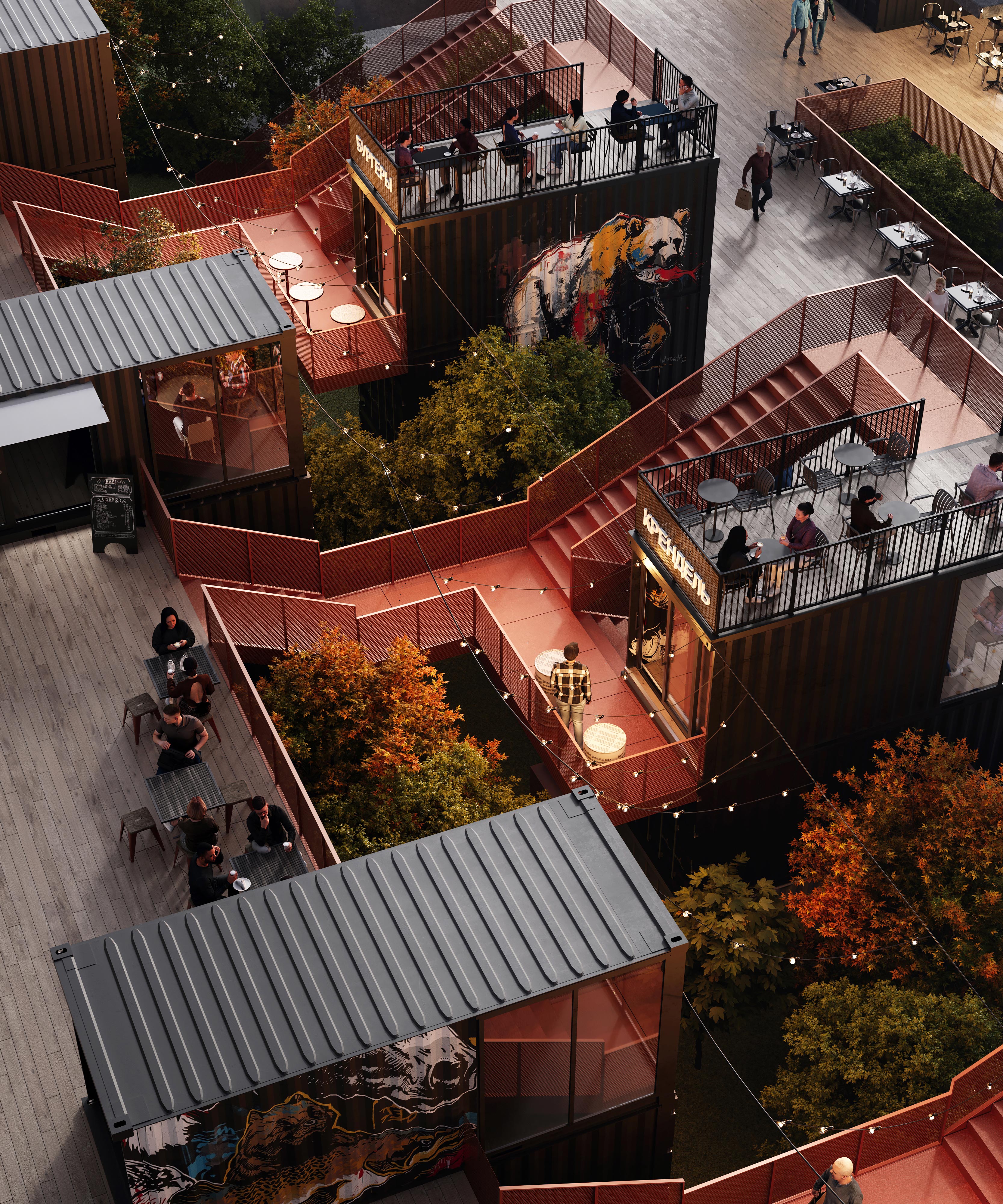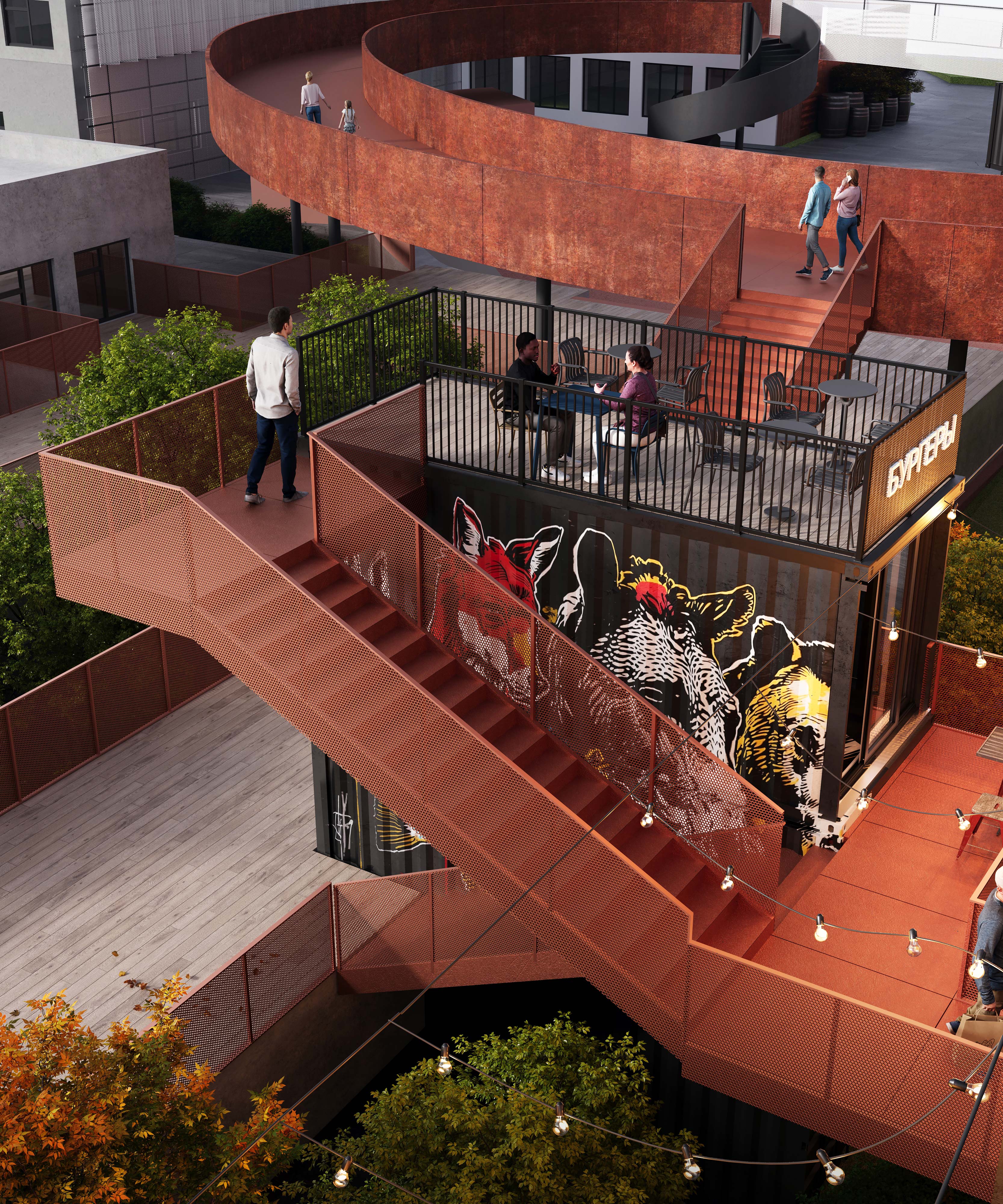 Морские контейнеры выступают в роли гибких модулей для стрит-фуда, поп-ап ритейла и творческих студий, предоставляя резидентам готовую платформу для реализации своих идей и выражения визуального манифеста в рамках кластера. Это не только дань портовому характеру Выборга, но и адаптивная платформа для бизнеса и творчества. Визуальный язык проекта строится на контрасте суровой промышленной палитры и современной архитектурной эстетики. Кортеновская сталь с рыжим оттенком окисленного металла применена в облицовке входной группы и эффектного видового кольца, парящего над основной площадью. Это доминанта, притягивающая взгляд и связывающая пространство воедино. Фасады промышленных корпусов одеты в «кольчугу» из металлической сетки. Она сохраняет объем зданий, придавая им современный технологичный облик.